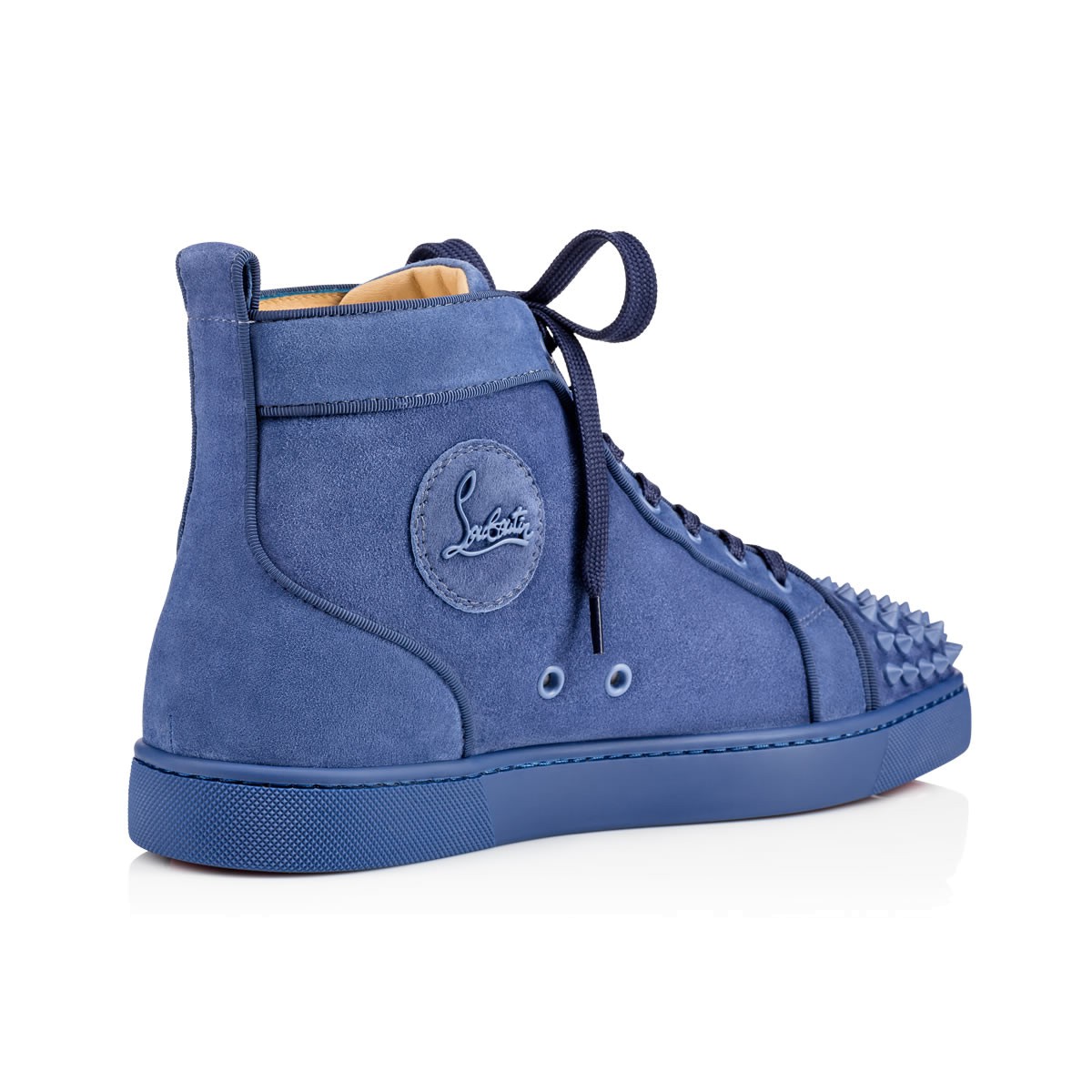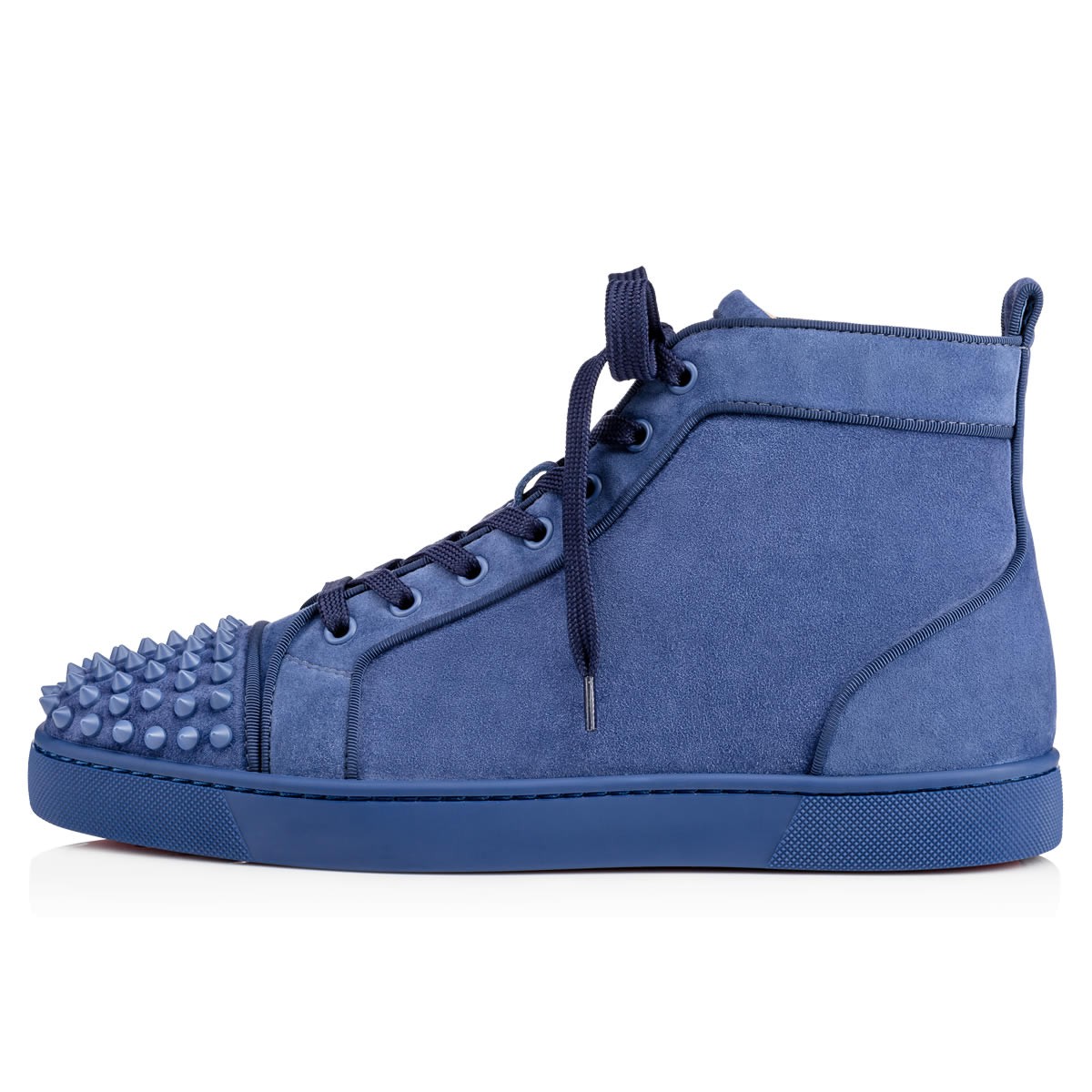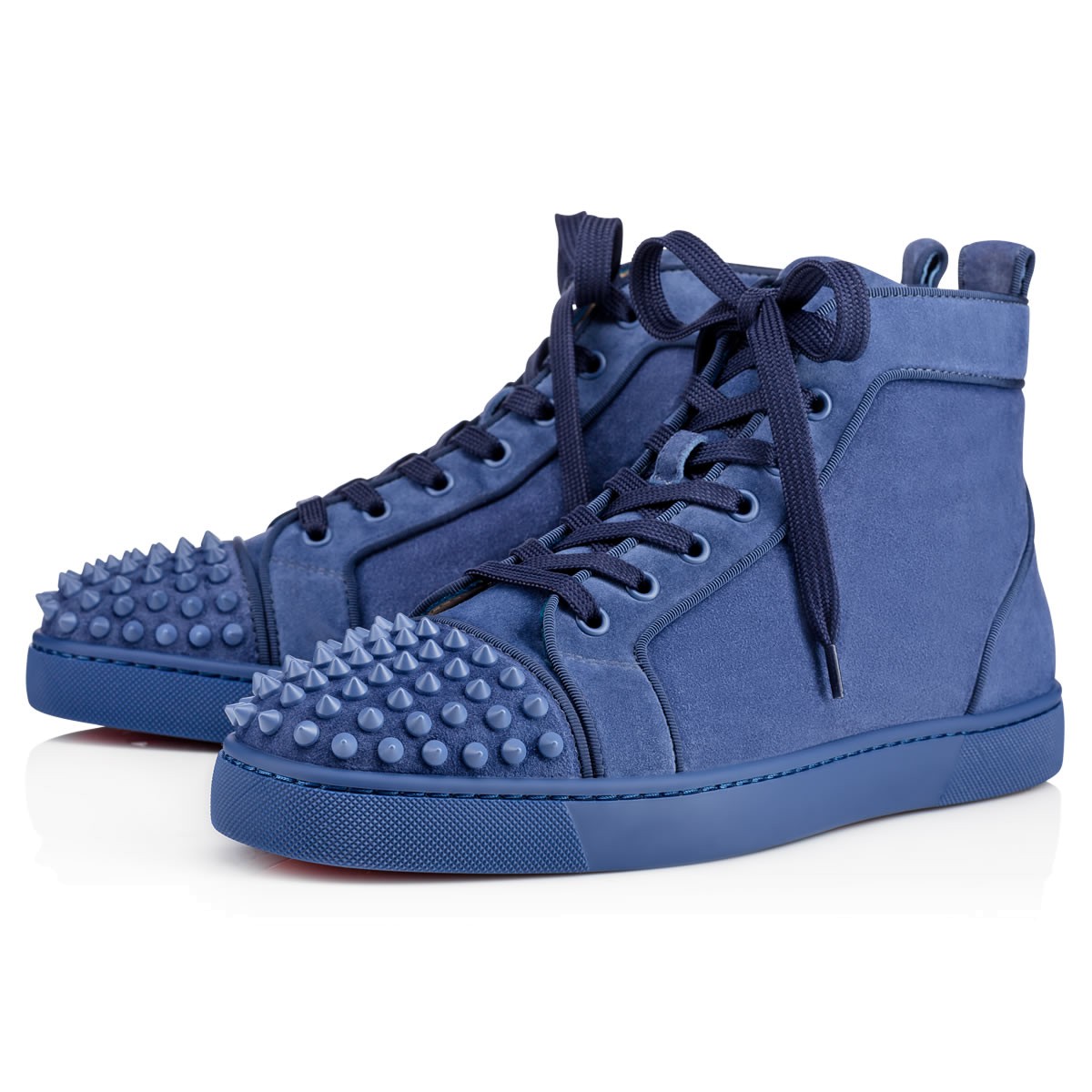 Update your red sole sneaker collectsion with “Lou Spikes Flat” in dreamy orage suede. This coveted Louboutin hightop silhouette makes an irresistible addition to your casual looks.
