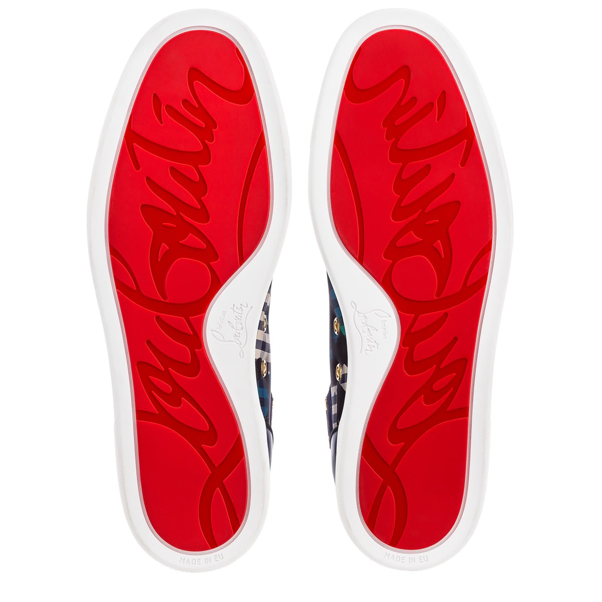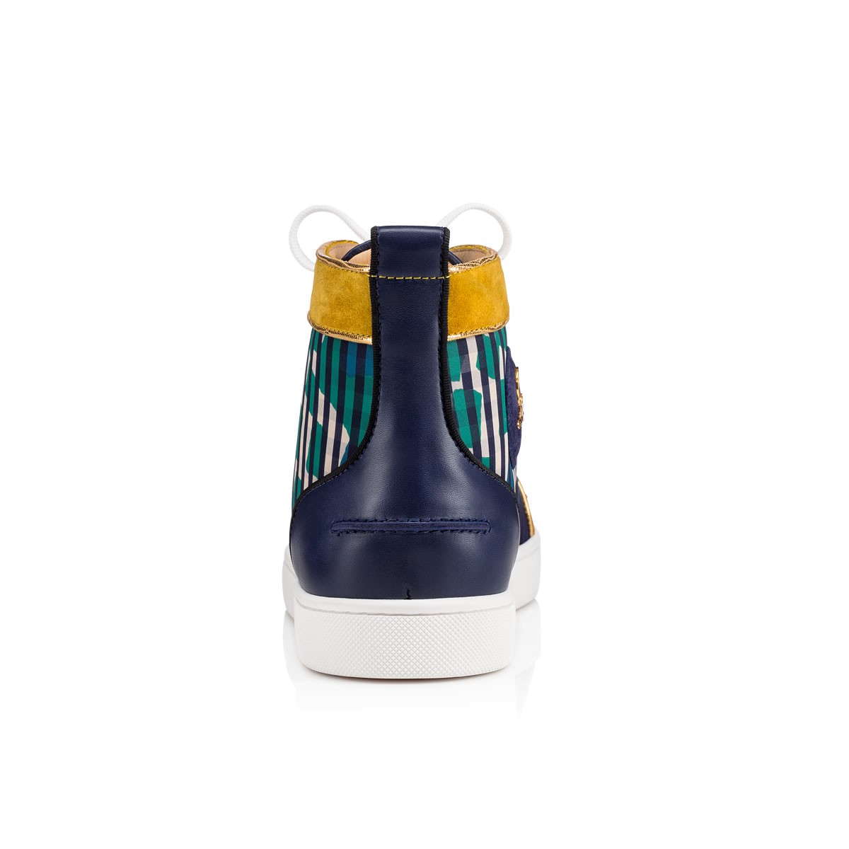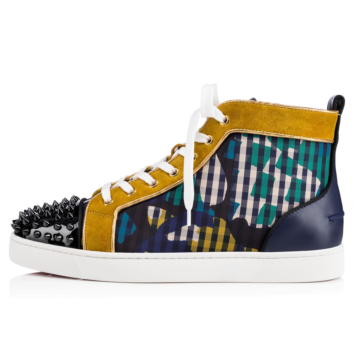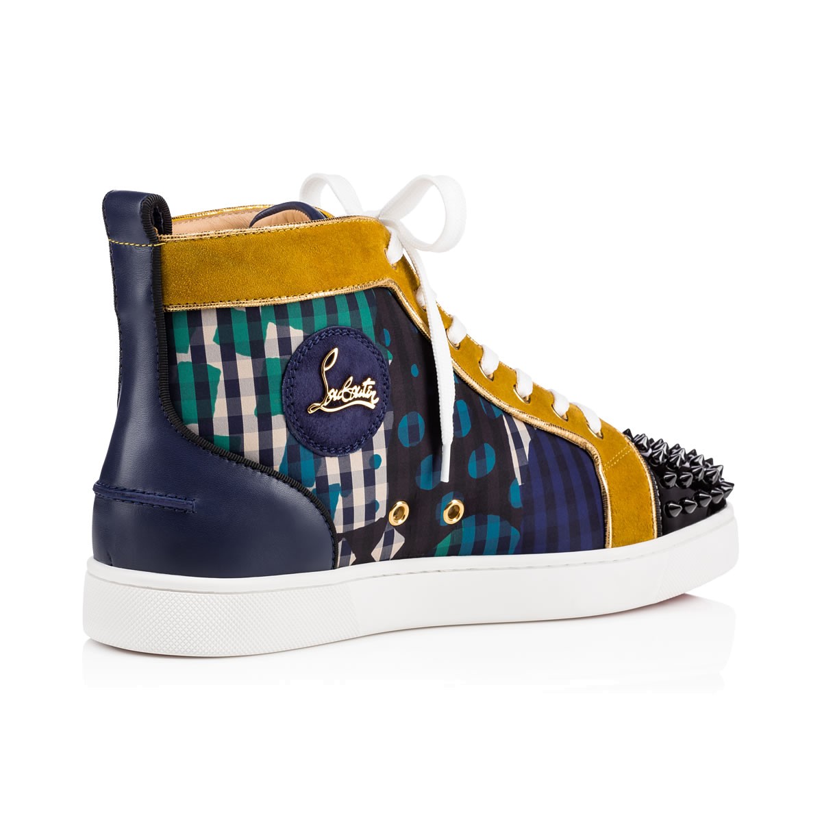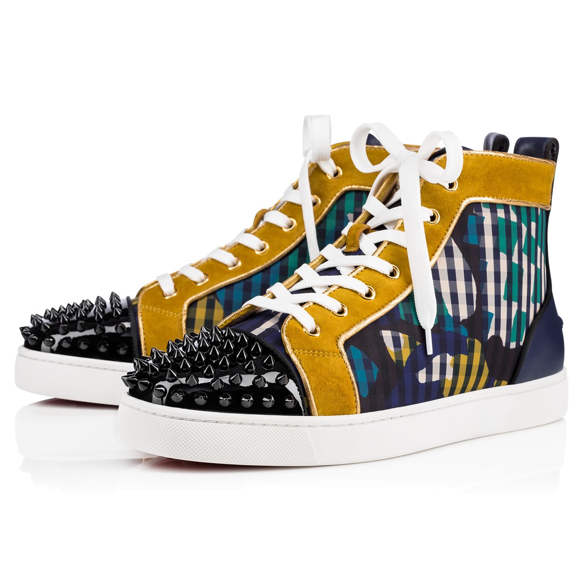 Update your red sole sneaker collectsion with “Lou Spikes Orlato” in ’60s print gingham with multicolored trim and a black patent leather spiked toe box. This coveted Louboutin hightop makes an irresistible addition to your casual looks.