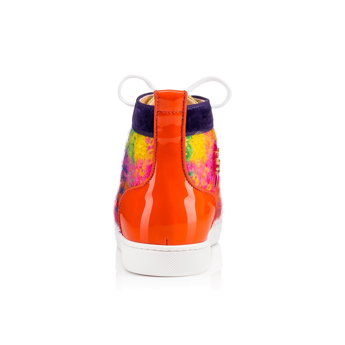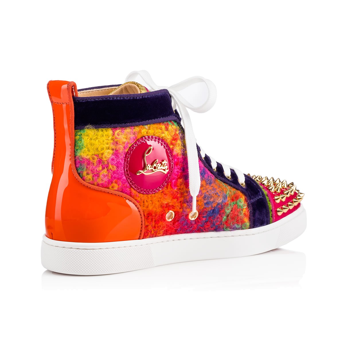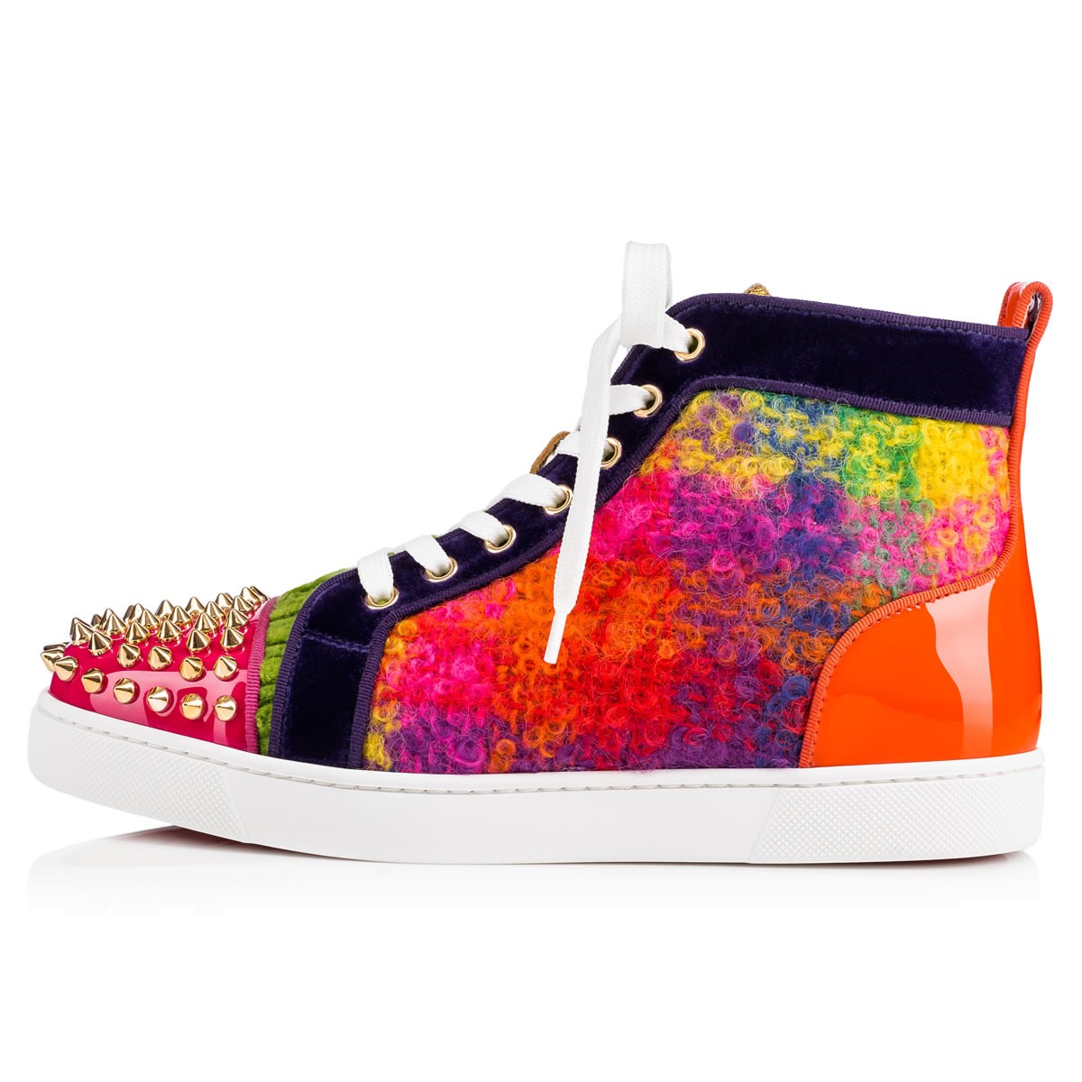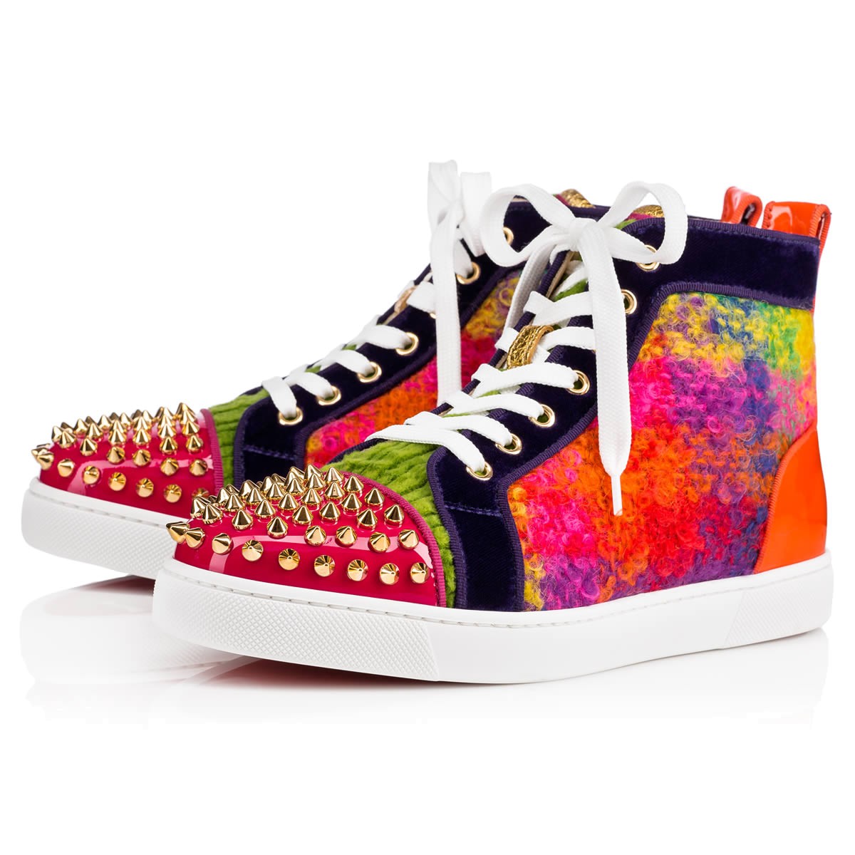 Reinvent your casual style in “Lou Spikes Woman Flat”. With a silhouette that is borrowed from the boys, this iconic spiked hightop in multicolored Scottish bouclette wool and plush biscuit velvet is a vibrant Fall/Winter go-to.