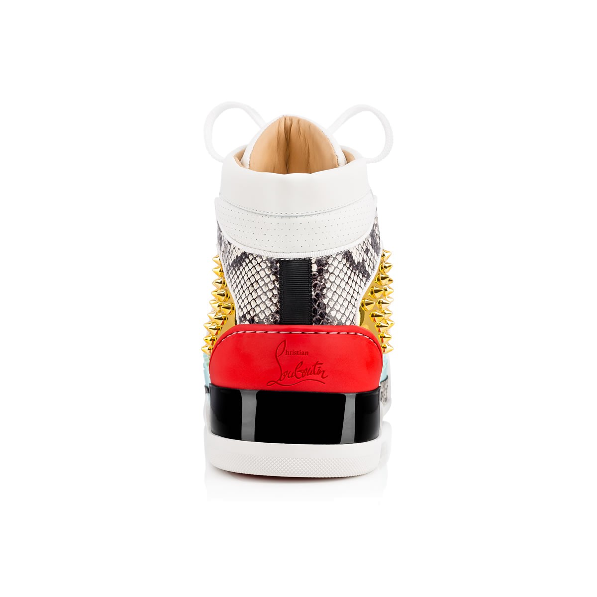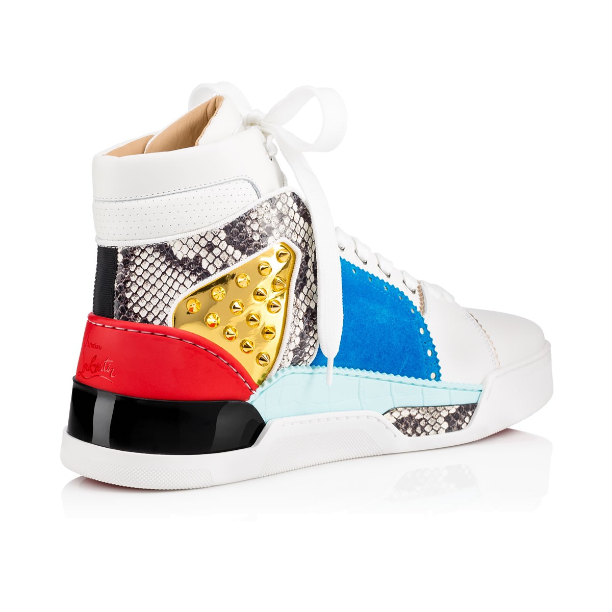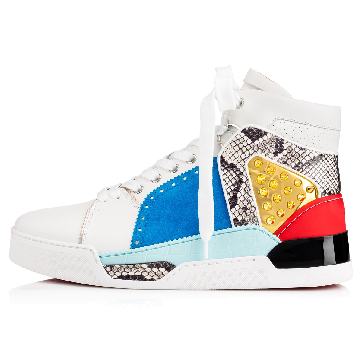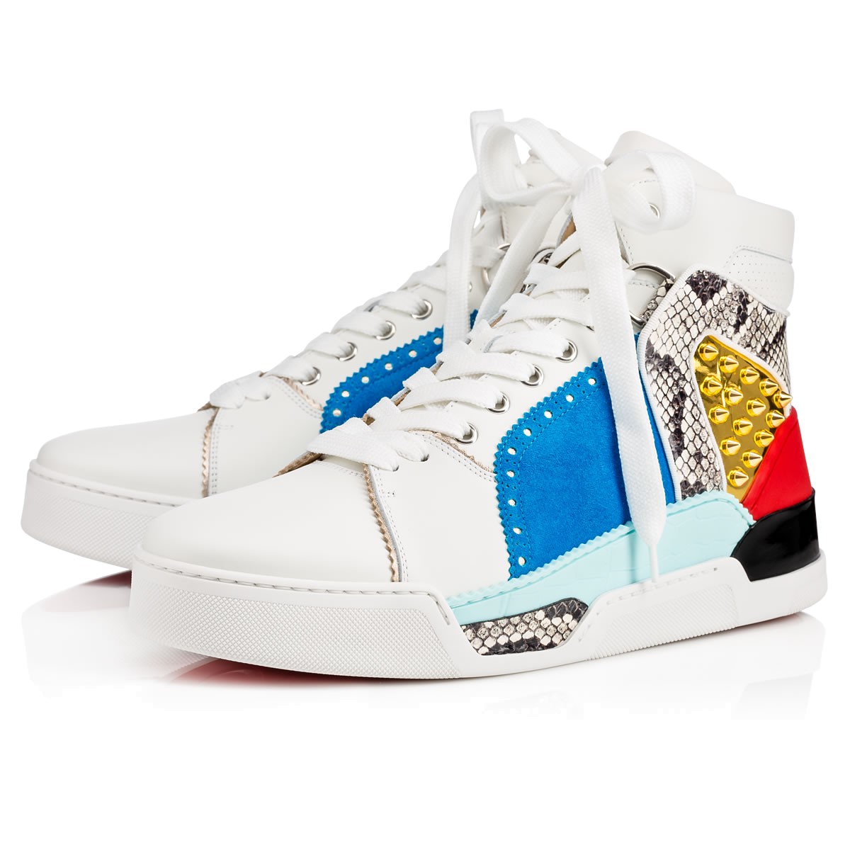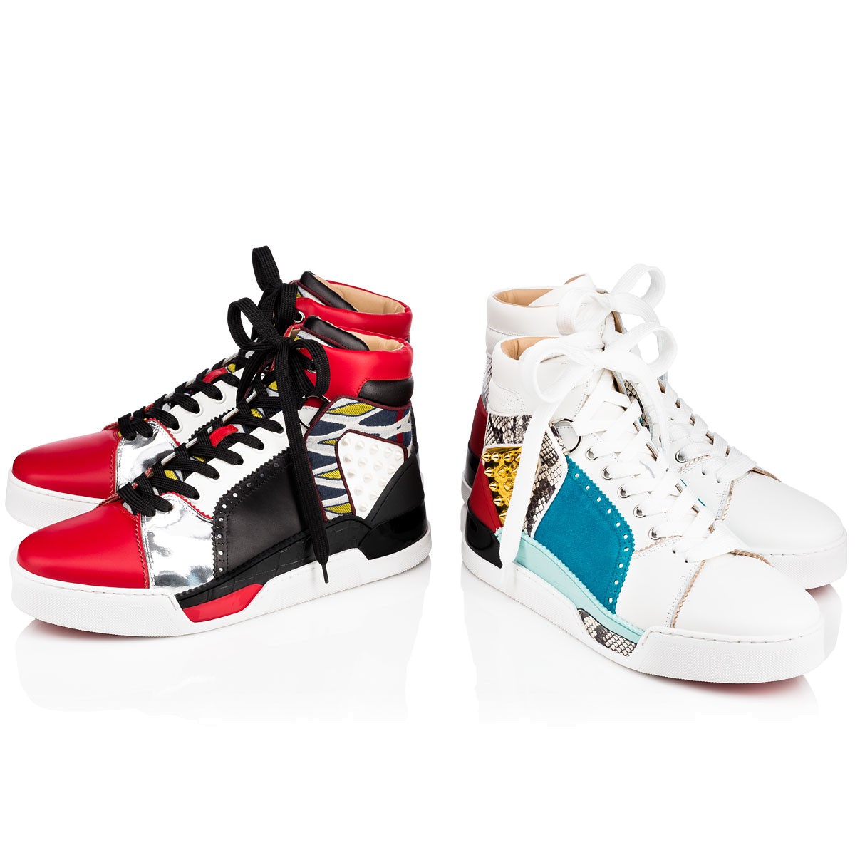 Introducing “Loubikick”, the newest member of the Louboutin sneaker line-up. This exclusive CL hightop style with luxurious multi-material layers takes inspiration from the ’90s basketball shoe. In a multicolored leather and suede mix with roccia watersnake trim, this pair is expertly crafted for style performance.