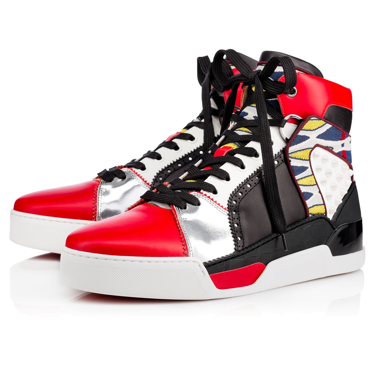 Introducing “Loubikick”, the newest member of the Louboutin sneaker line-up. This exclusive CL hightop style with luxurious multi-material layers takes inspiration from the ’90s basketball shoe. In a multicolored leather mix with ’tissu boubou’ trim, this pair is expertly crafted for style performance.