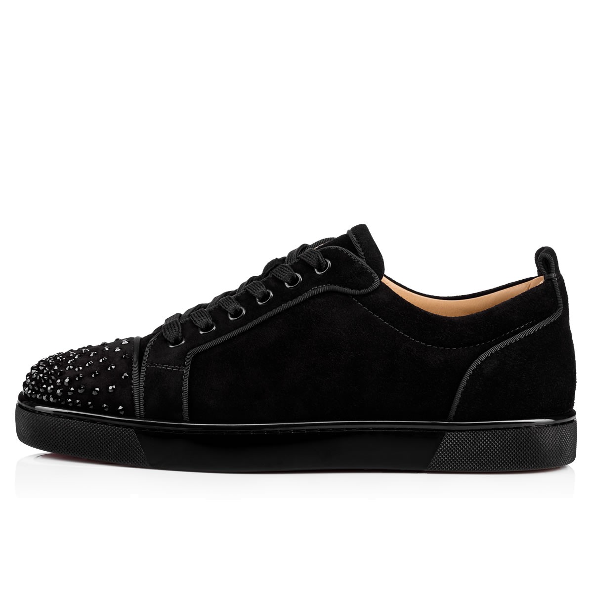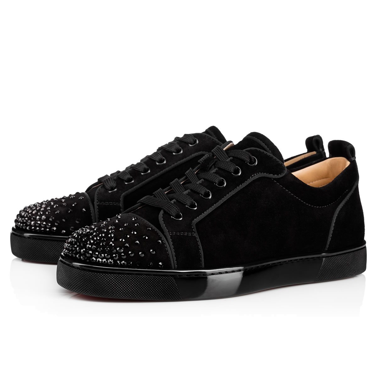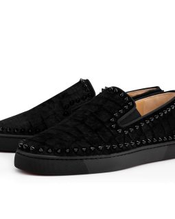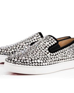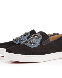 For those who prefer to keep a low profile, “Louis Junior Degra Flat” is your gateway into the world of Louboutin. In smooth black suede with a Swarovski crystal dégradé at the toe box, this signature lowtop adds a little sparkle to your step.