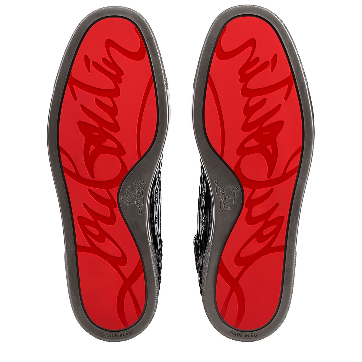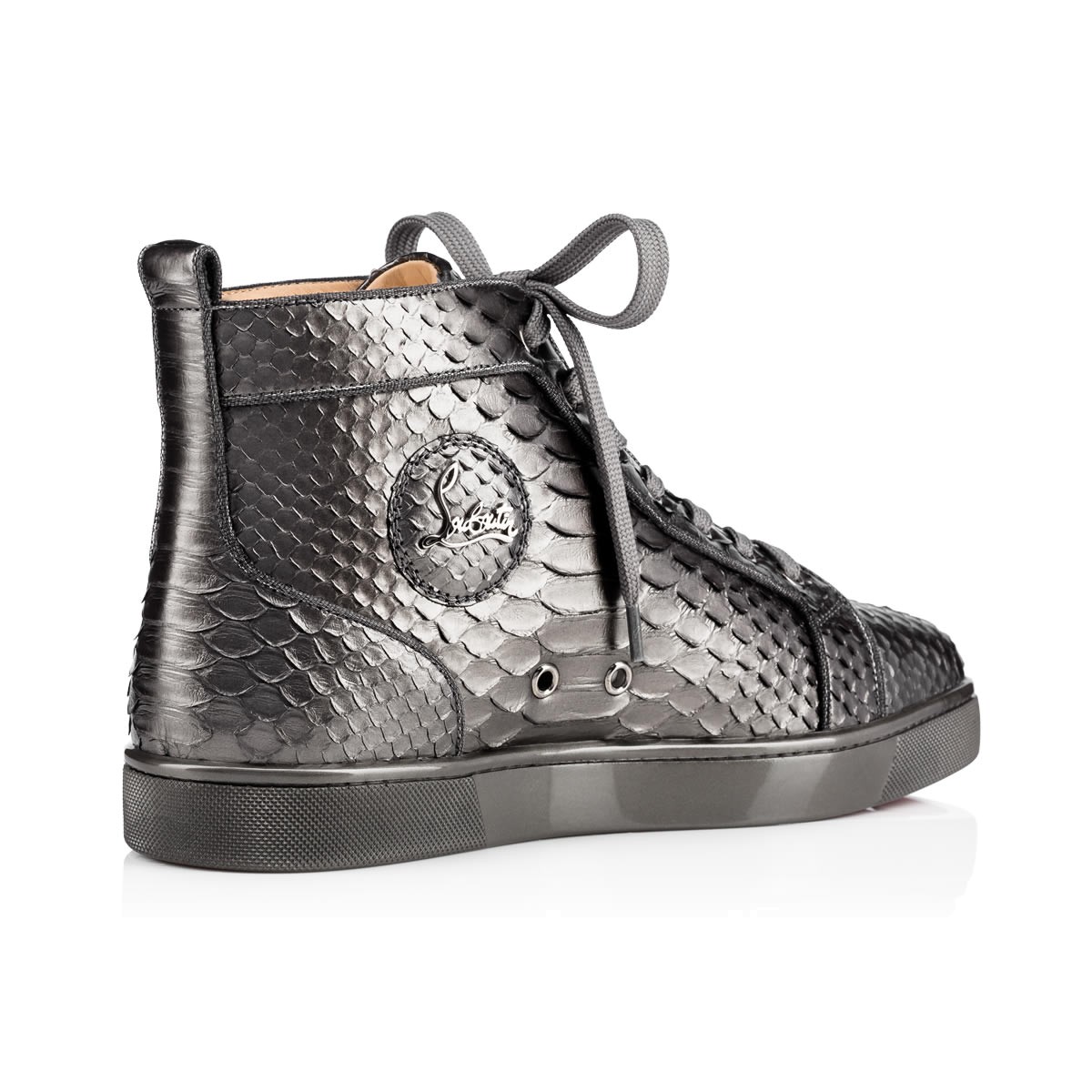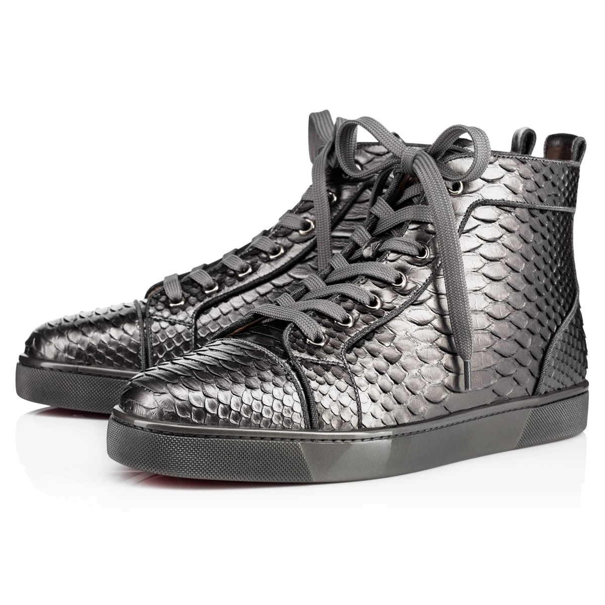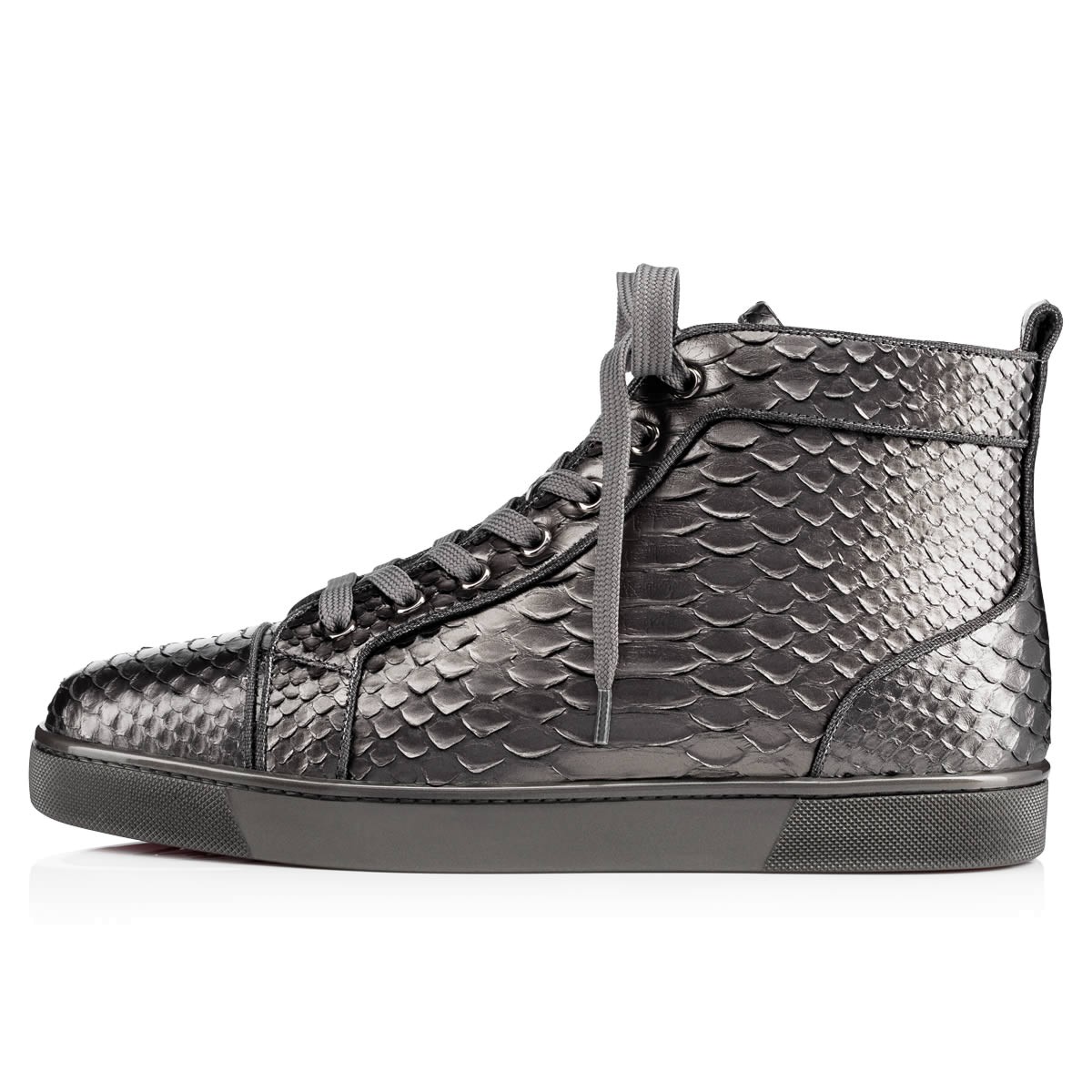 “Louis Orlato’s” piping detail brings a refined touch to this beloved red sole hightop. In a luxurious anthracite metallic python, this signature sneaker gives your look a luxurious foundation.