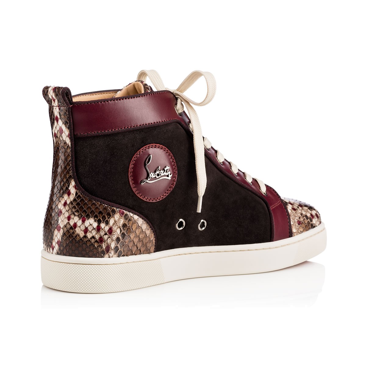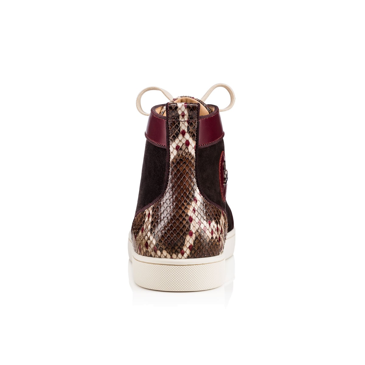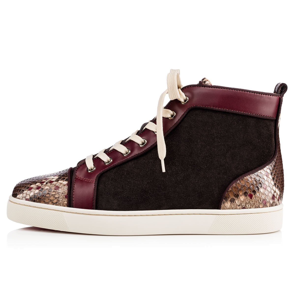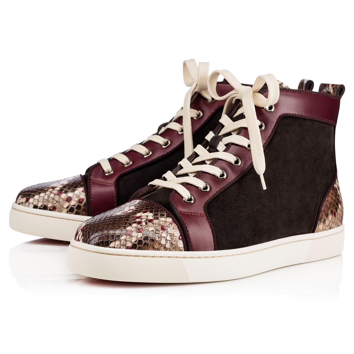 “Louis Orlato’s” piping detail brings a refined touch to this beloved red sole hightop. In a polished mix of merlot suede and leather with hand painted venomous python, this signature sneaker gives your look a luxurious foundation.