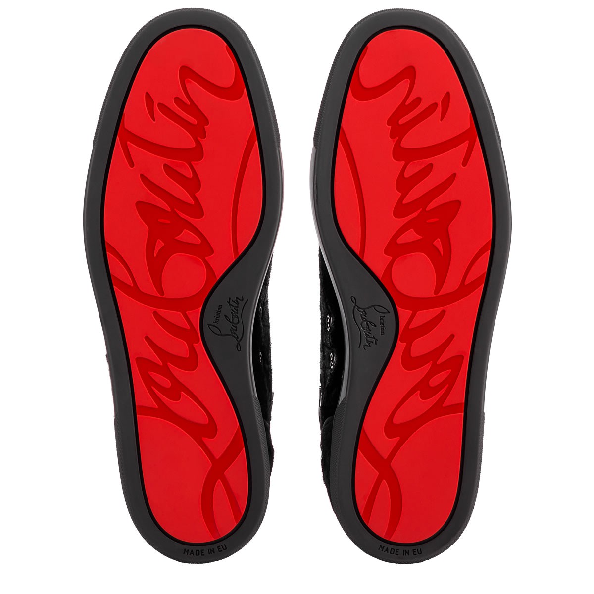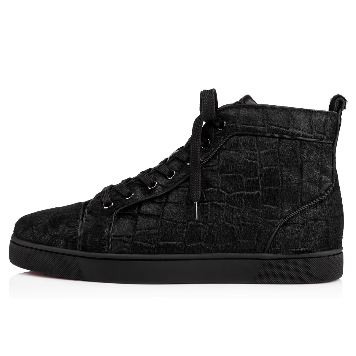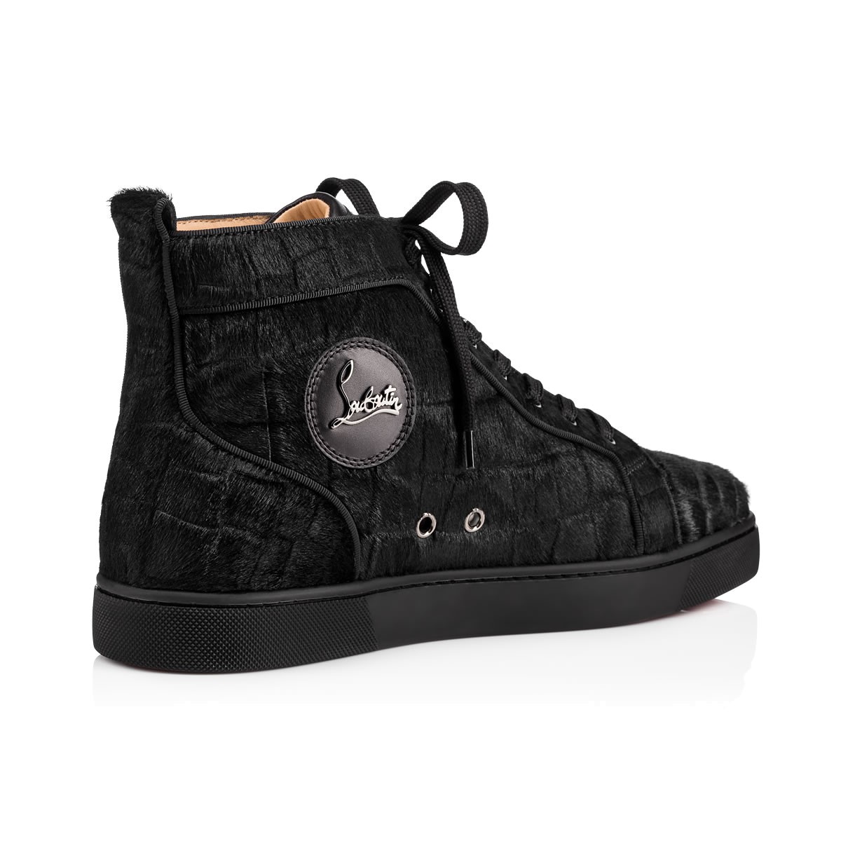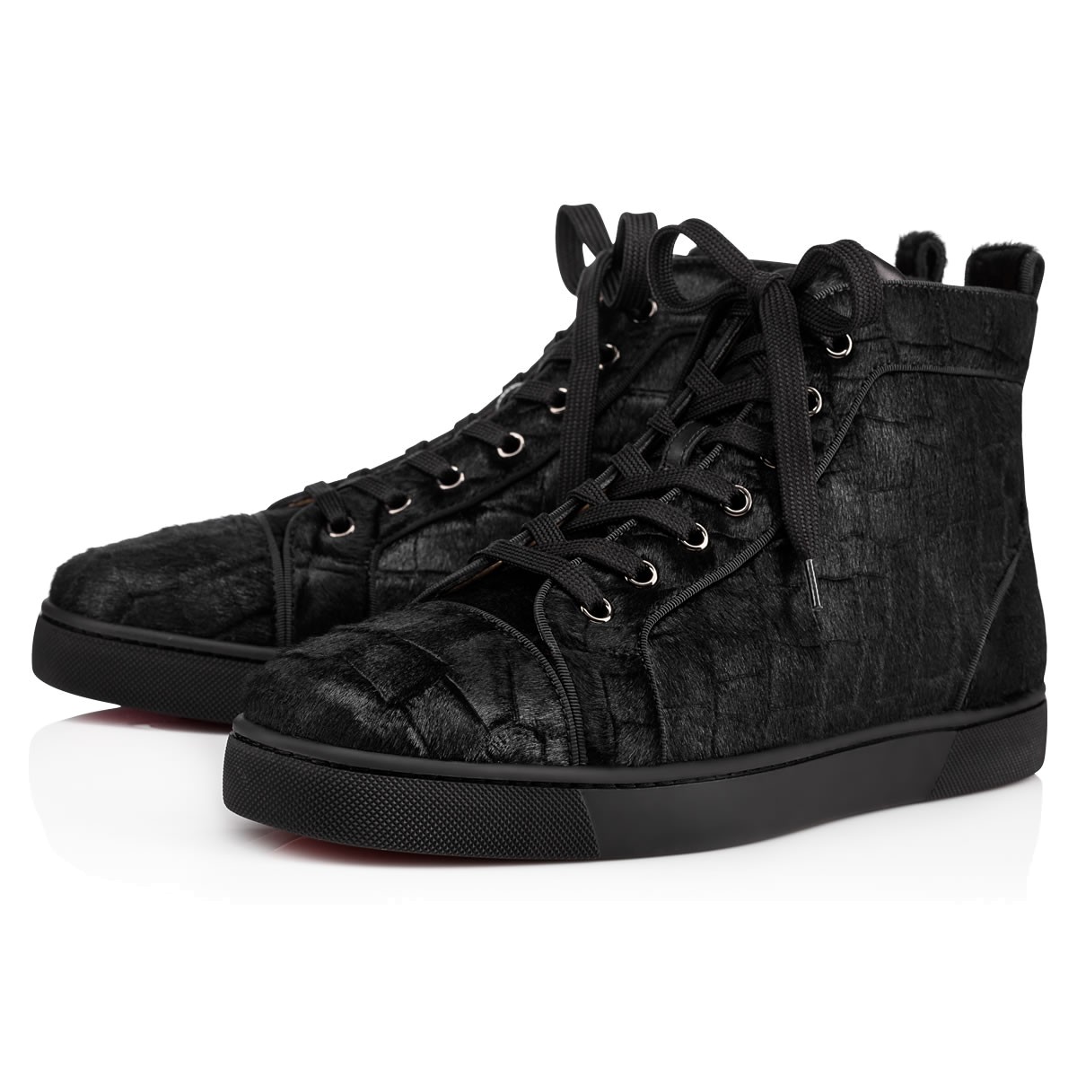 “Louis Orlato’s” piping detail brings a refined touch to this beloved red sole hightop. In black embossed crocodile print pony hair, this signature sneaker gives your look a luxurious foundation.