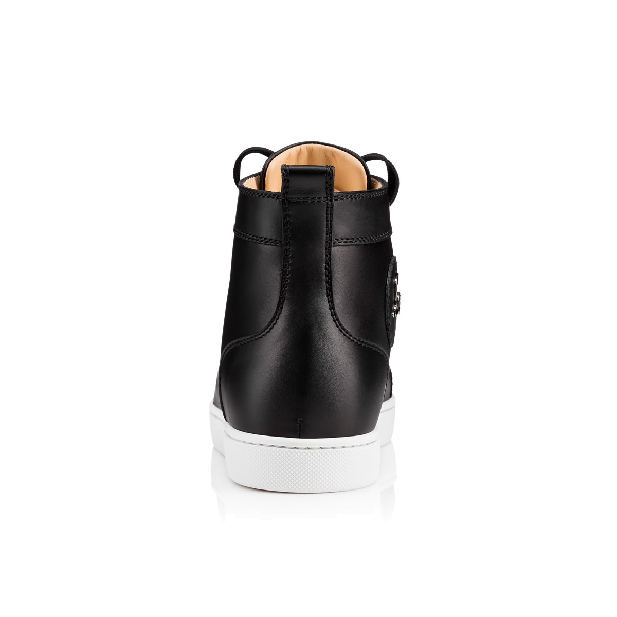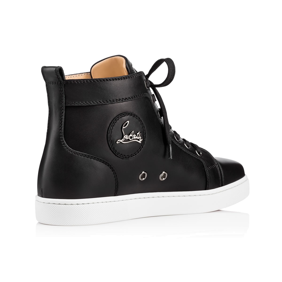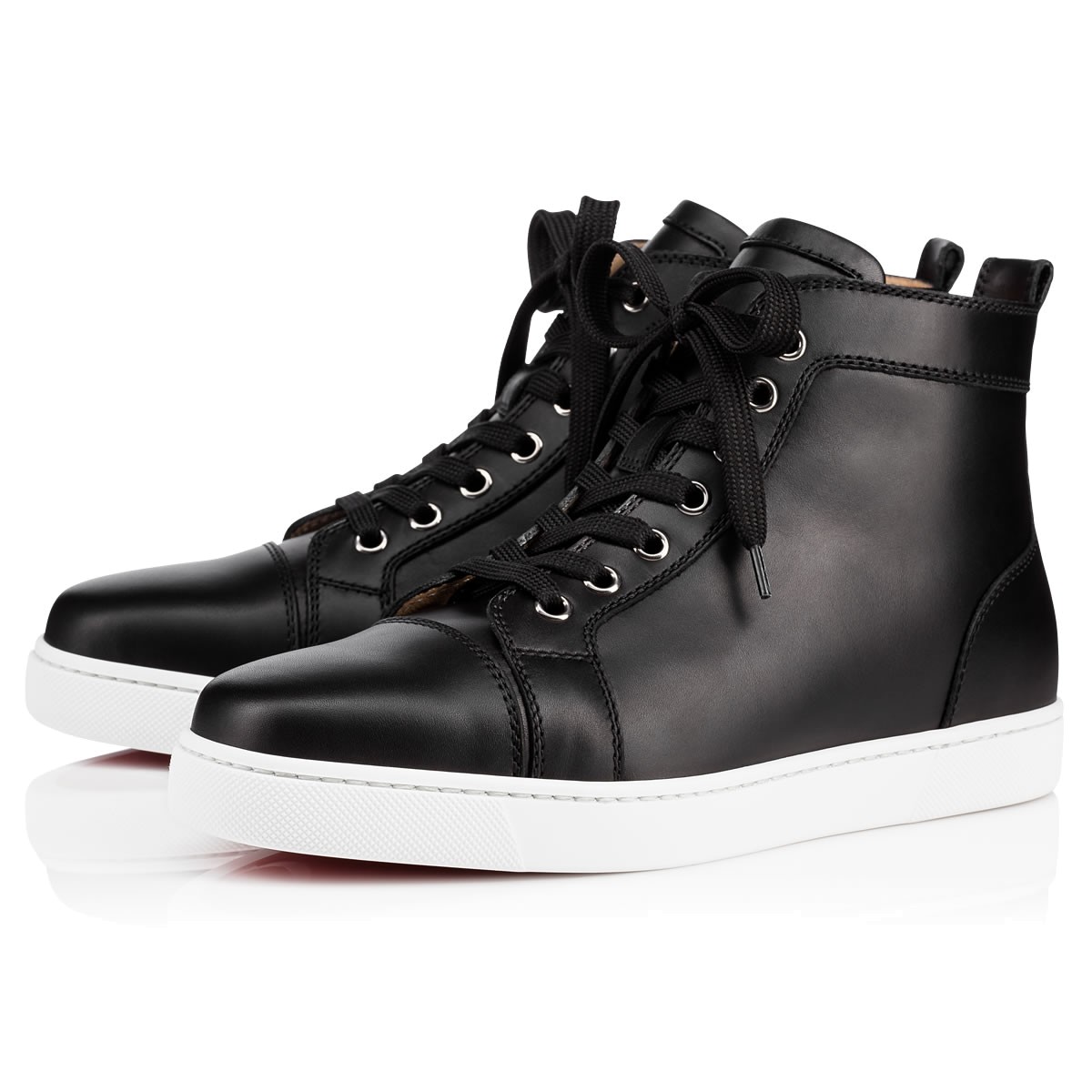 “Louis Woman Flat” is a signature Louboutin sneaker for the sporty sort. In smooth black leather, this iconic style is your anytime go-to.