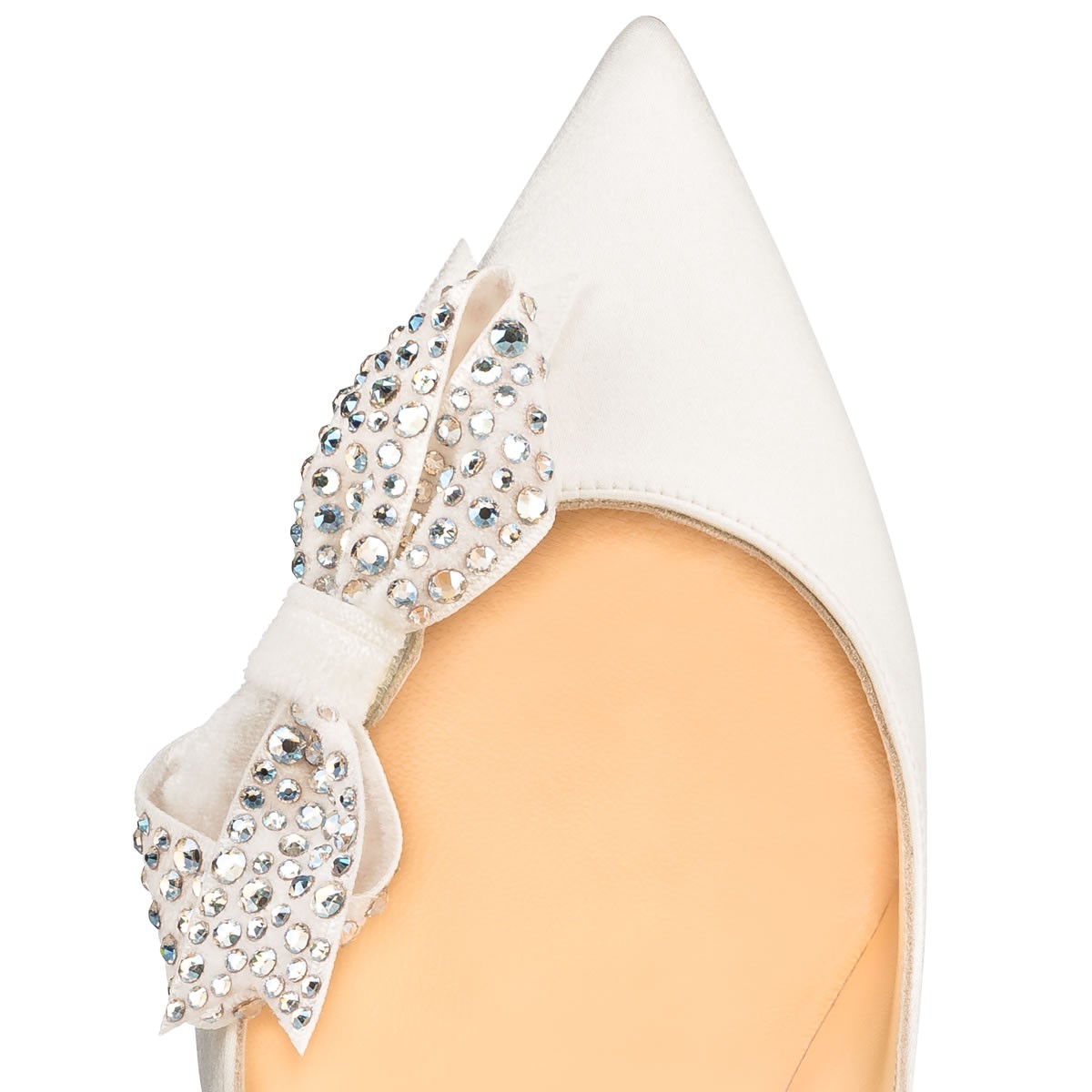“Madame Menule” is like a dream come true. Perfectly feminine, this pointed-toe pump features a slender 100mm stiletto heel and a signature handmade crystal-encrusted Loubi bow accessory. In off-white crepe satin, she is a timeless bridal shoe.