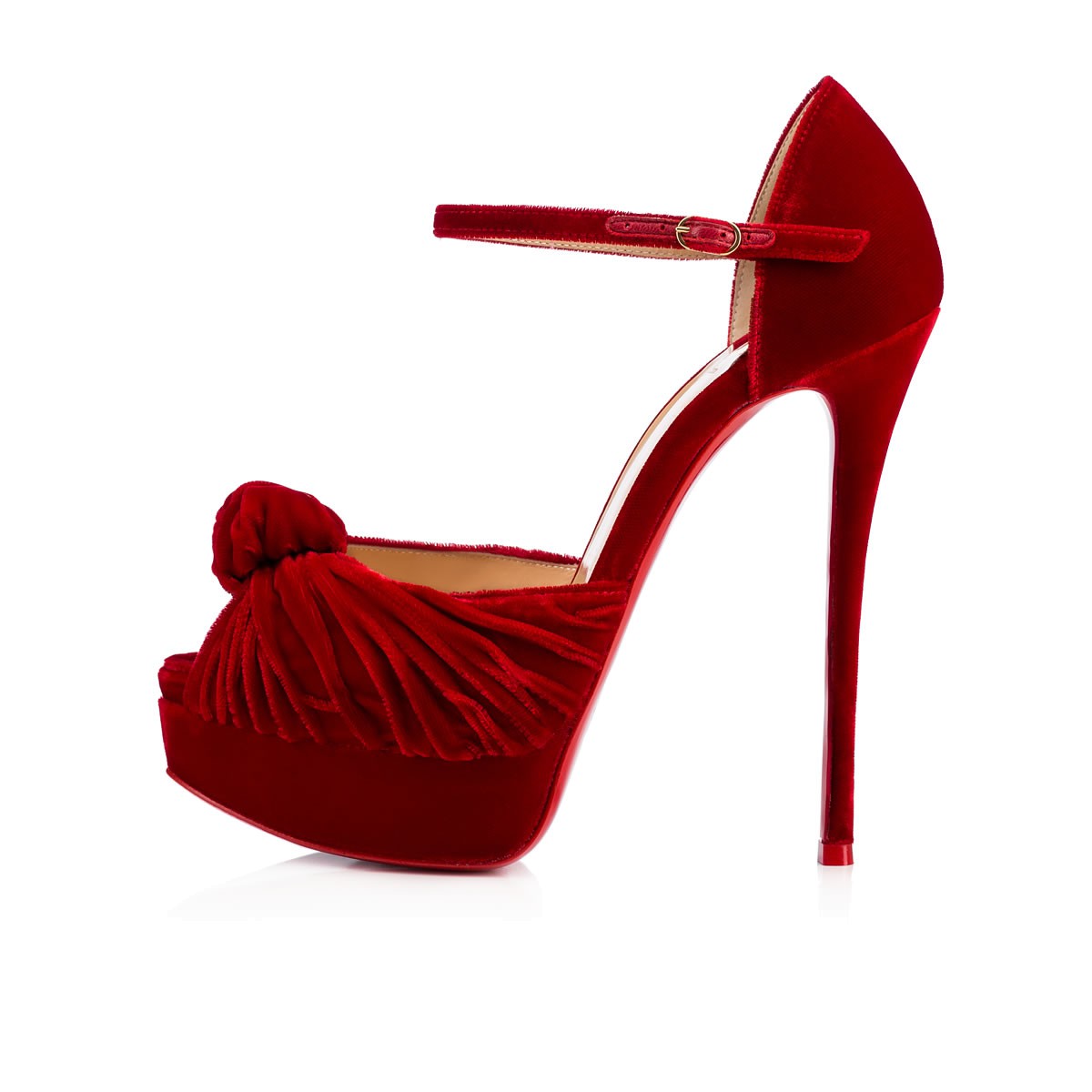 “Marchavekel” employs a couture draping technique to create the elegant folds and turban knot. In rosso velvet, this 140mm platform sandal presents the foot with impeccable grace.