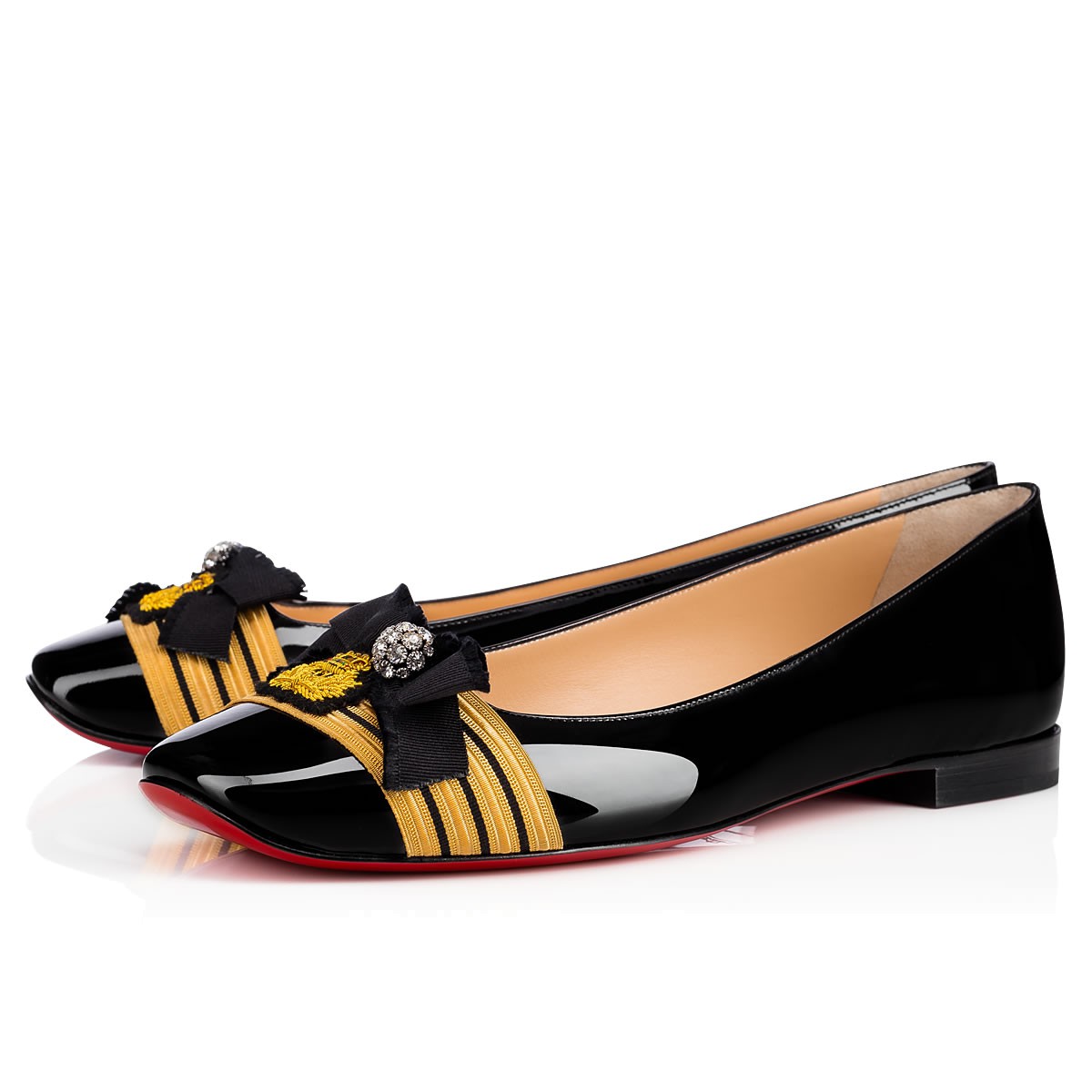 Earn your style stripes in “Militar Flat”. This black patent leather flat is decorated in a distinguished ribbon and Louboutin logo2 crest patch, and finished with a black grosgrain bow and a Swarovski crystal sphere pendant.