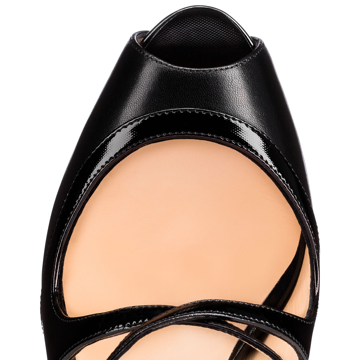 “Mira Bella” is a new classic for Fall/Winter. Featuring a hidden platform and slender 100mm heel, this cross-strap peep toe sandal in lustrous black leather and vinyl effect patent provides a manageable boost of height- perfect for the dance floor.