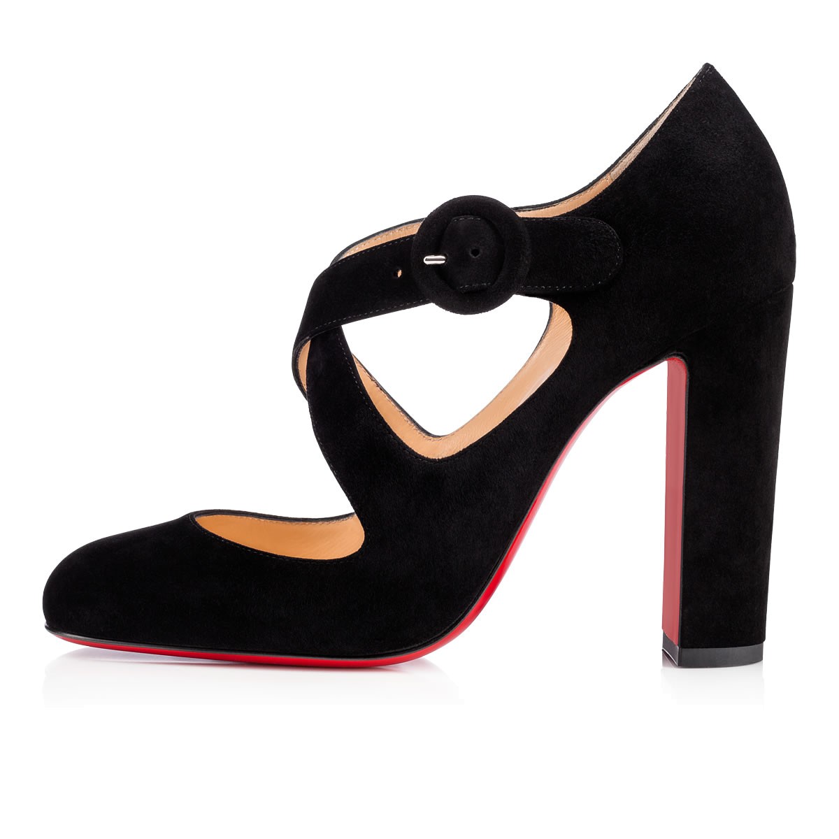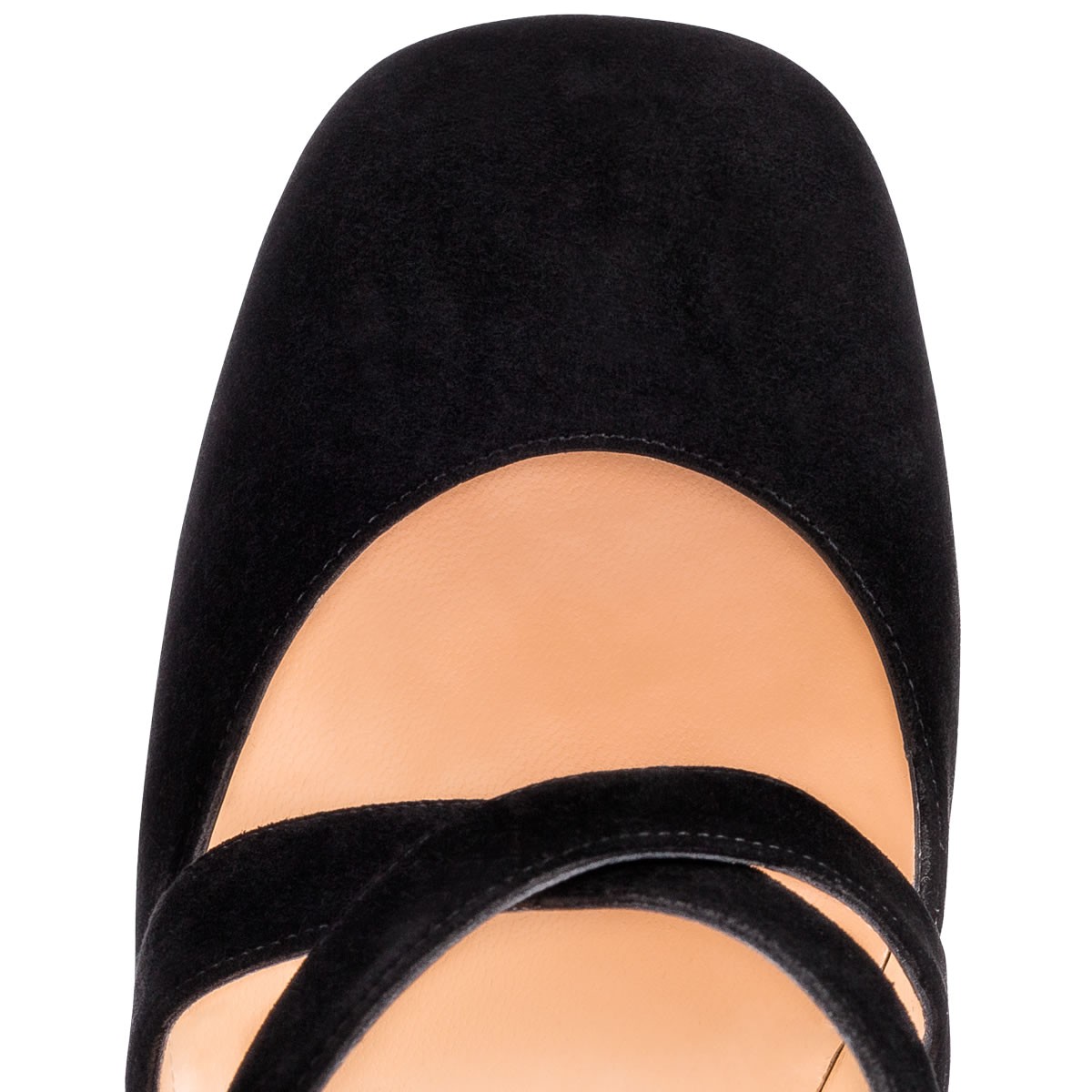 With broad cross straps and a 100mm block heel, “Miss Ellen” is an updated silhouette for the contemporary demoiselle. In smooth black suede, this lovely round toe pump completes your look through the workday into evening.