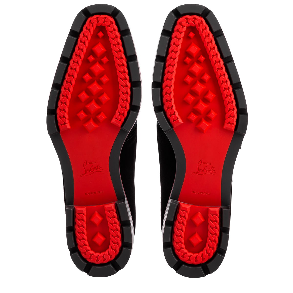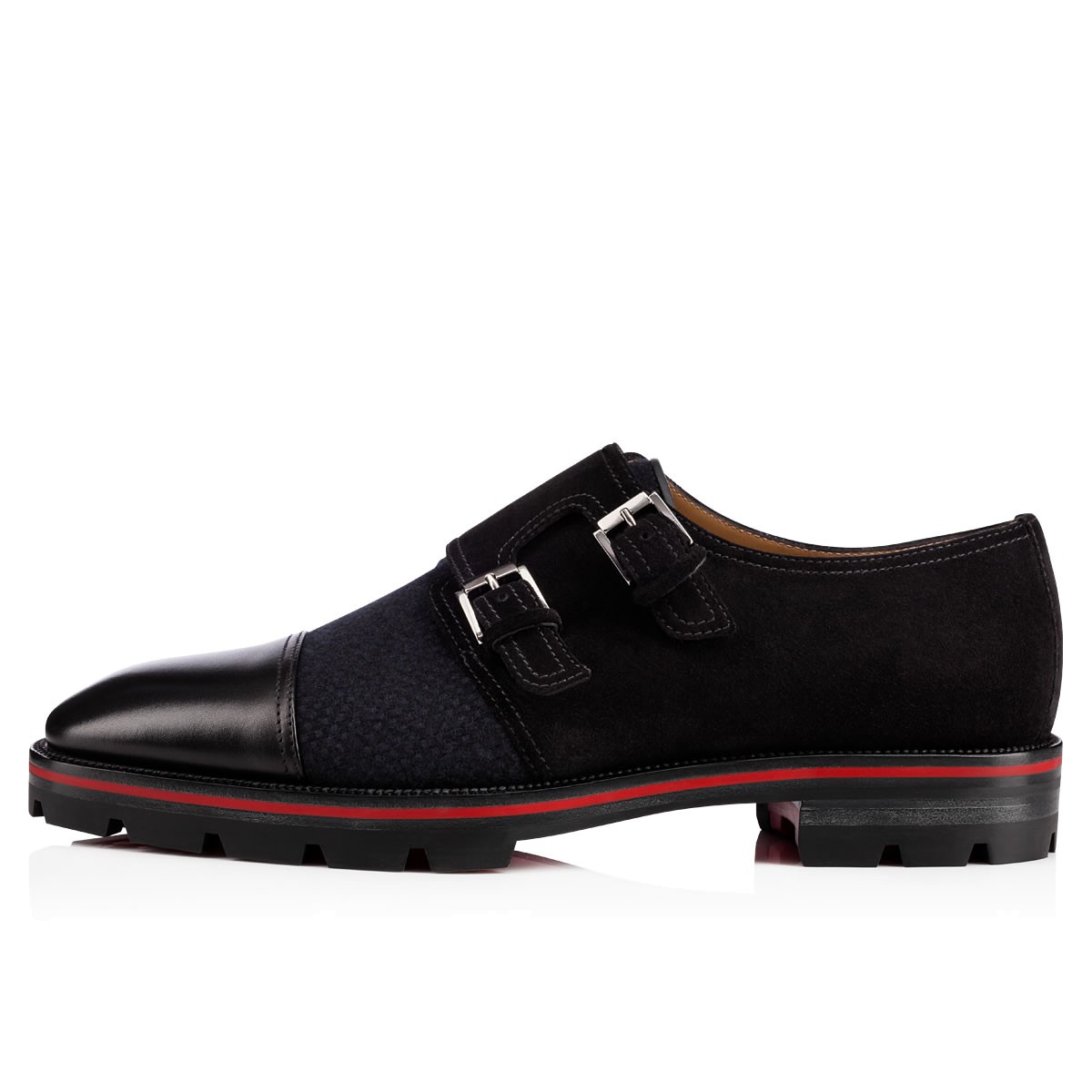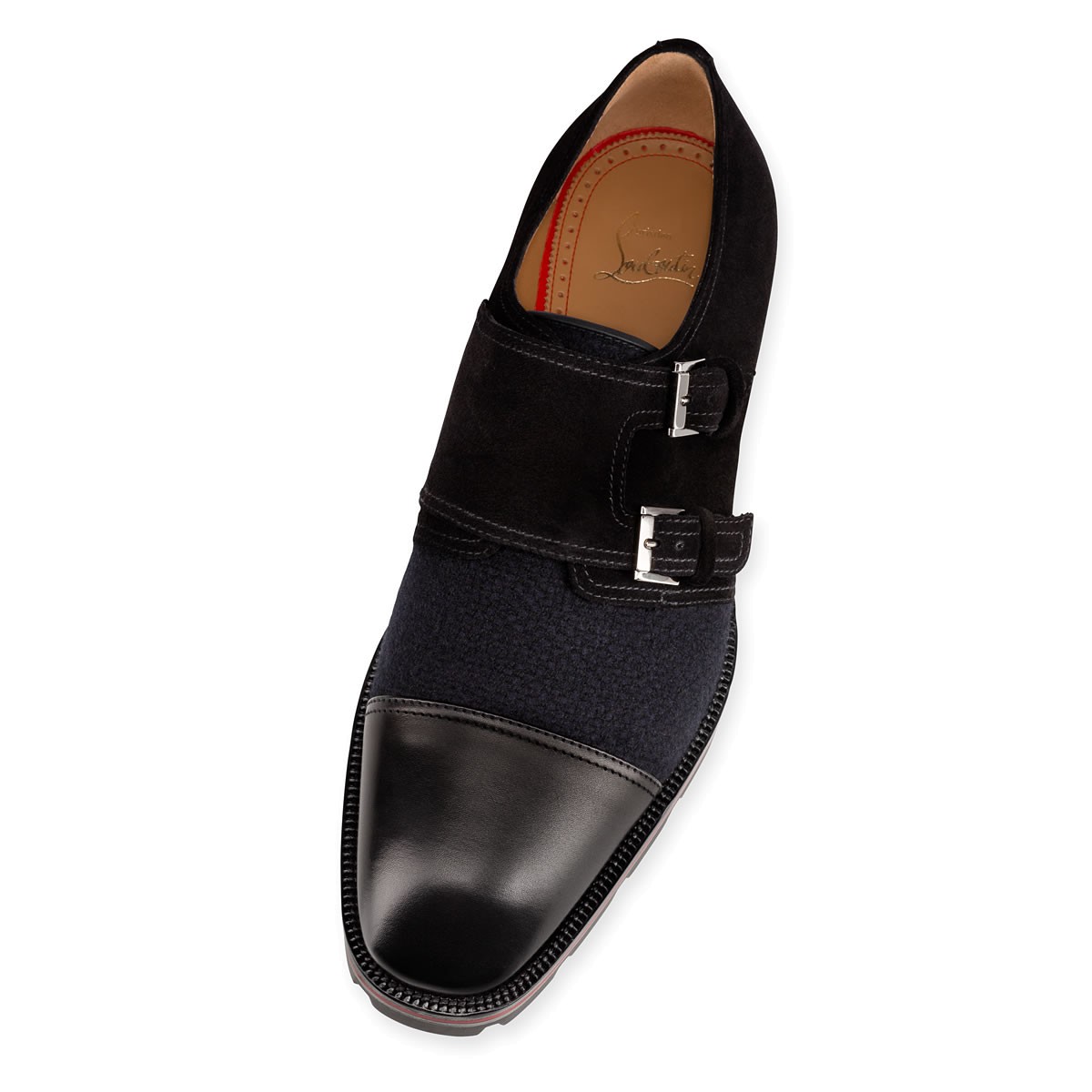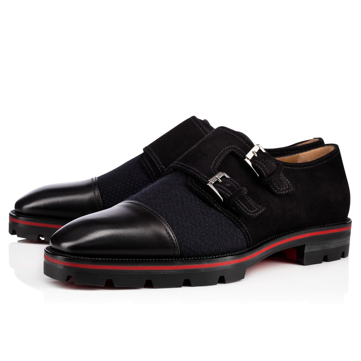 “Mortimer X Sole Flat” is a studly alternative to the traditional lace-up. Featuring an elegant cap toe, double buckle flap and Loubi red lined lug sole, this city shoe in navy tweed with black leather and suede is a gentleman’s essential.