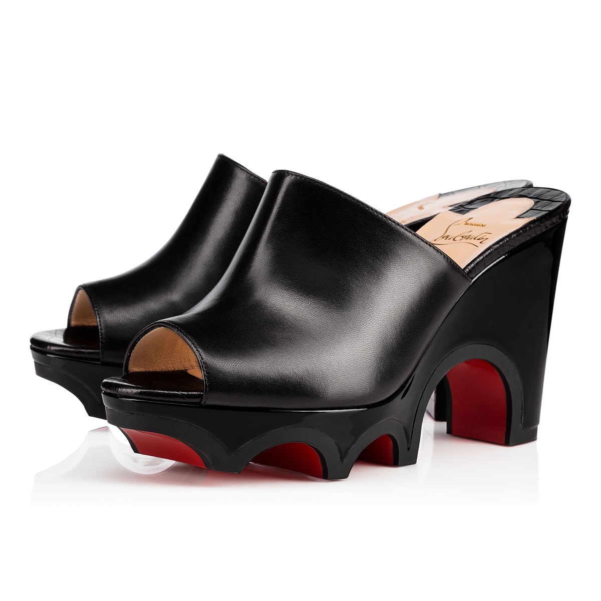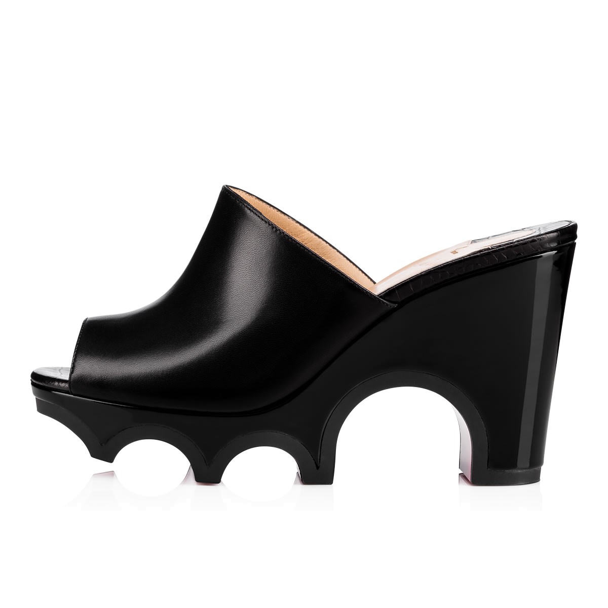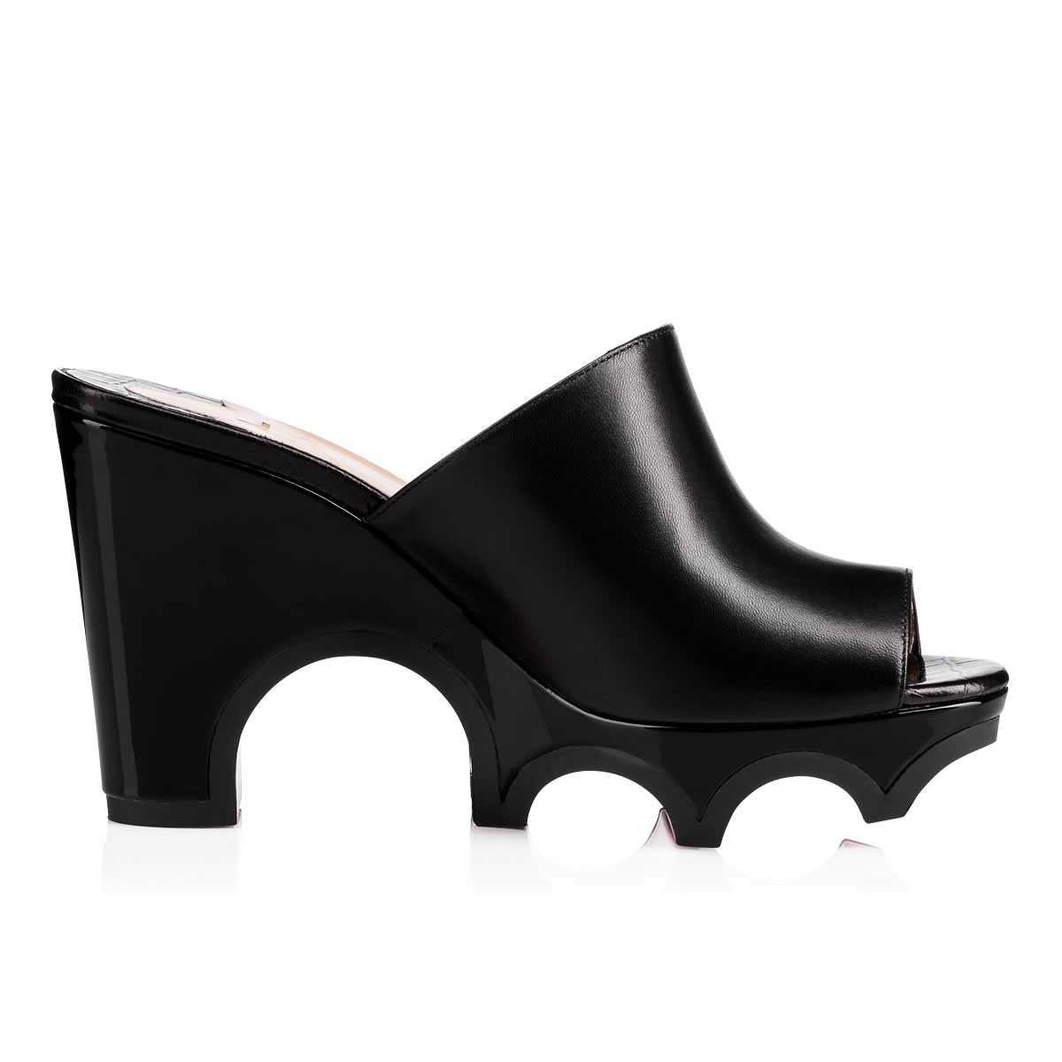 Give your look the ‘wow’ factor with “Mulacramp”. Carving vivid arcs into the 100mm wedge, this black leather and patent slide is detailed with a crocodile embossed leather insole.