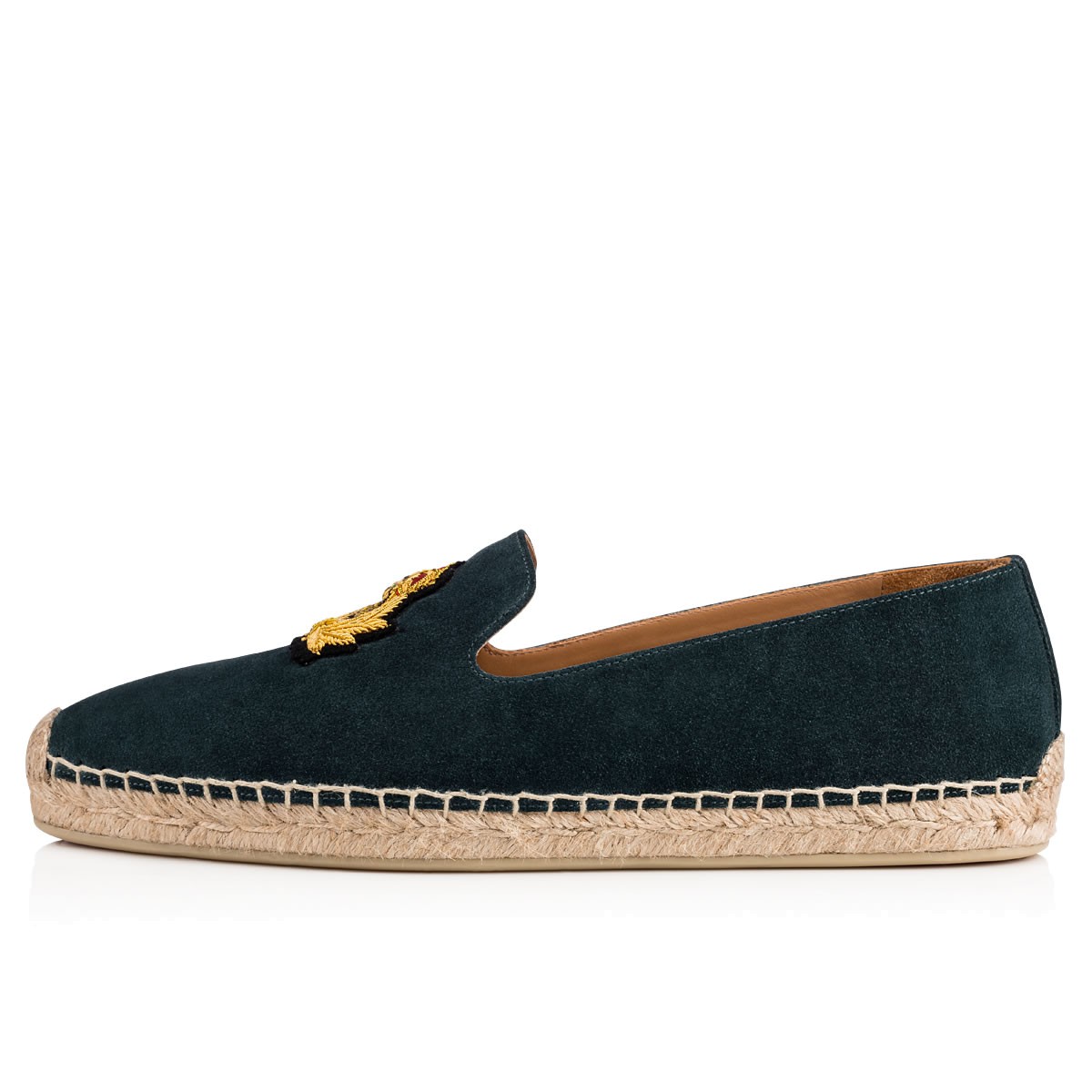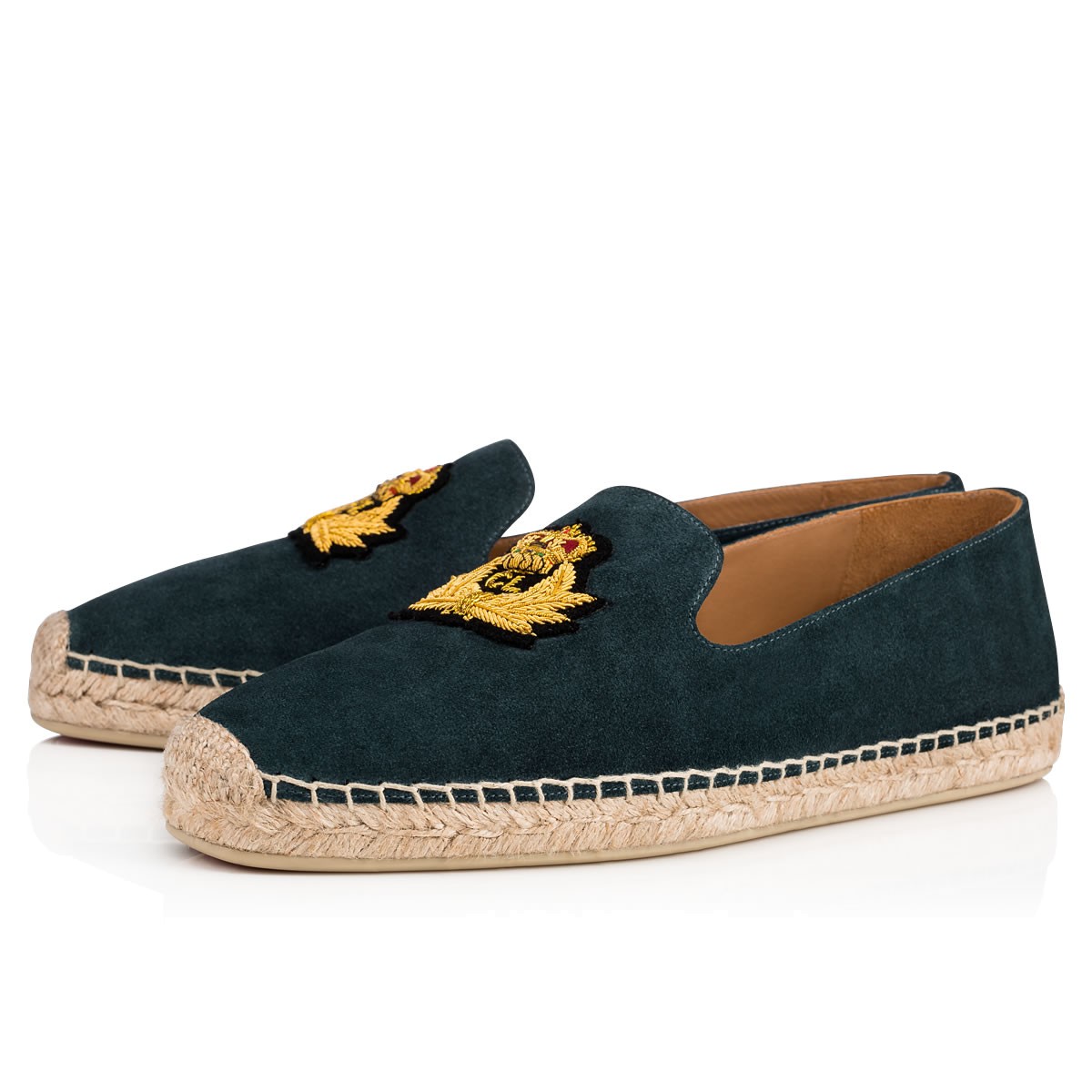 Espadrilles are the official all-season leisure shoe. Get your Fall/Winter pair with “Nanou Flat”. In cool baltic suede, this ever classic slip-on is further distinguished by the signature Louboutin crest patch.