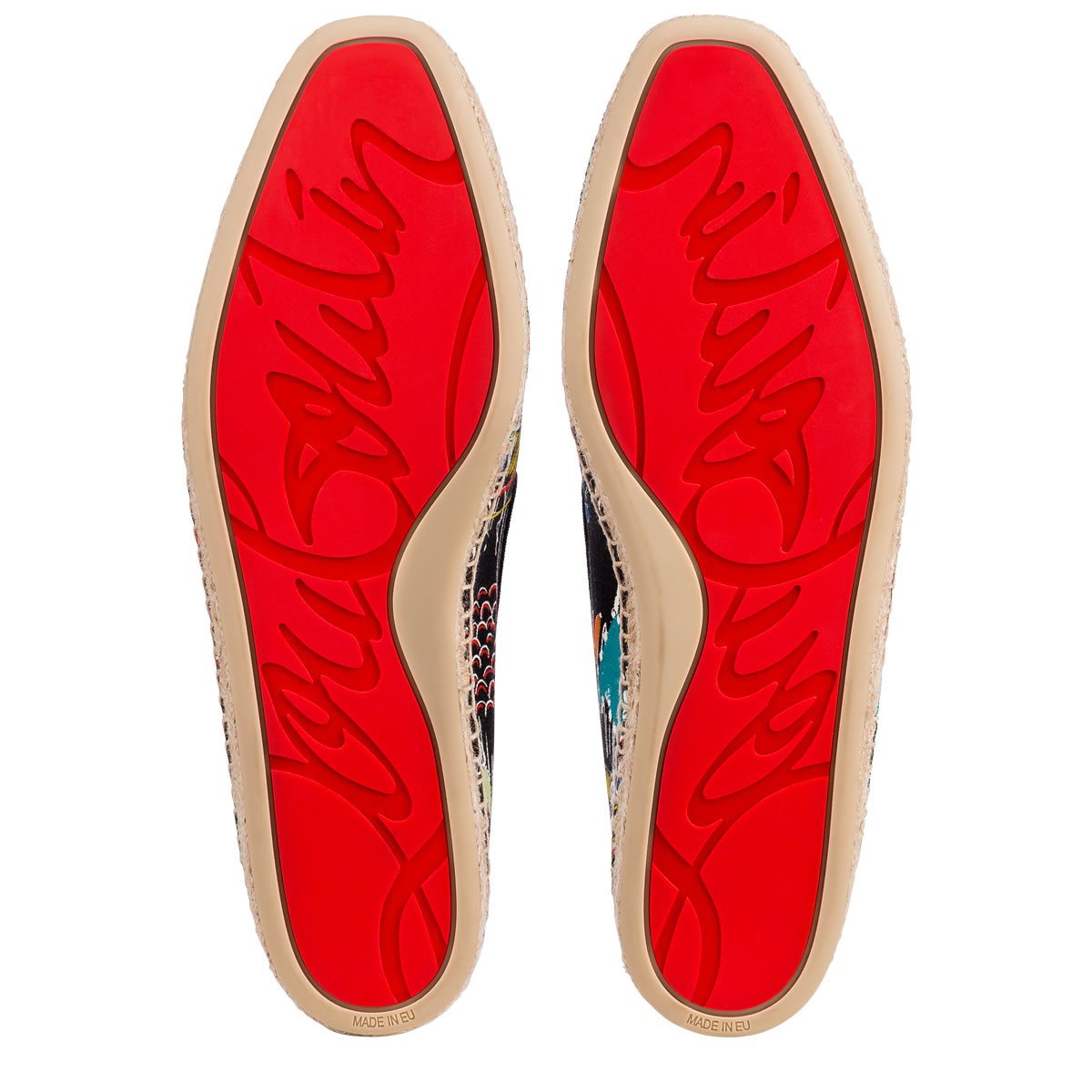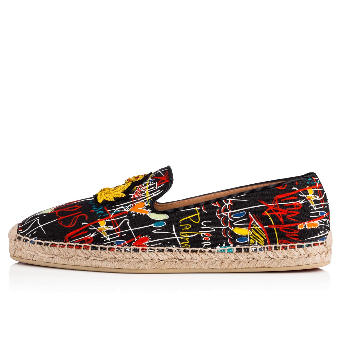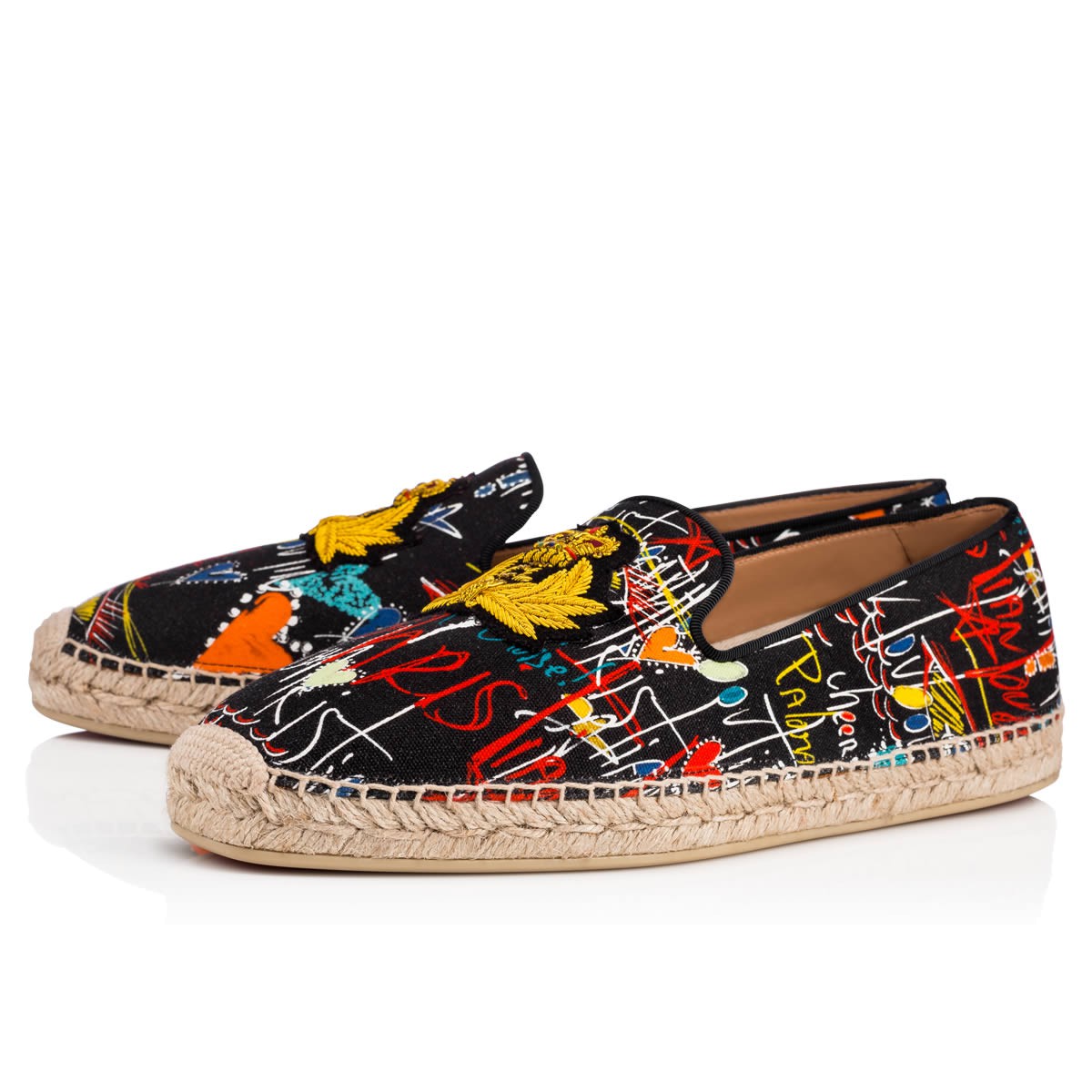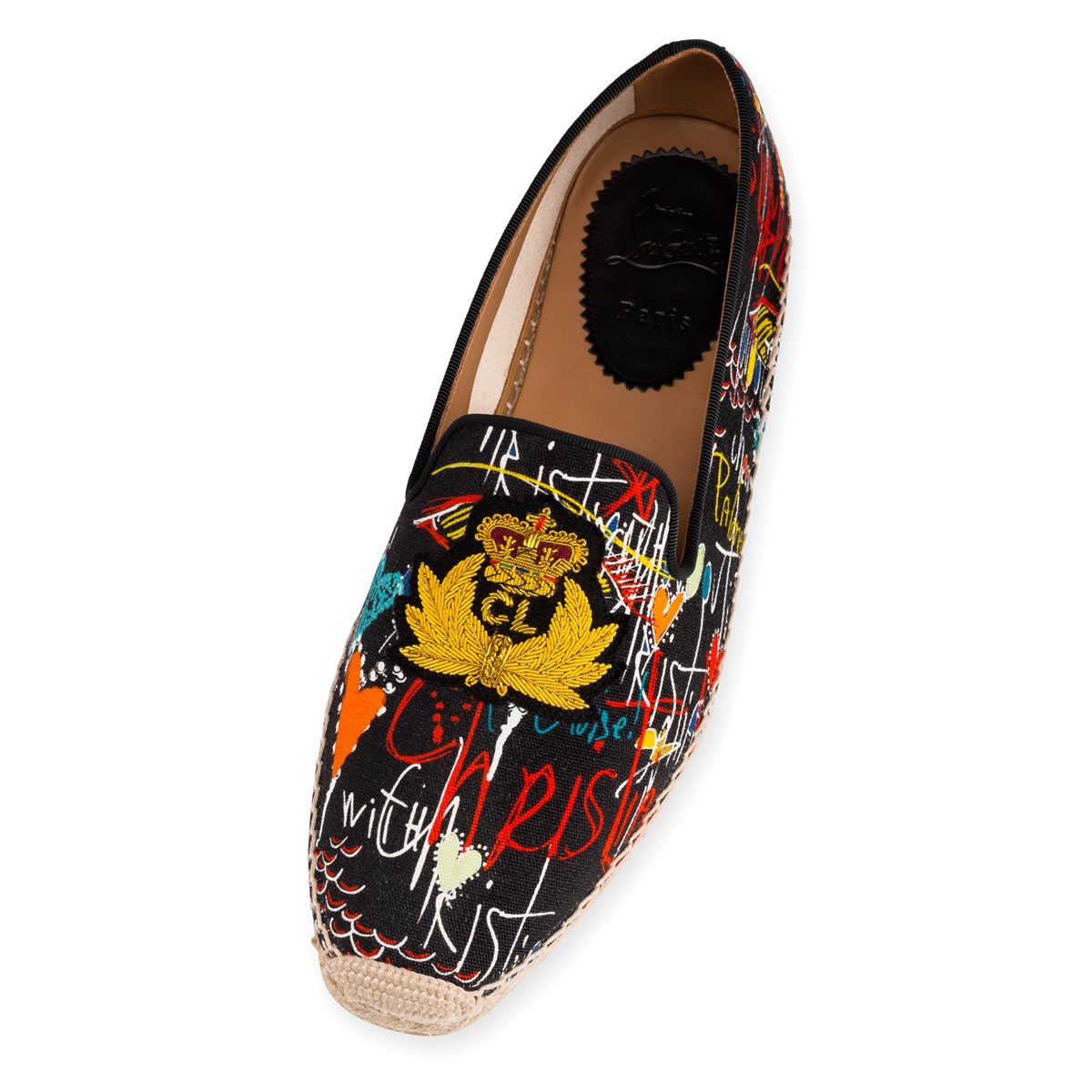 “Nanou Orlato Flat” is this season’s essential espadrille. Donning the CL signature logo2 crest patch, this classic slip-on in Christian’s hand-drawn ‘Loubitag’ scribble print black canvas is a vibrant casual look. Keeping with tradition, all Louboutin espadrilles are made in Spain.