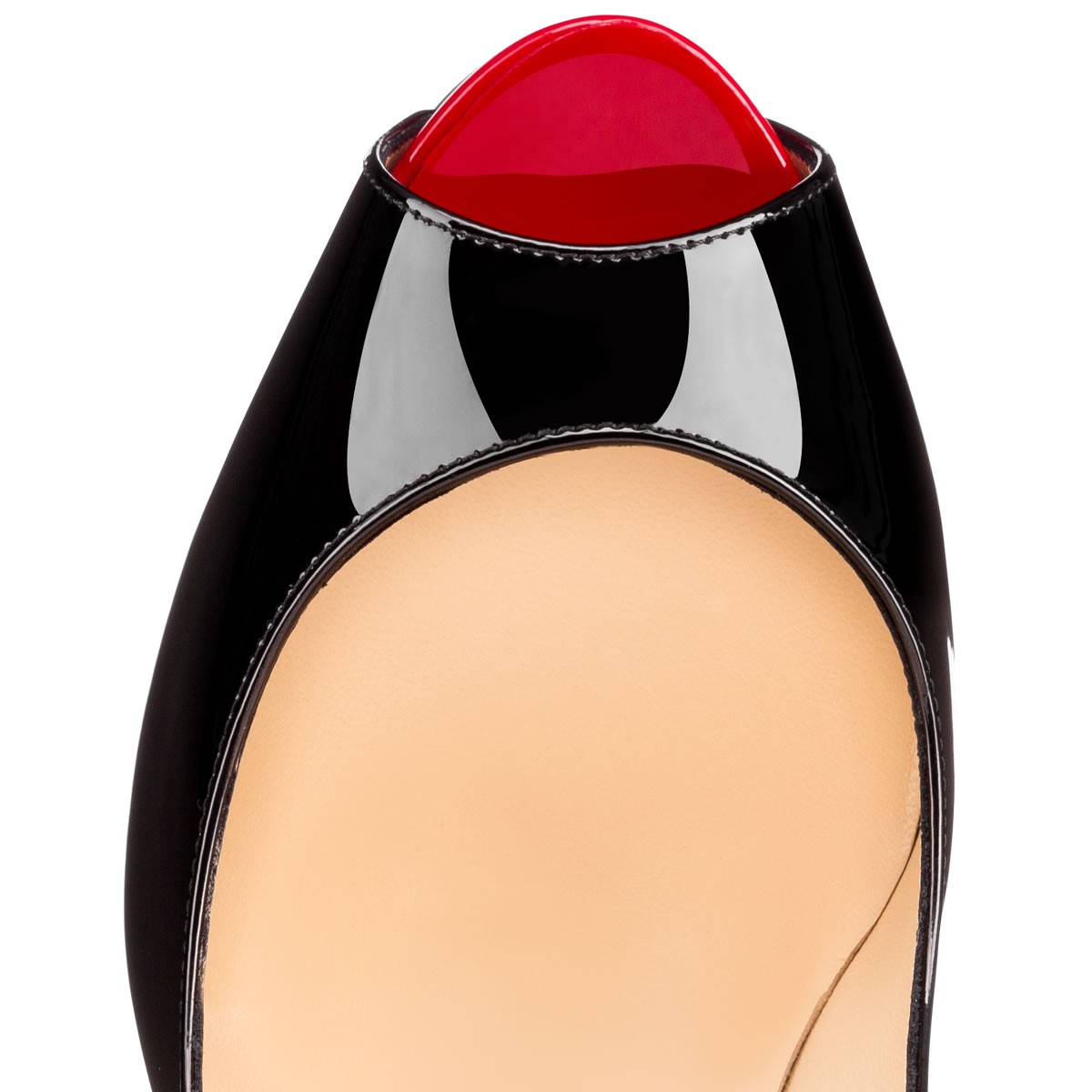 “New Very Prive” is a chic update on the signature classic “Very Prive”. Featuring a slender platform and 120mm spike heel, this peep-toe pump in black and red patent leather makes an alluring statement.