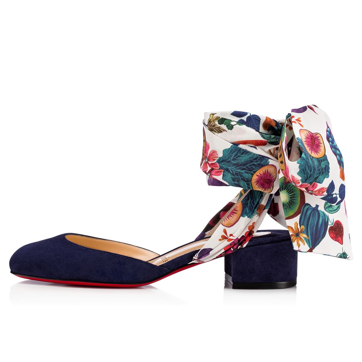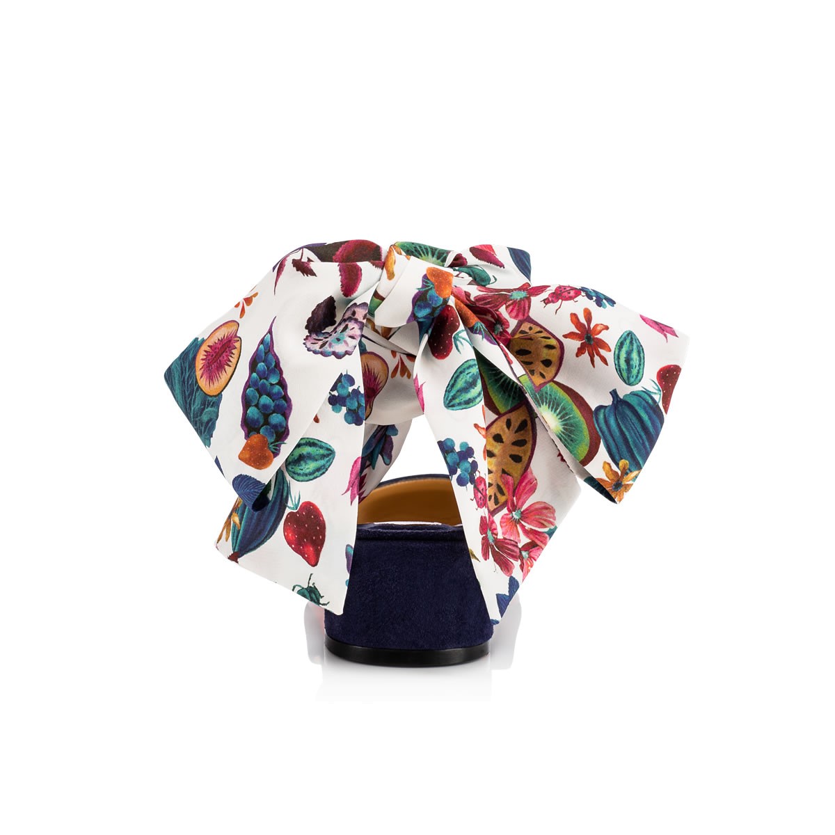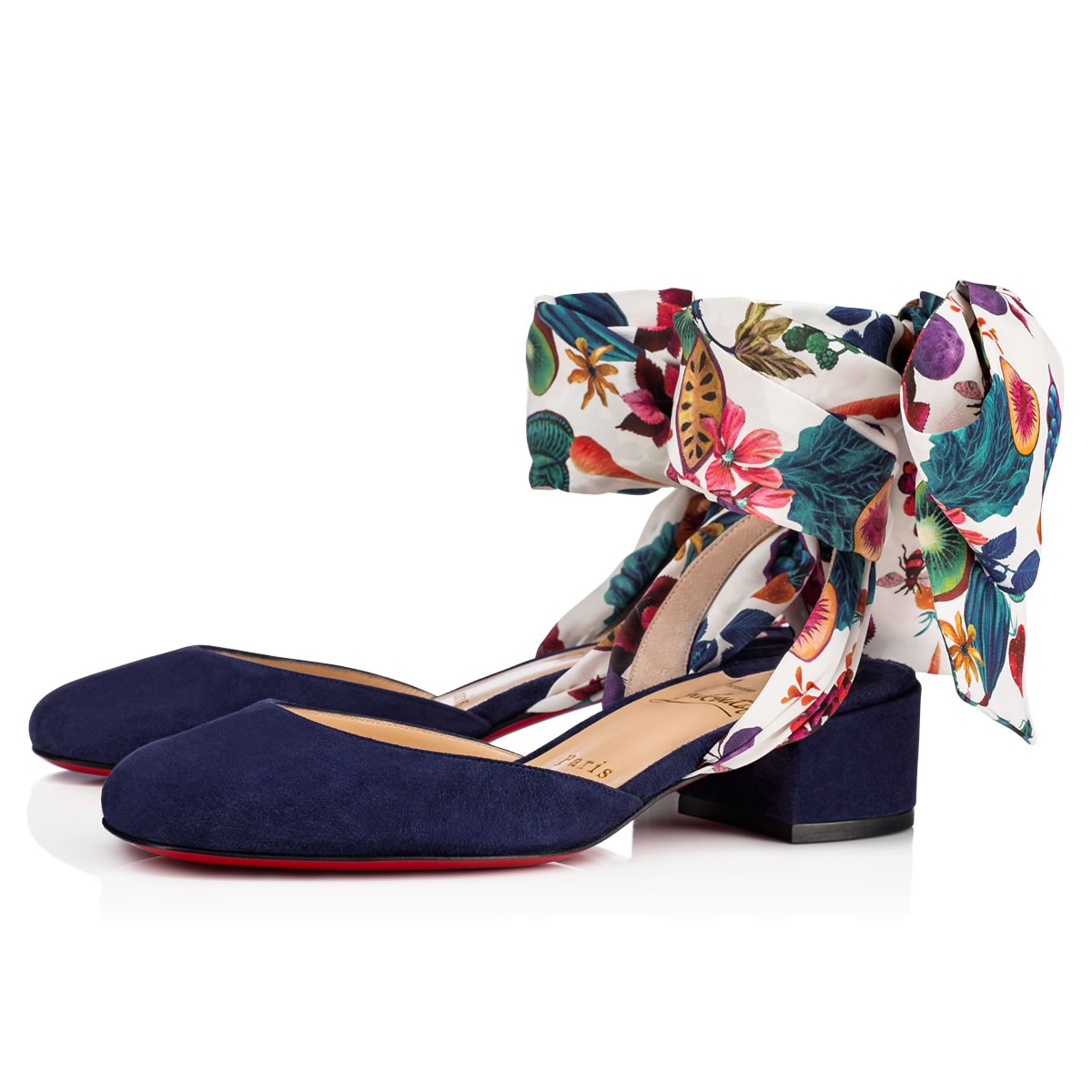 Tie your Spring/Summer styles together with “Nitadiva”. Inspired by Christian’s visit to a famous Venetian scarf designer, this pair features a gorgeous crepe silk scarf in a traditional Liberty of London verger print. Wrapping around the leg and tying abundantly behind the ankle, this round-toe style in rich China blue suede is finished with a chic 40mm block heel.