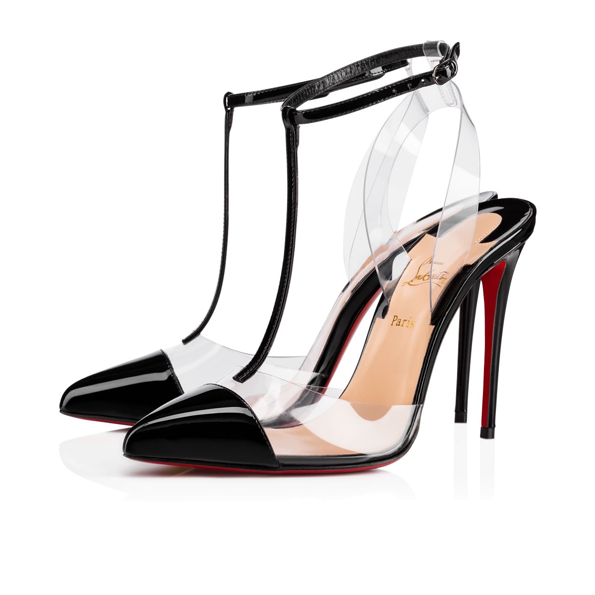 “Nosy” keeps the mystery this season with a transparent PVC slingback and vamp detailing that make the ankle and T-straps appear to float on the foot. Dressed in sleek black patent leather, this 100mm pump is a style to treasure.