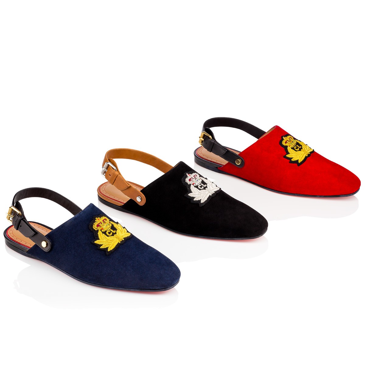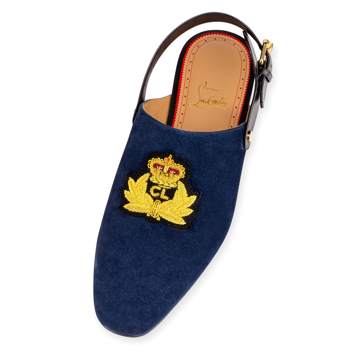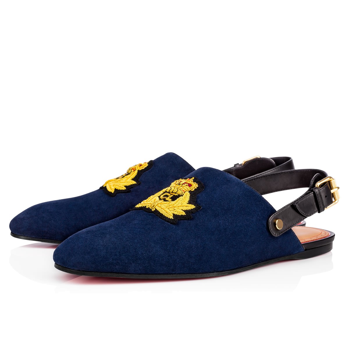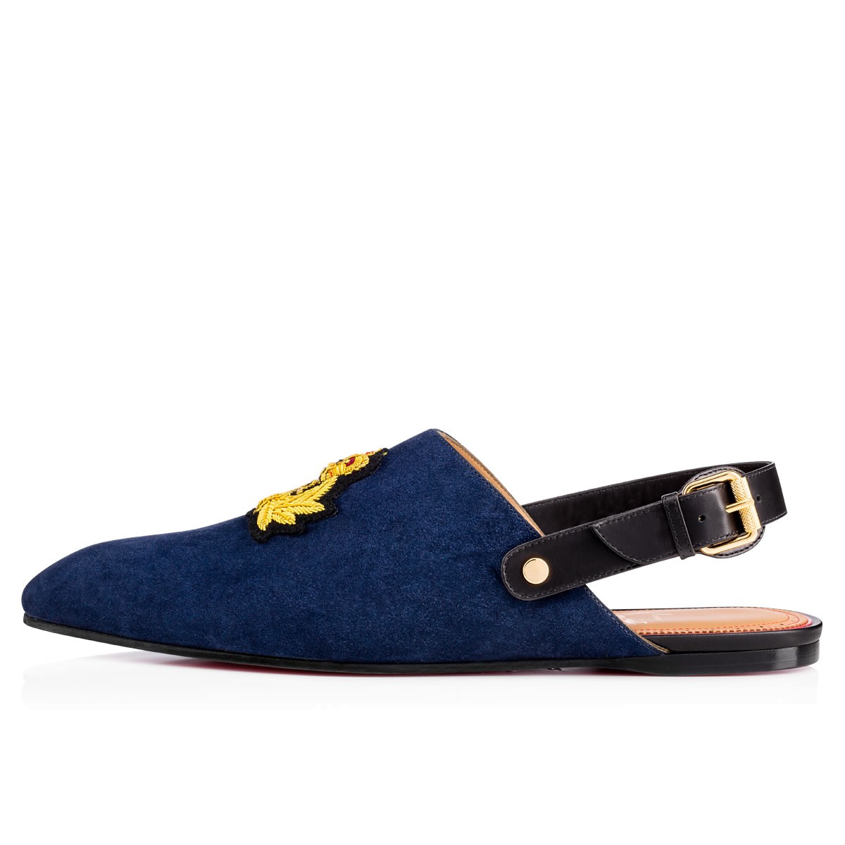 Built upon the signature classic “Dandy” last, “Oliveira Flat” is a one-of-a-kind city slipper that can be worked with any Spring/Summer look. Bearing the signature Christian Louboutin crest patch and finished with a striated buckle strap, this pair in navy suede has an understated air of distinction.