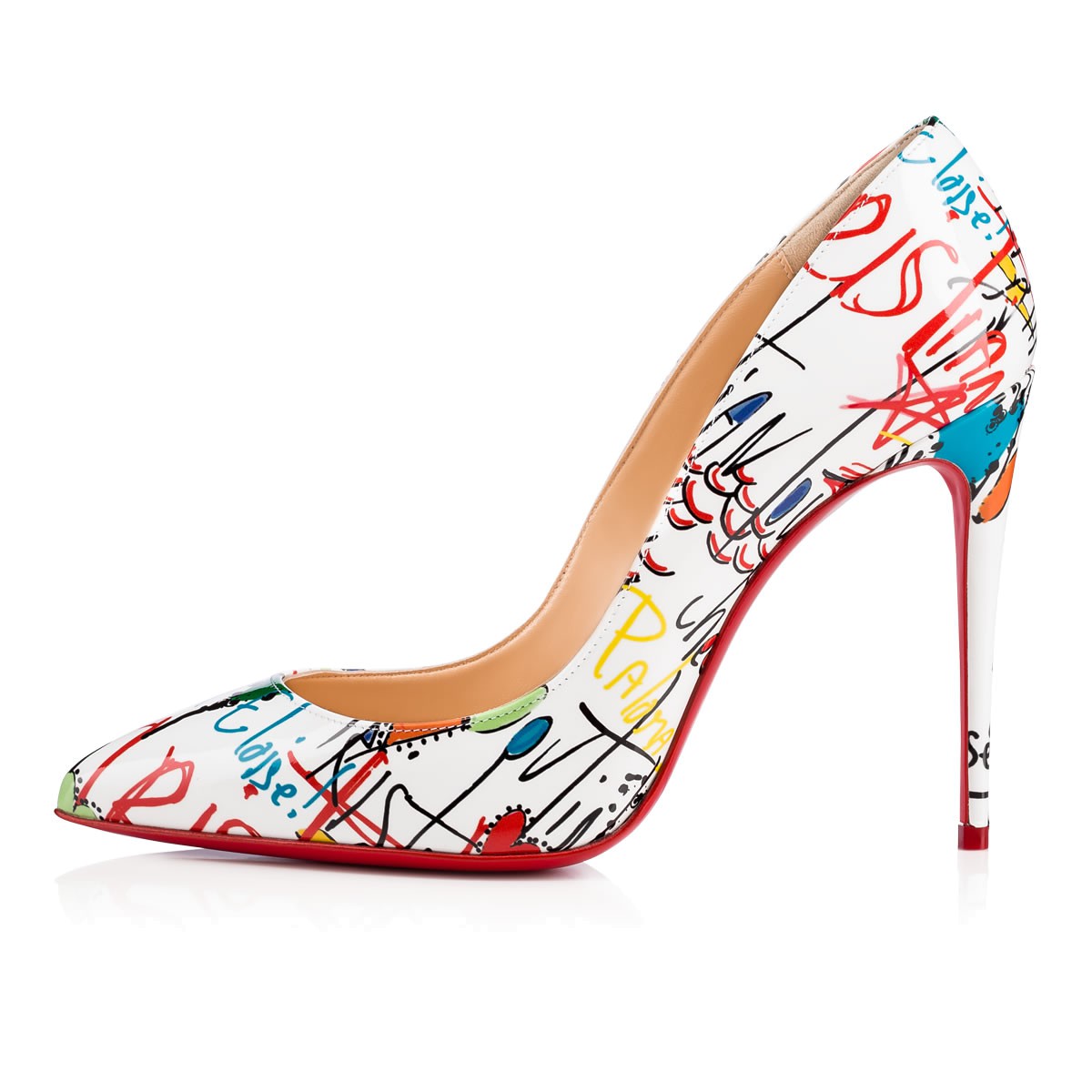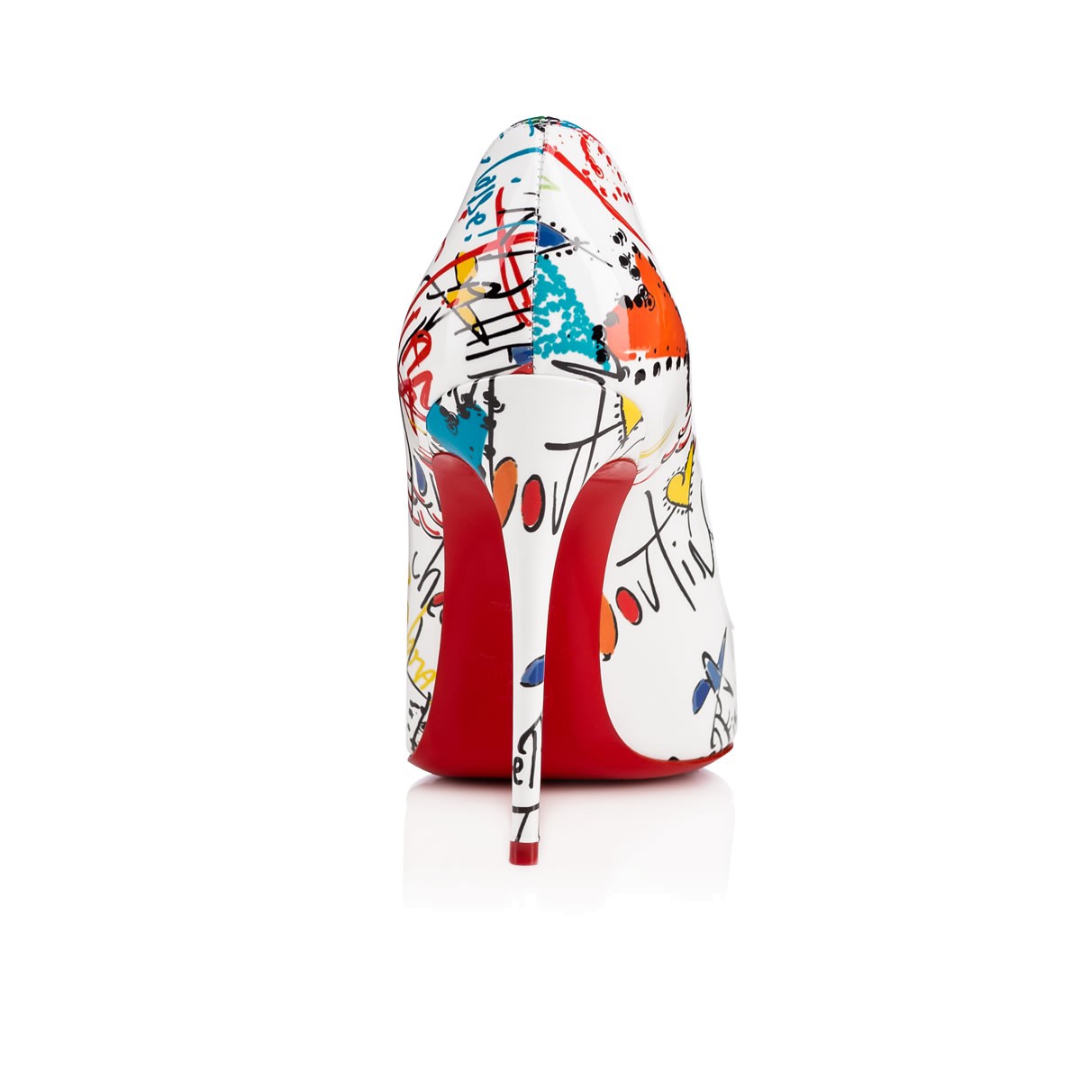A variation on a beloved theme, “Pigalle Follies” is the illustrious icon, “Pigalle,” refitted with a slightly shorter toe box and a superfine stiletto heel. The effect is an elegant silhouette with a feminine 100mm pitch. Make a statement in Christian’s hand-drawn ‘Loubitag’ scribble printed white patent leather.