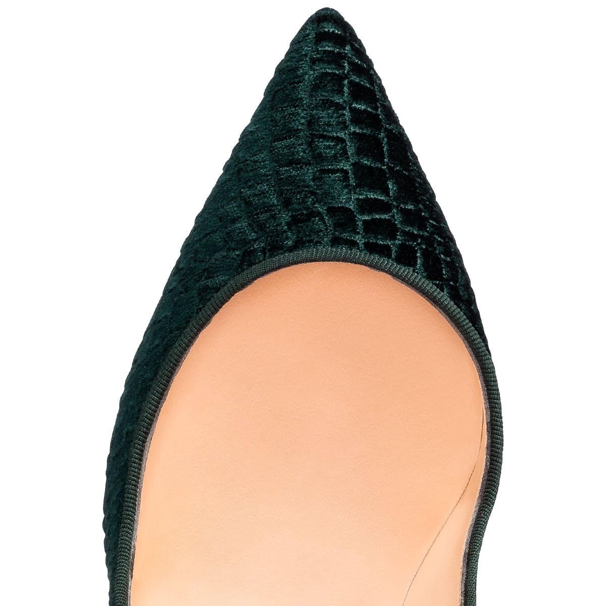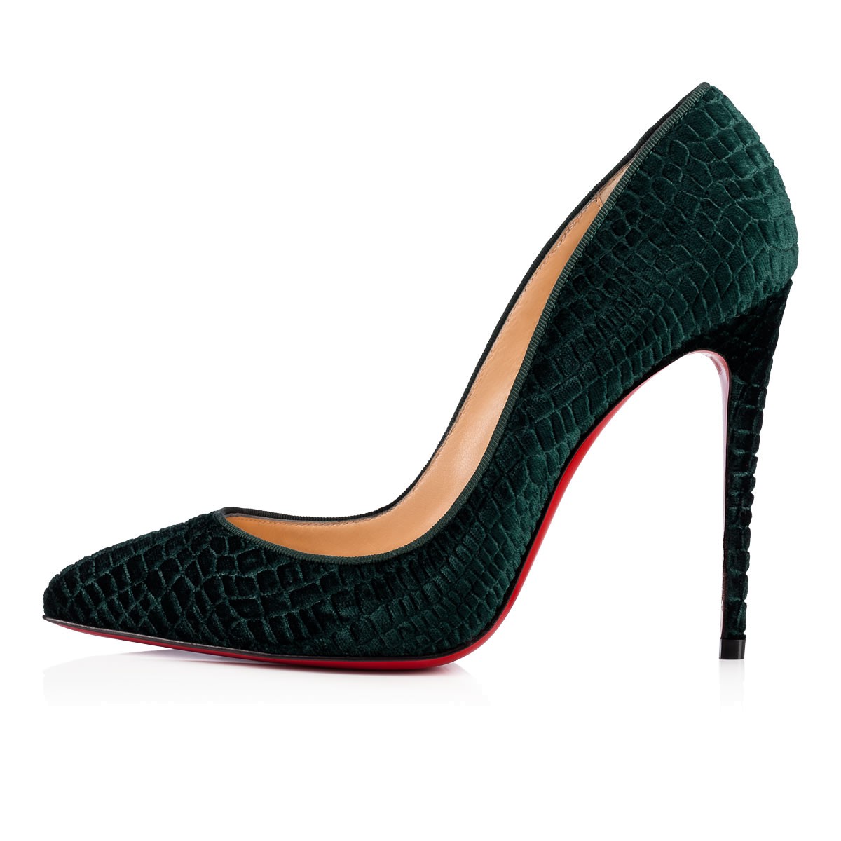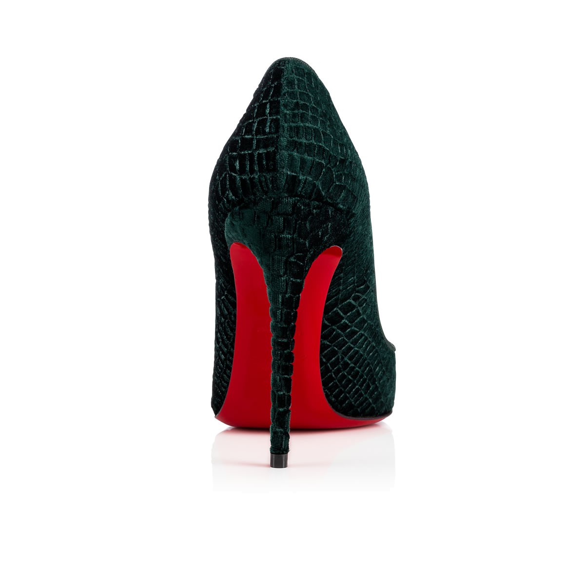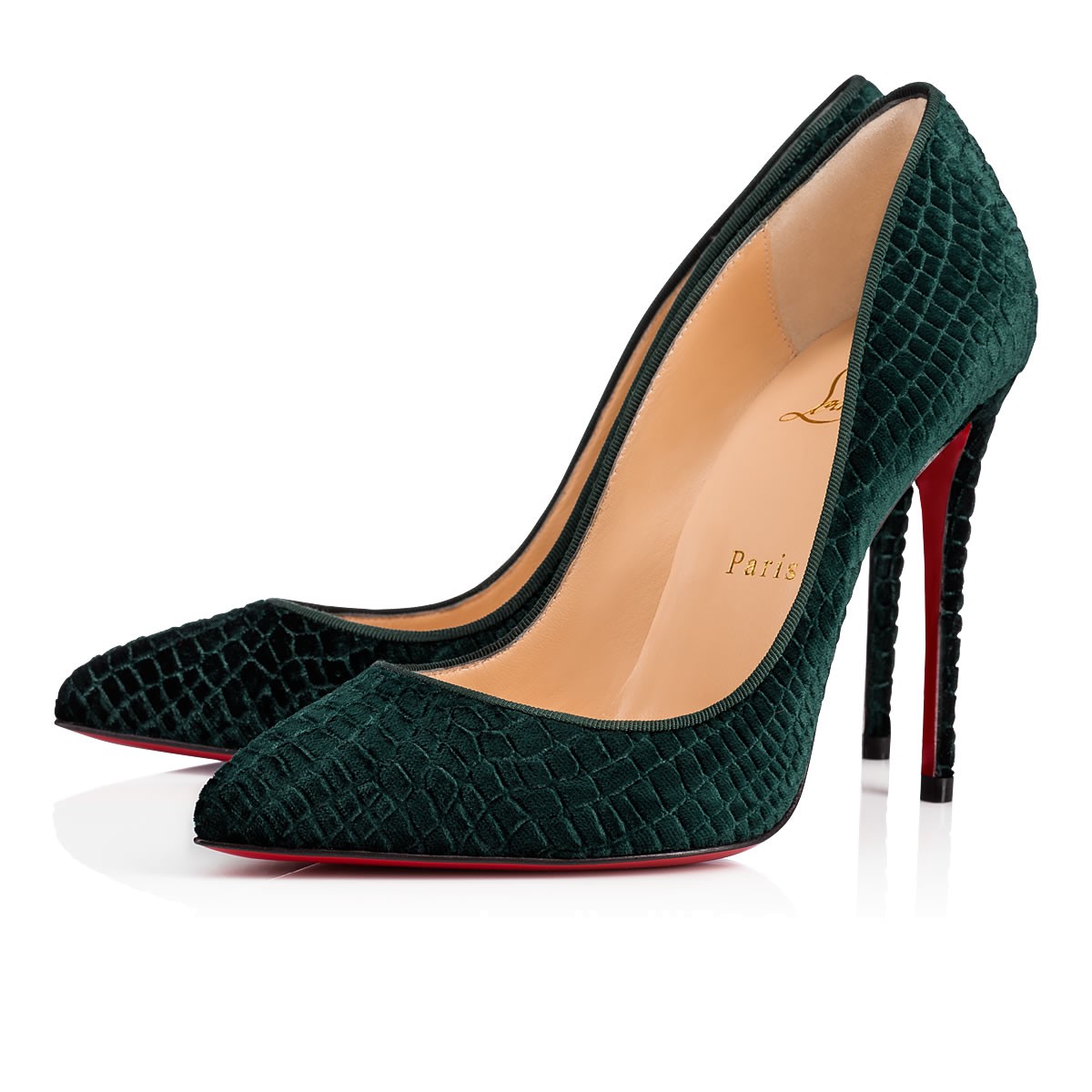 A variation on a beloved theme, “Pigalle Follies” is our number-one icon, “Pigalle,” refitted with a slightly shorter toe box and a superfine stiletto heel. The effect is an elegant silhouette with a feminine 100mm pitch. In verde embossed crocodile print velvet, she brings a head-turning touch to your look.