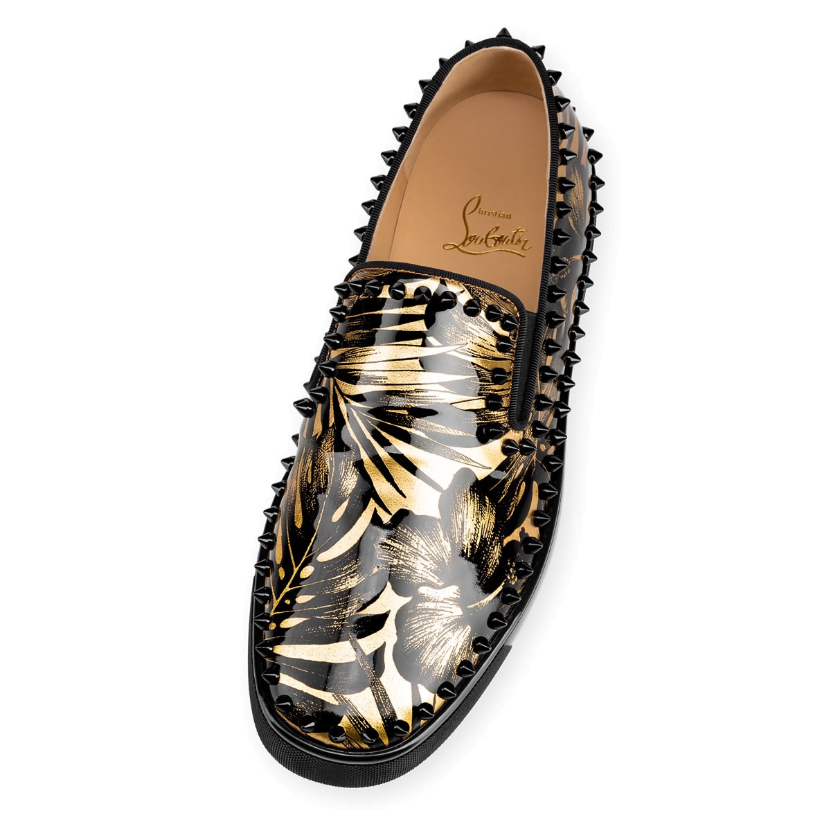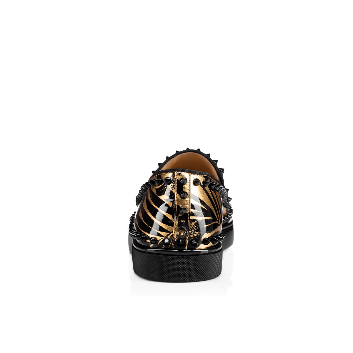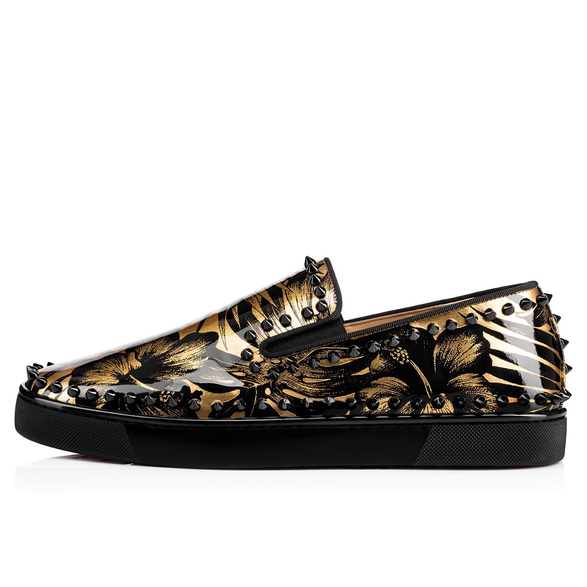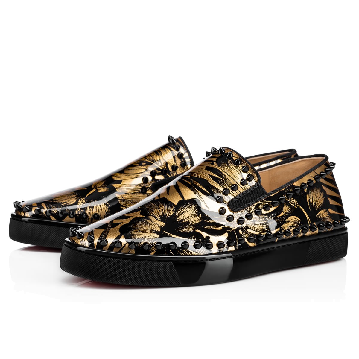 Hang loose in luxury this season with “Pik Boat,” your guaranteed go-to for days off duty. In a sensational black and gold hibiscus print patent leather and black spikes, this slip-on style brings a signature Christian Louboutin touch to your more casual looks.