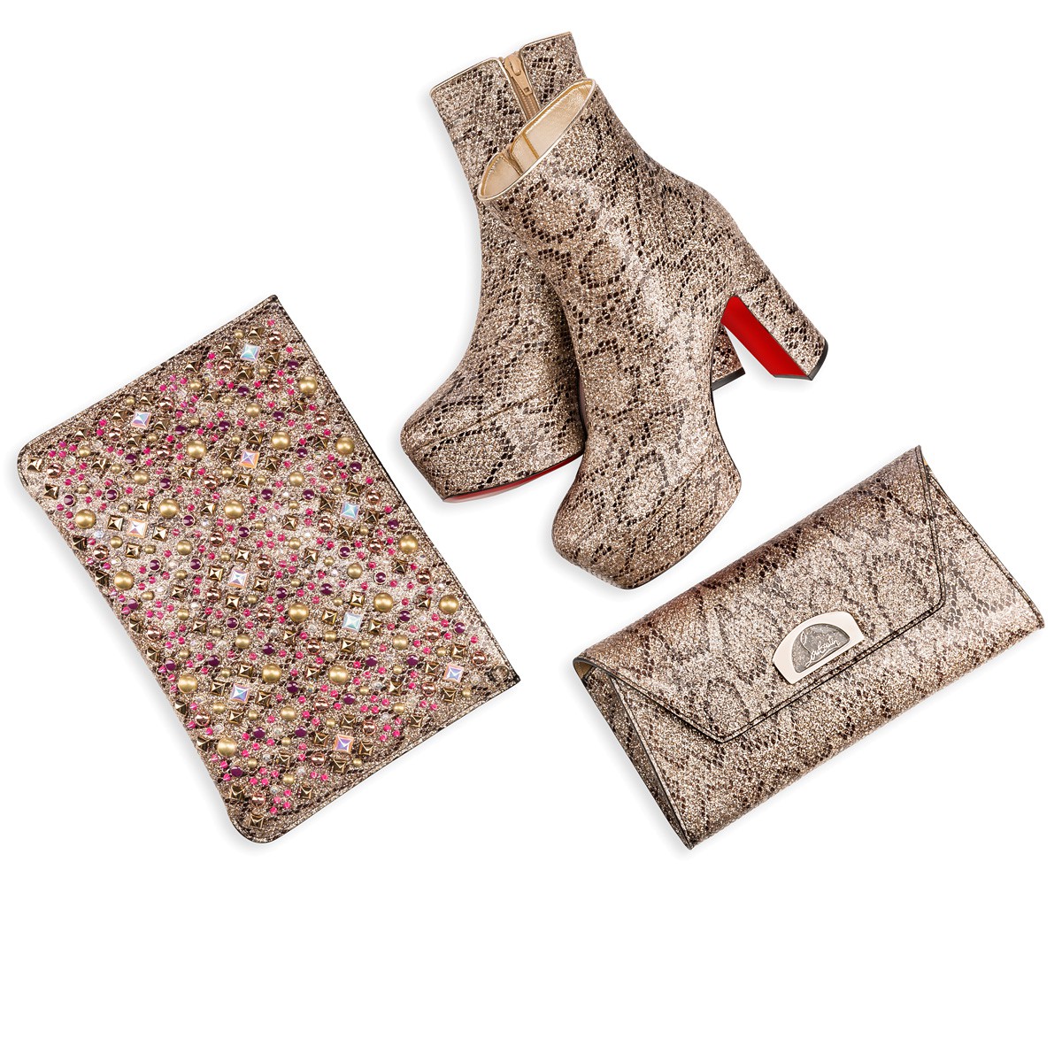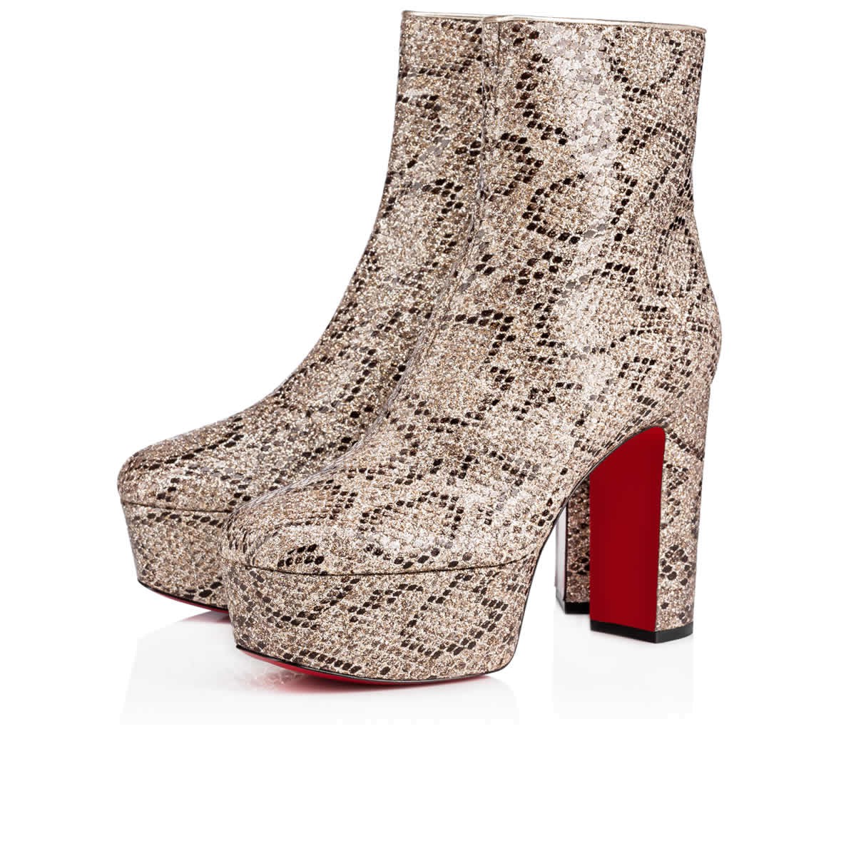 “Protoboot” takes its cues from the ’70s glam rock legends. Featuring a thick platform and 110mm block heel, this side-zip boot in roccia python printed eve glitter is a statement piece for daytime or after dark.
