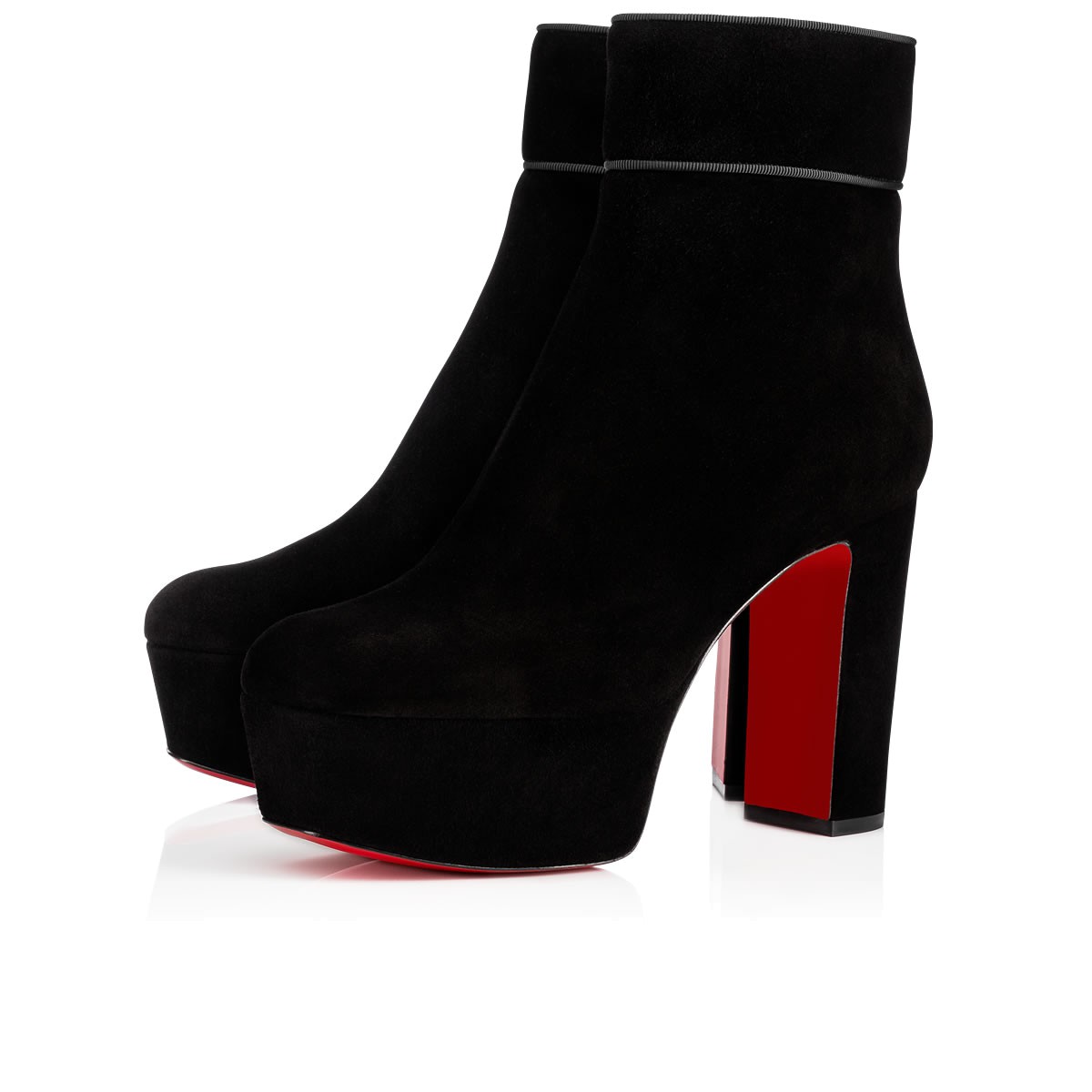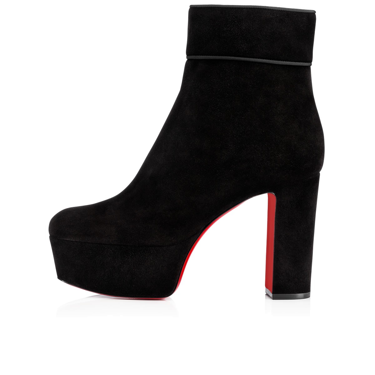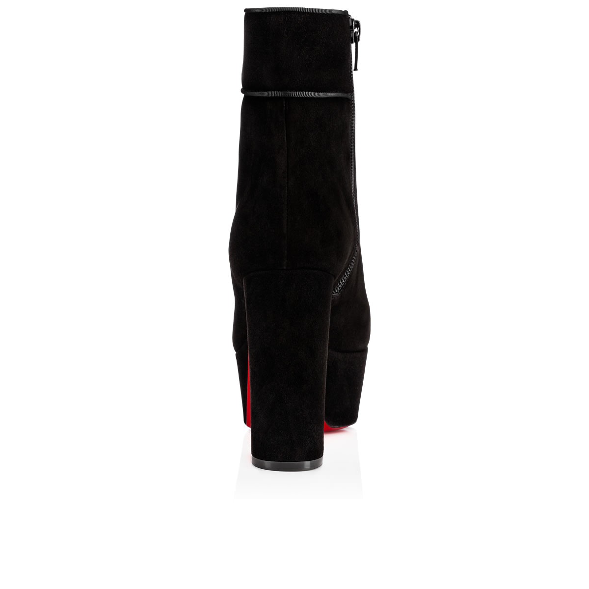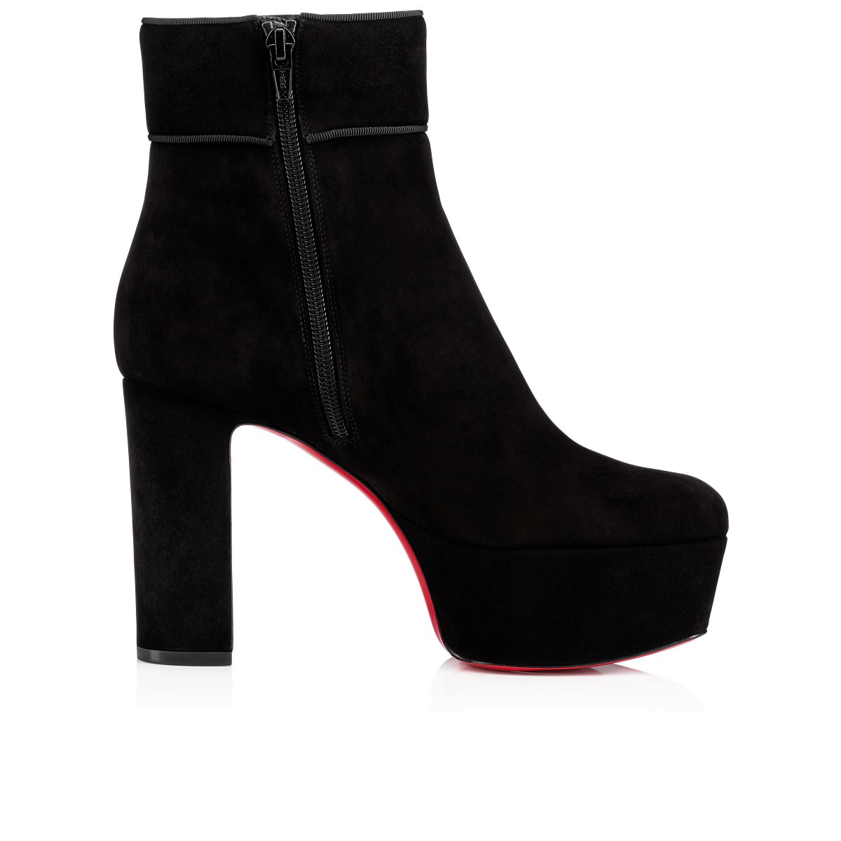 “Protoboot” takes its cues from the ’70s glam rock legends. Featuring a thick platform, 120mm block heel and chic grosgrain piping, this side-zip boot in black suede is a statement silhouette for daytime or after dark.