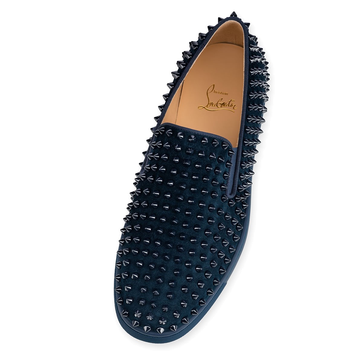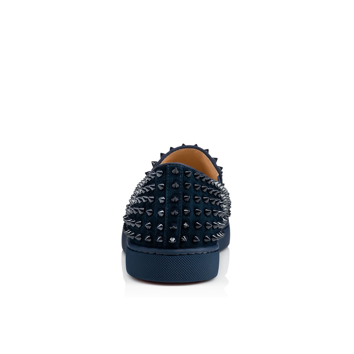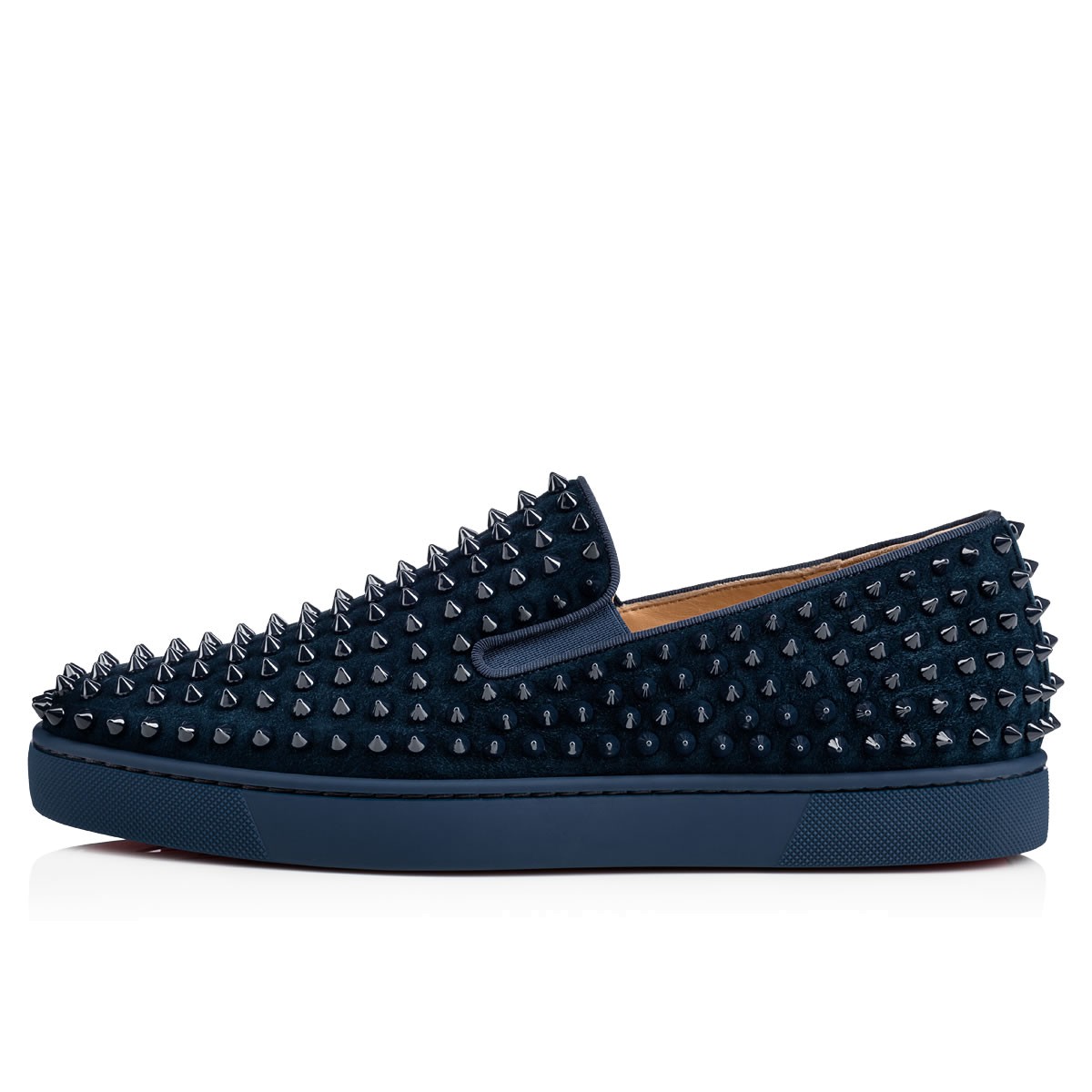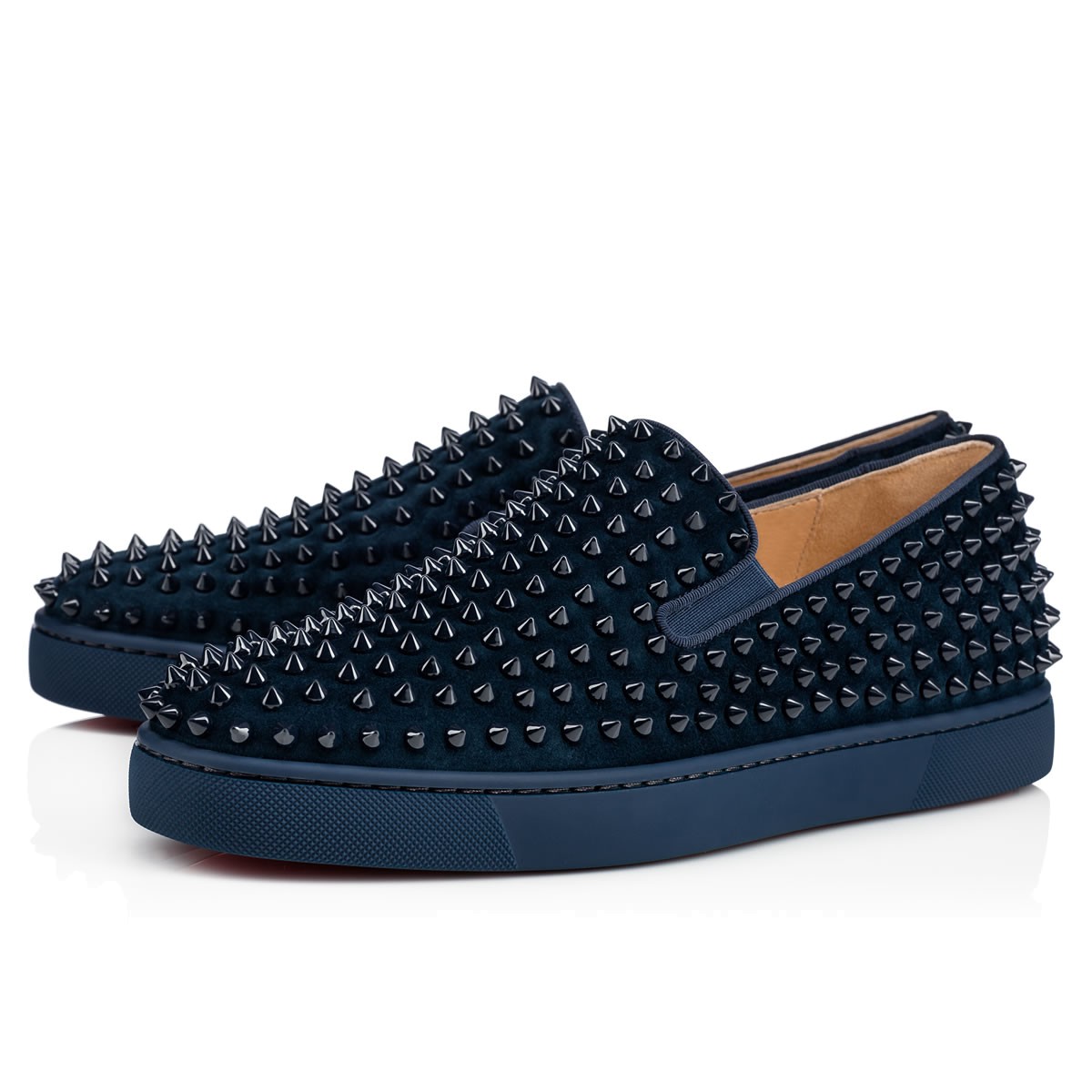 Perfect your casual looks this season with “Roller-Boat Flat”. Combining luxury with leisure, this version in cool quartz suede and spikes is finished with a signature Louboutin red rubber sole.