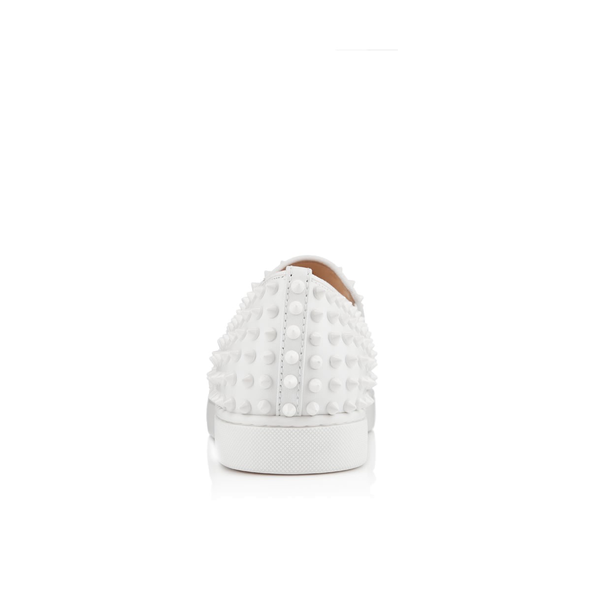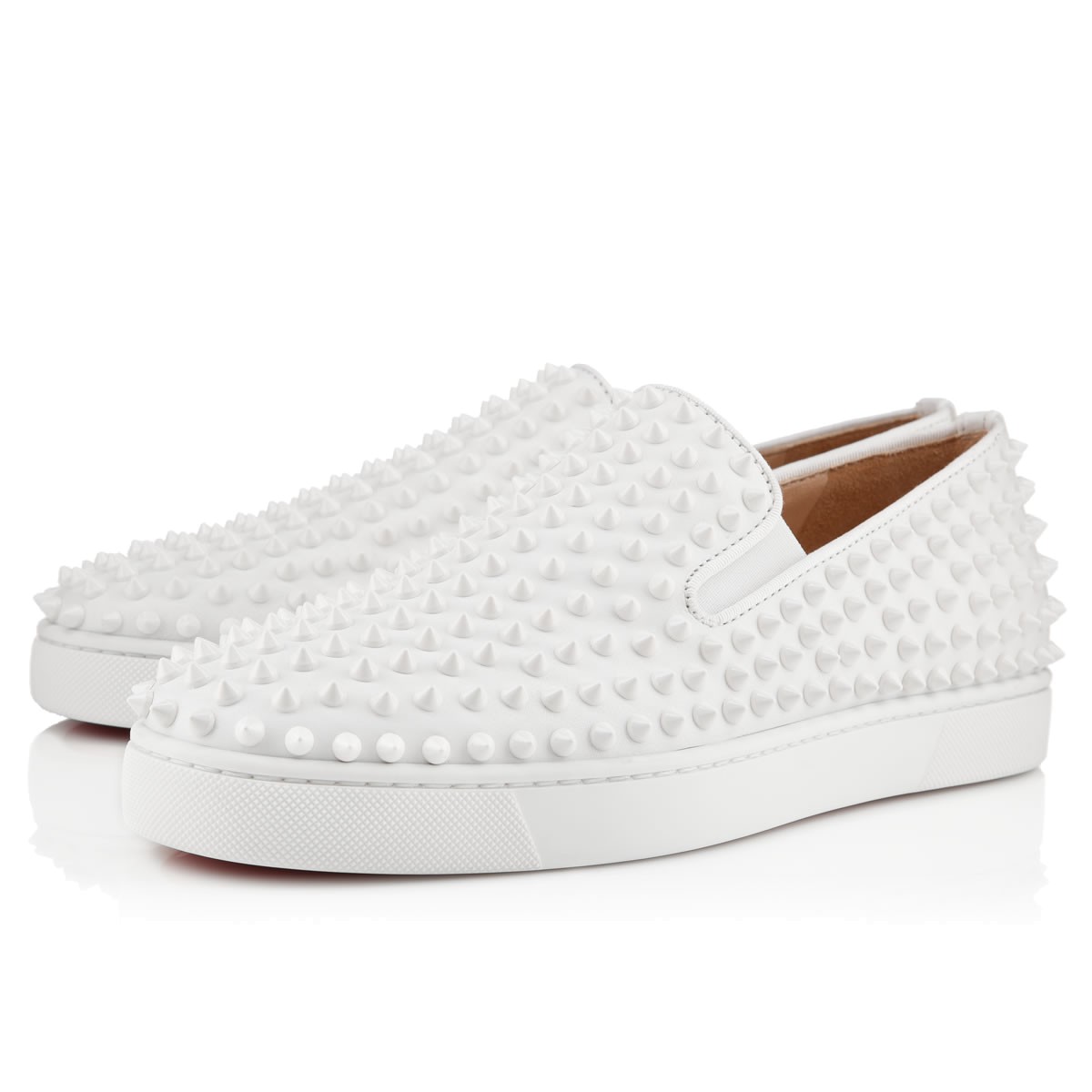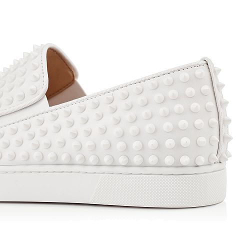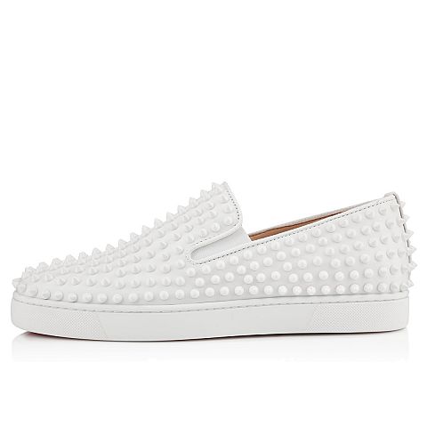 Perfect your casual looks this season with “Roller-Boat Flat”. Combining luxury with leisure, this version in pristine white leather and spikes is finished with a signature Louboutin red rubber sole.