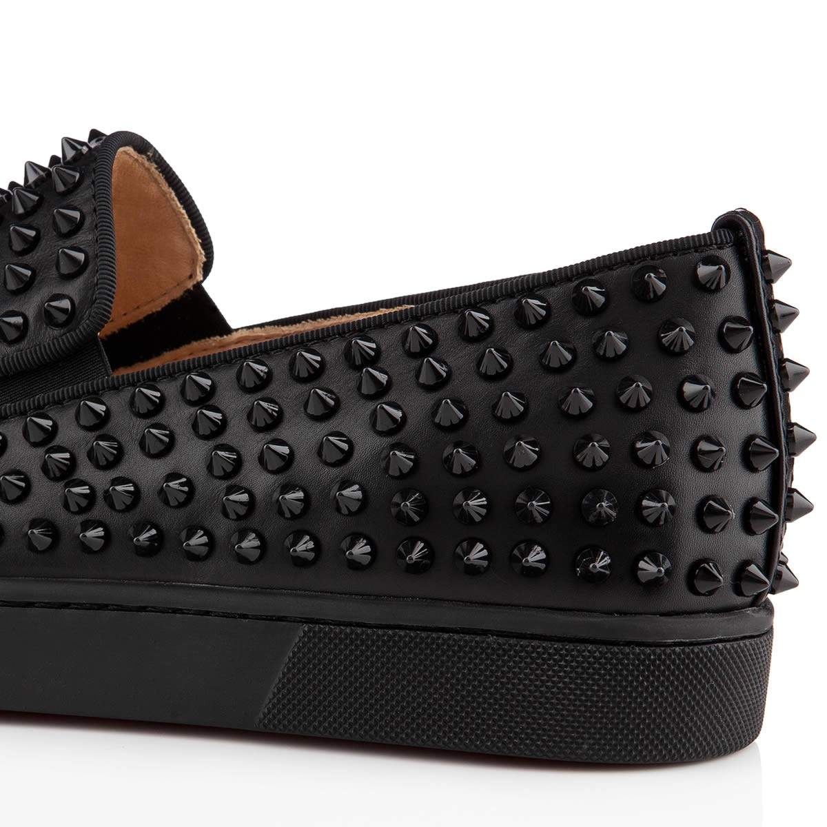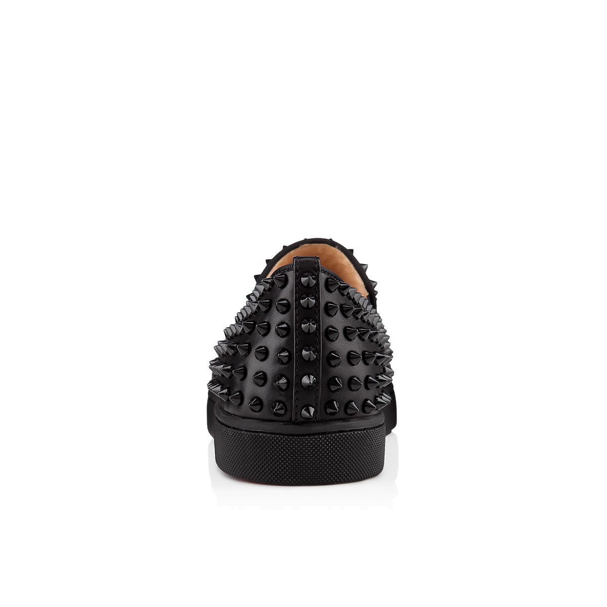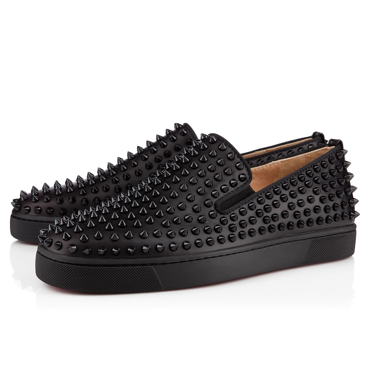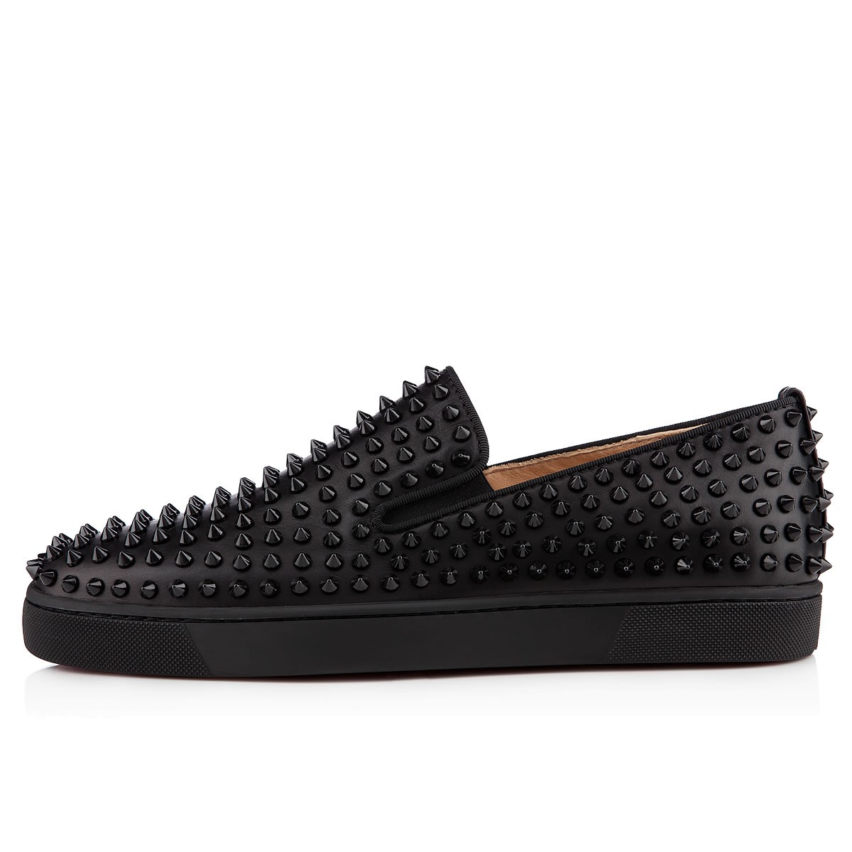 Perfect your casual looks this season with “Roller-Boat Flat”. Combining luxury with leisure, this version in sleek black leather and spikes is finished with a signature Louboutin red rubber sole.