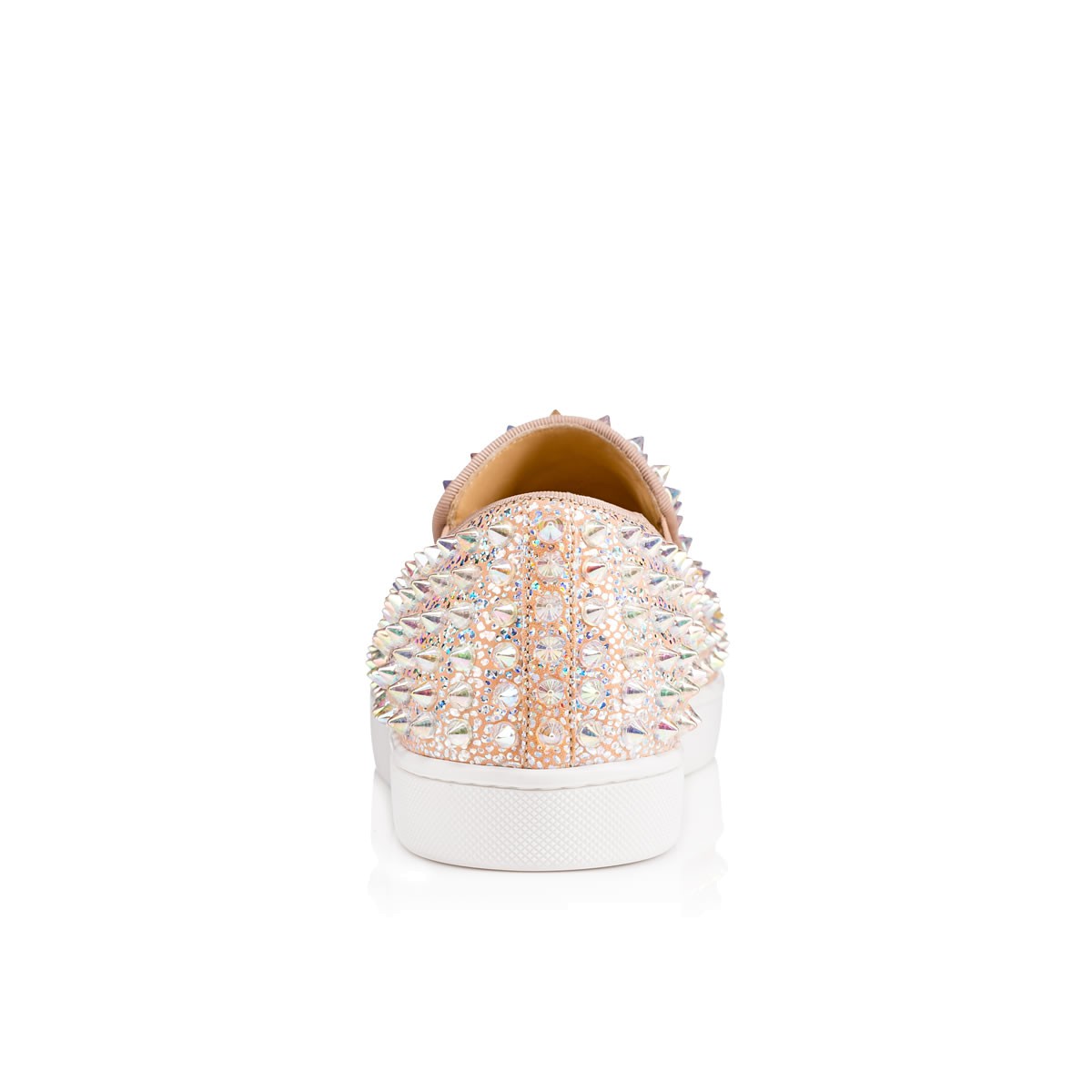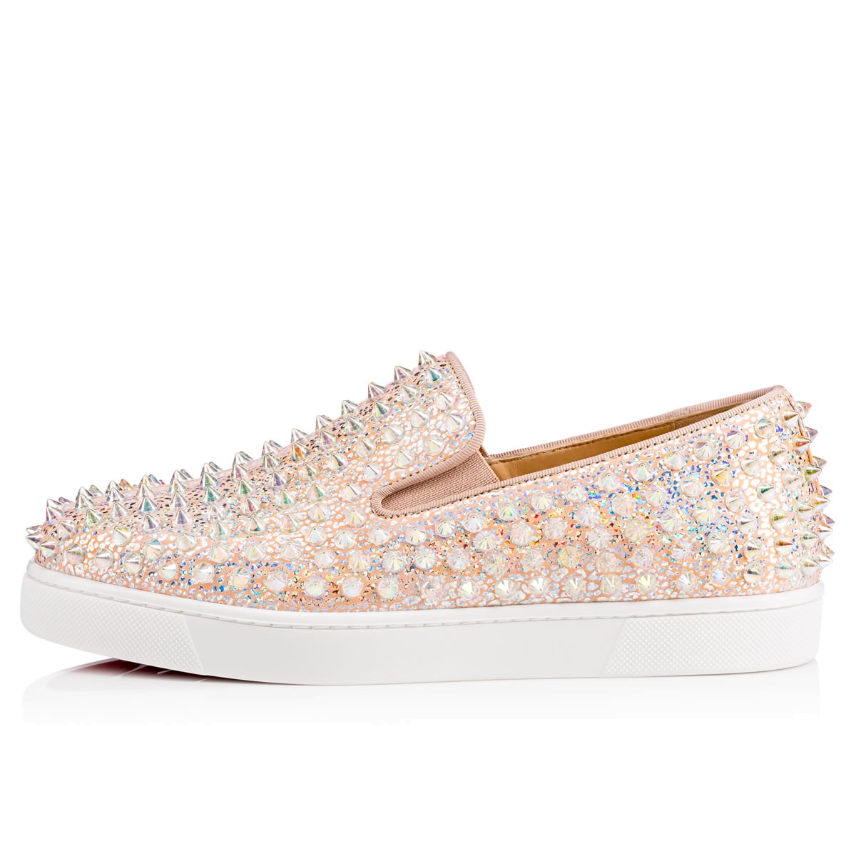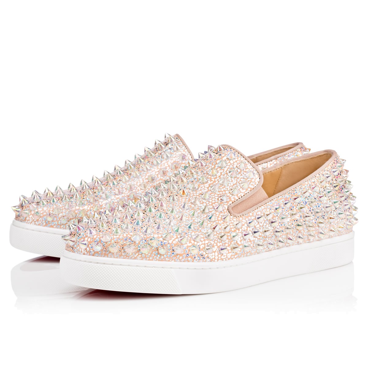 “Roller Boat Woman Flat” is synonymous with effortless style. Combining luxury with leisure, this version in doudou ‘sparkly’ laminated leather and opalescent ‘ab’ white spikes is a red sole slip-on sensation.