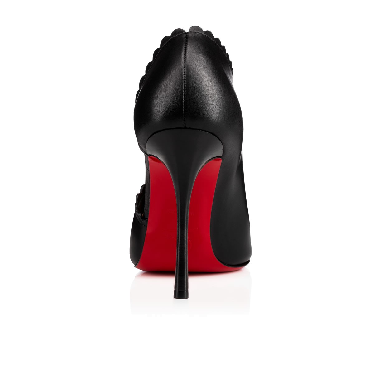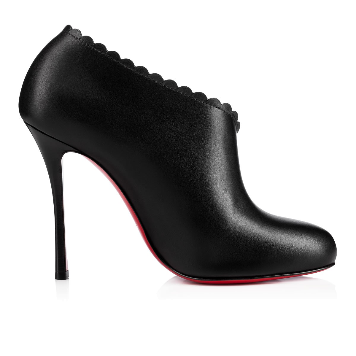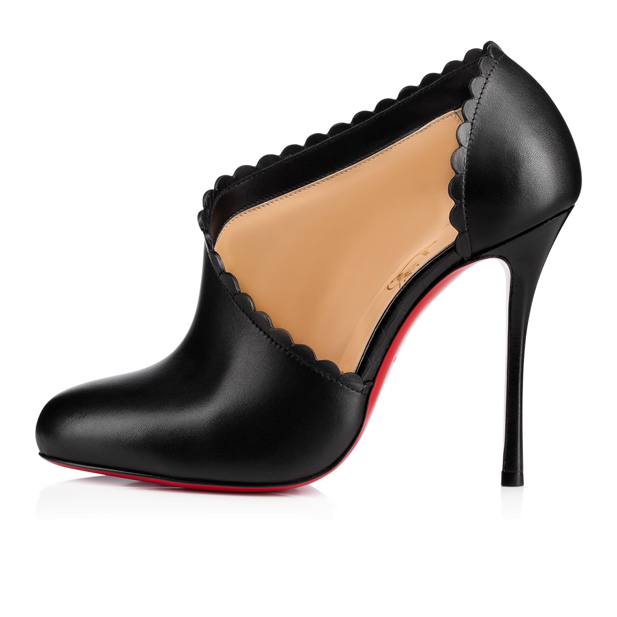 Treat yourself to a feminine new staple with “Scalopo”. This half d’Orsay booty in black leather reveals the exterior side of the foot and is finished with a dainty scalloped rim and 100mm stacked heel.