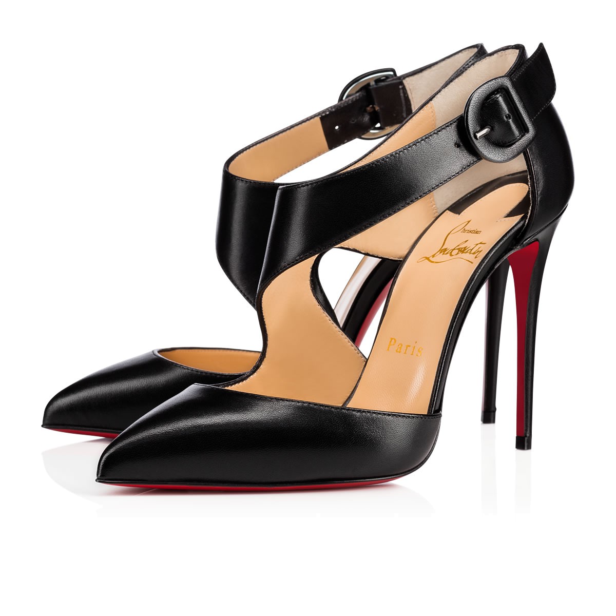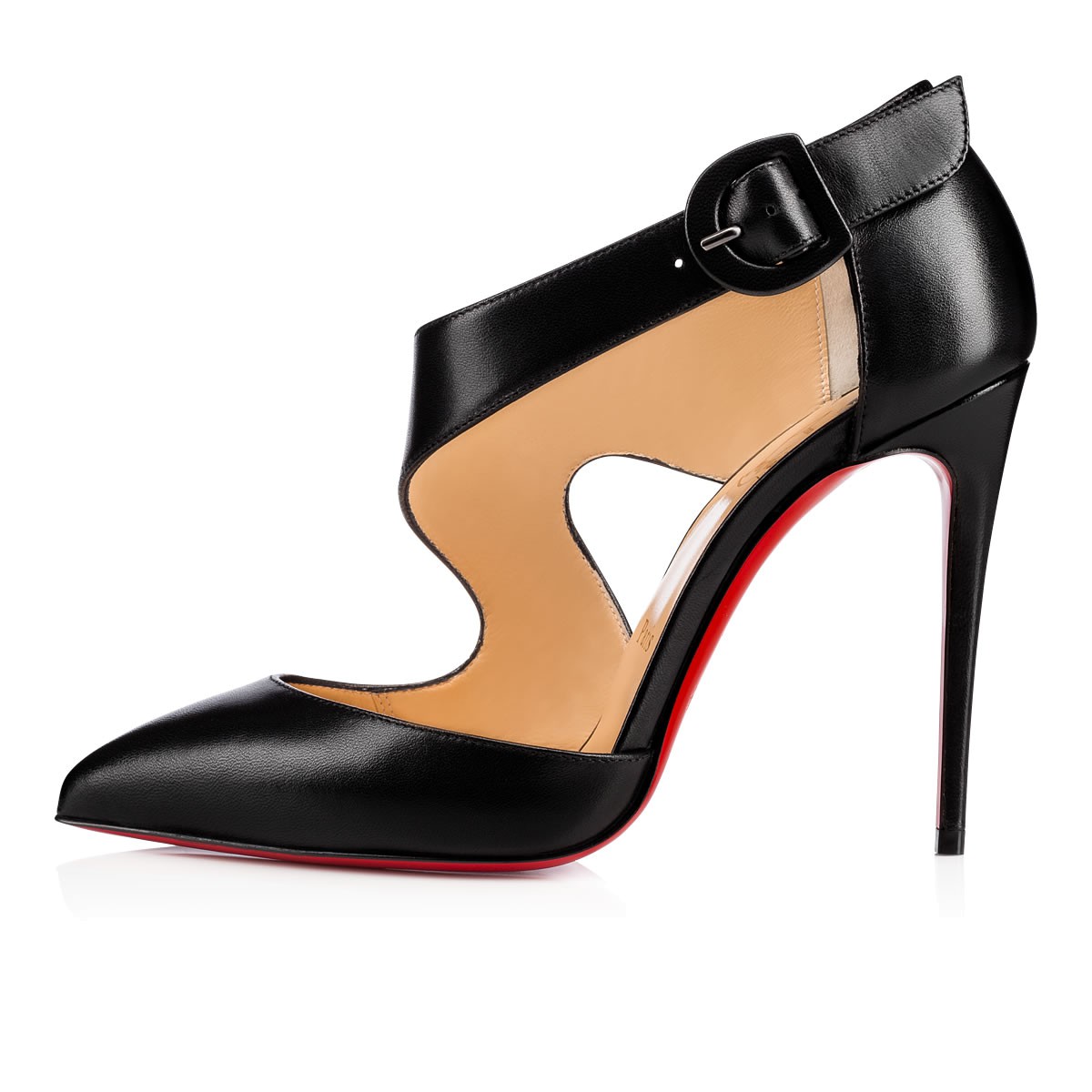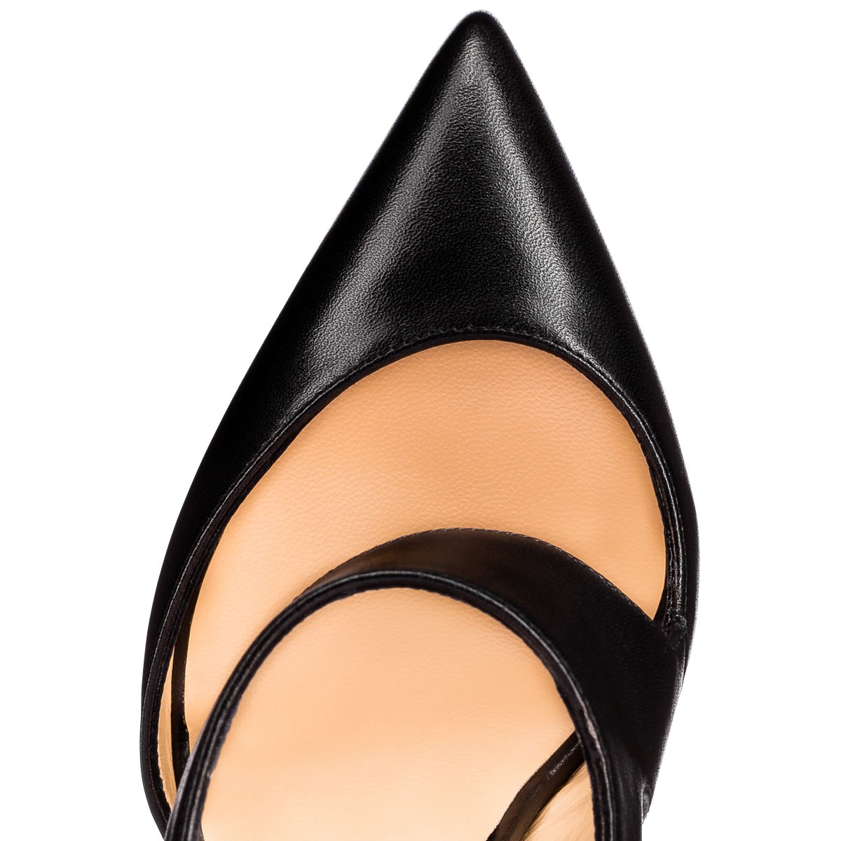 “Sharpeta” exudes confidence with its pointed toe and reimagined half d’Orsay silhouette. With a cutout at the instep and exposed exterior side, this 100mm style in lustrous black leather is finished with a chic covered buckle strap.