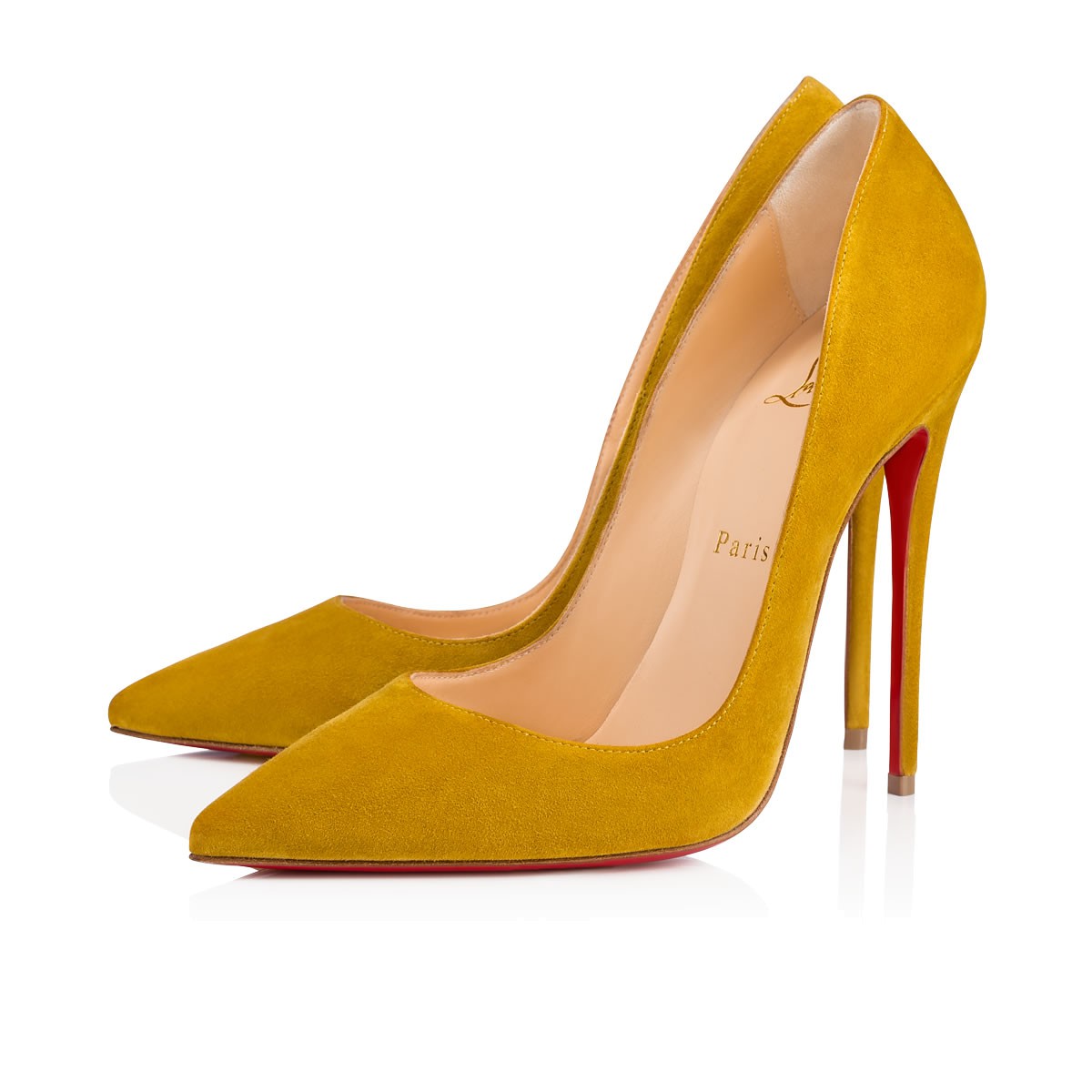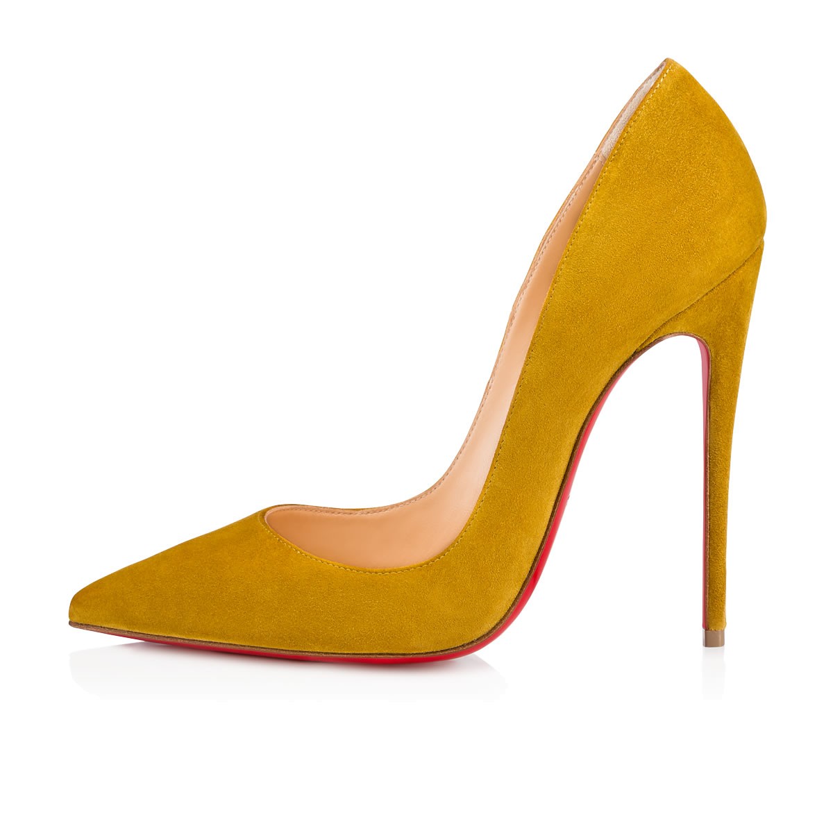 “So Kate” is a Christian Louboutin signature style known for her pointed toe and superfine stiletto heel. At 120mm, this single-sole pump in liquer suede is an intoxicating statement shoe.