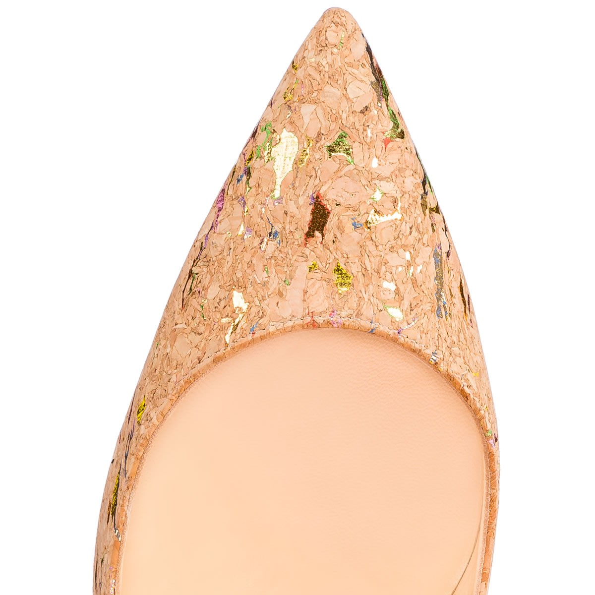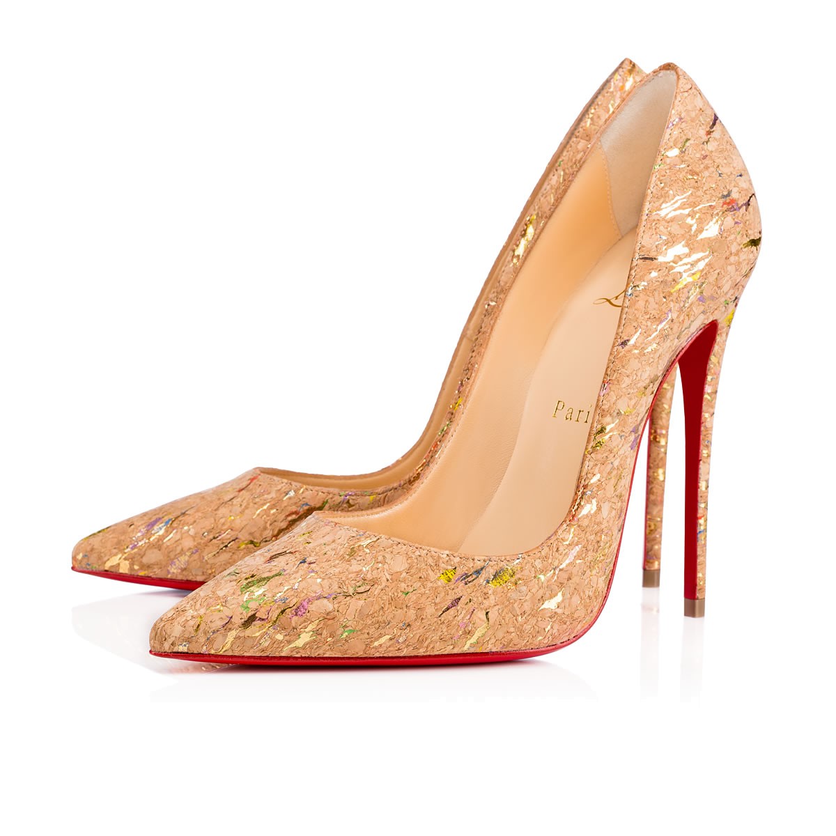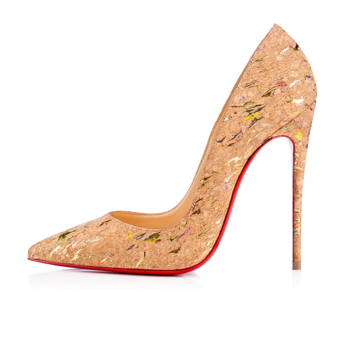 “So Kate” is a Christian Louboutin signature style known for her pointed toe and superfine stiletto heel. At 120mm, this single-sole pump in exquisite lamé flecked cork is the secret to ensemble perfection.