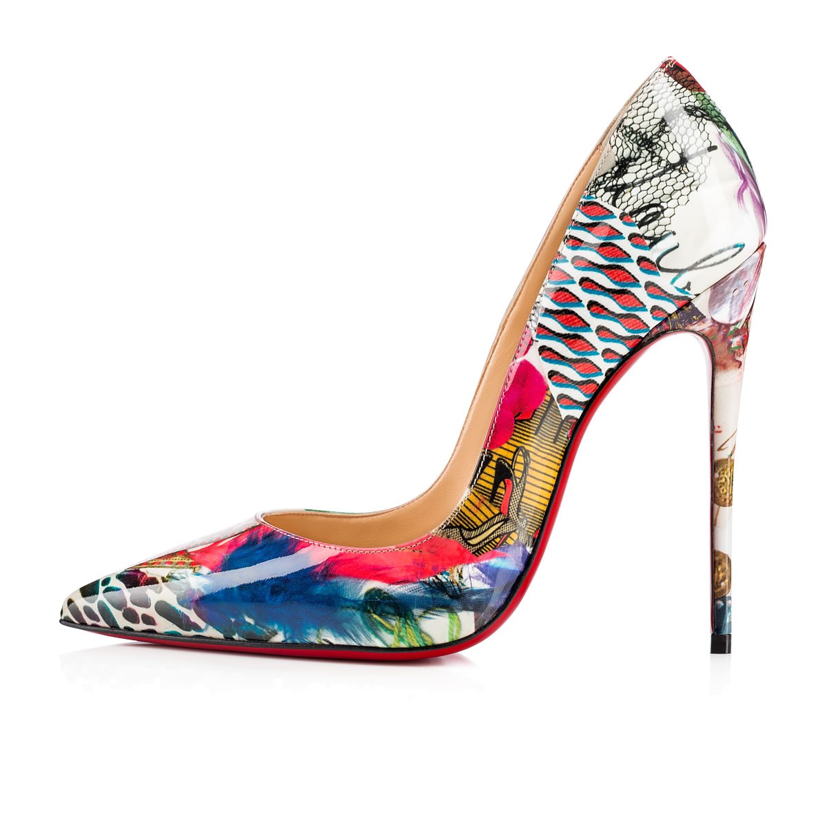 “So Kate” is a Christian Louboutin signature style known for her pointed toe and superfine stiletto heel. At 120mm, this single-sole pump in Louboutin pocket clutter ‘trash’ patent leather is an irresistible statement style this season.