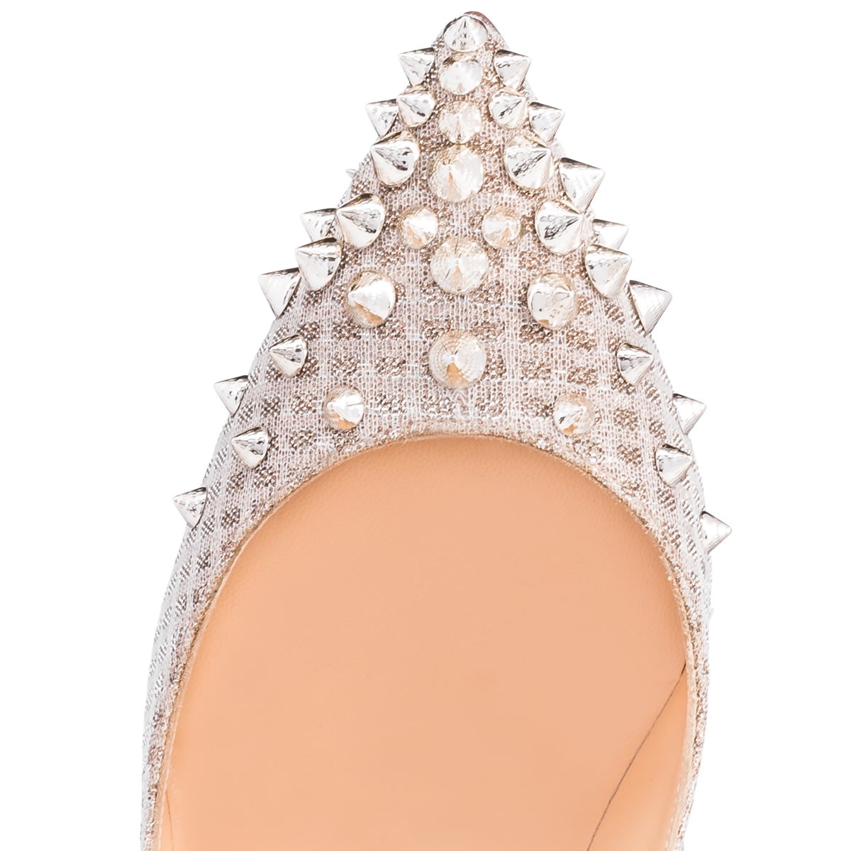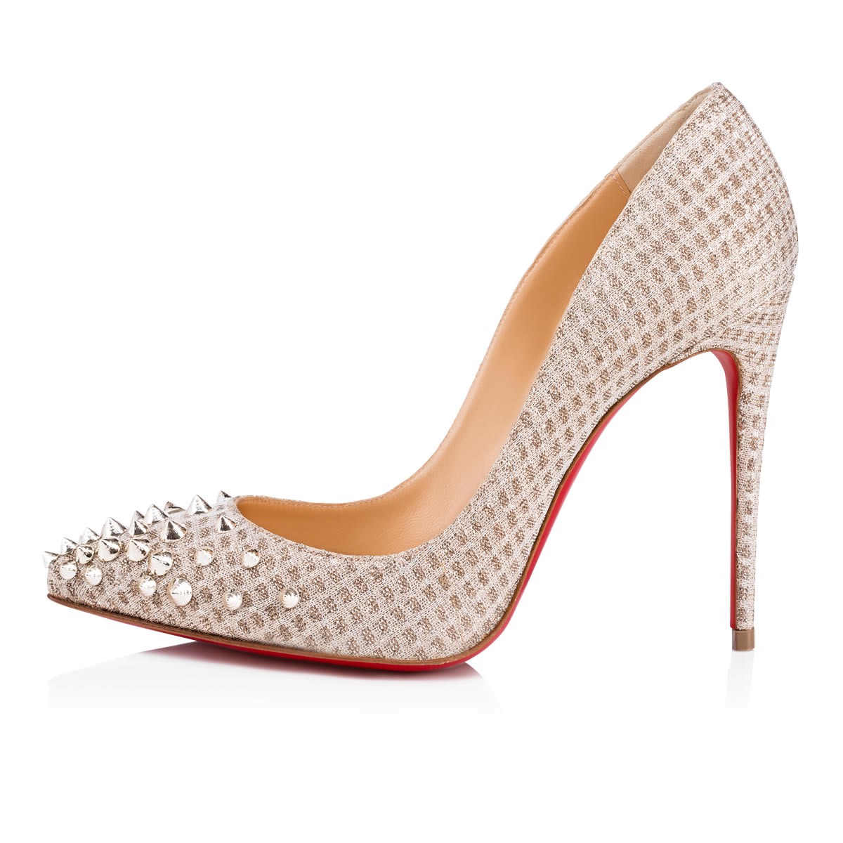 Adorned in a glamorous dégradé of this season’s white gold seashell engraved spikes, “Spikyshell” is a Spring/Summer beauty. This glamorous 100mm nude cross weave quadro lurex court shoe is built on the signature classic “Pigalle Follies” silhouette.