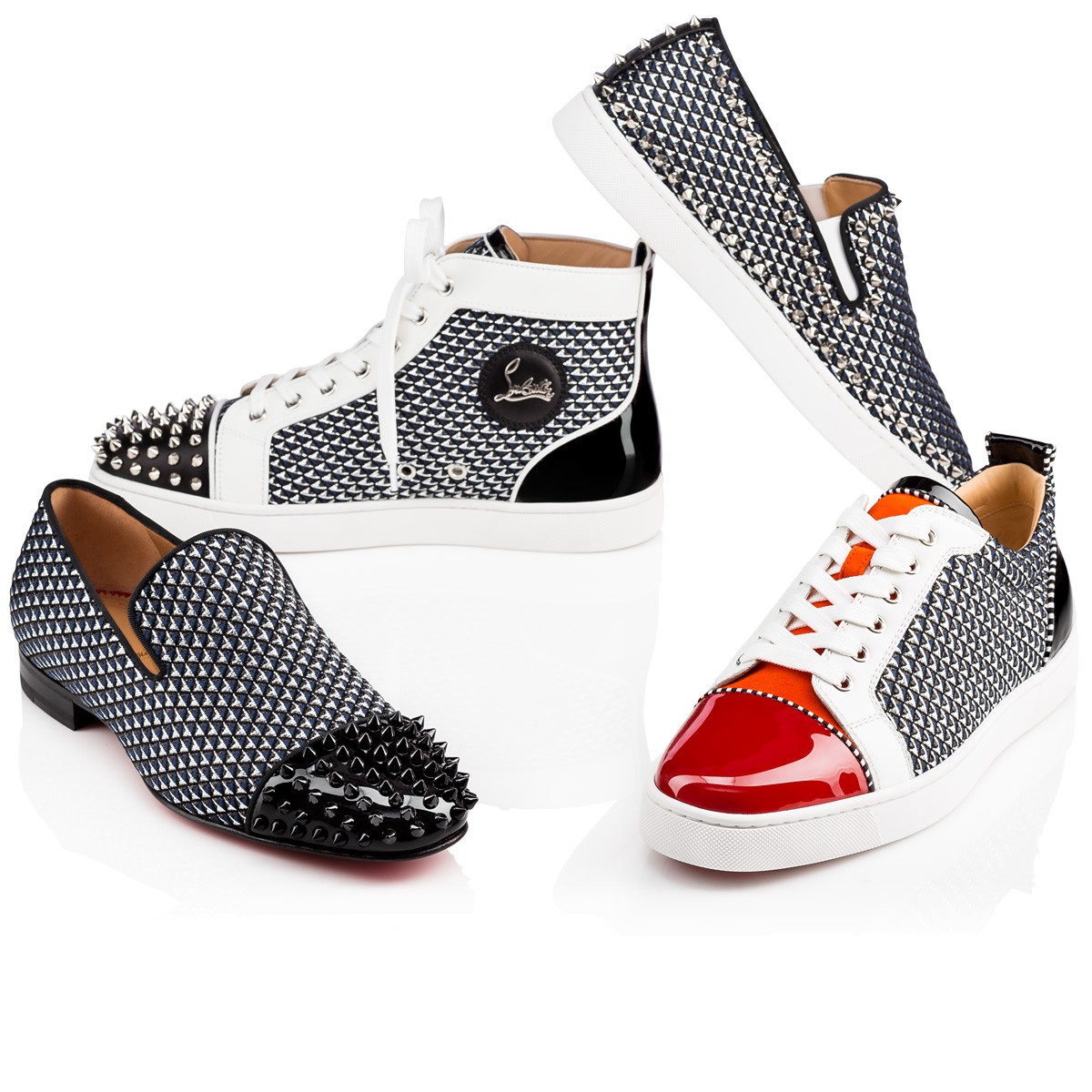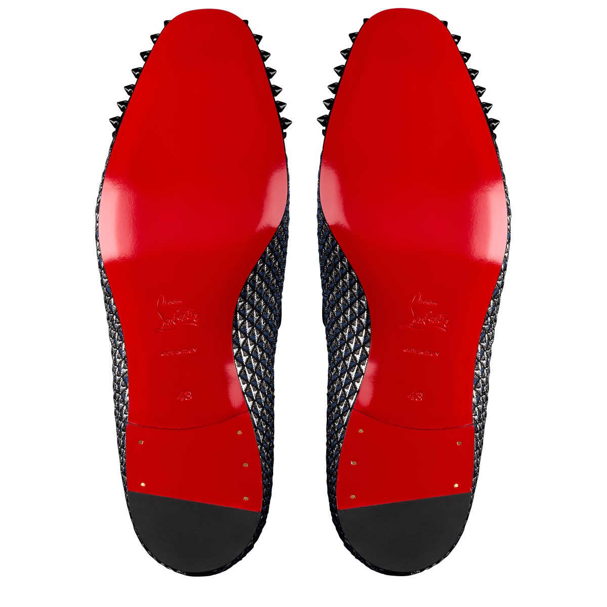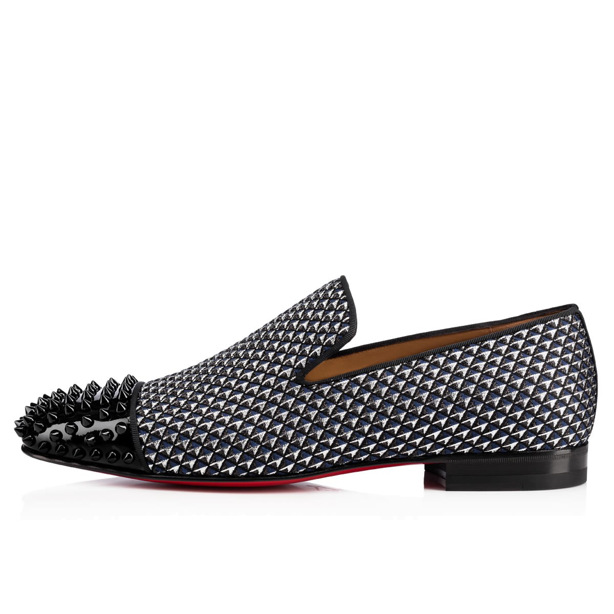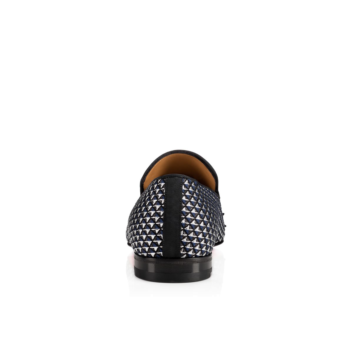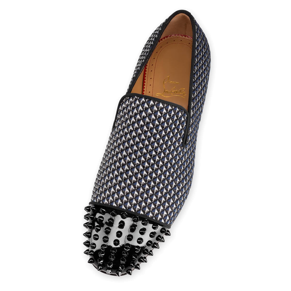 “Spooky Flat” reinvents a traditional gentleman’s shoe with an eruption of Christian Louboutin’s signature spikes. Add an element of surprise with this eye-catching blue and navy glitter pyramid smoking slipper.