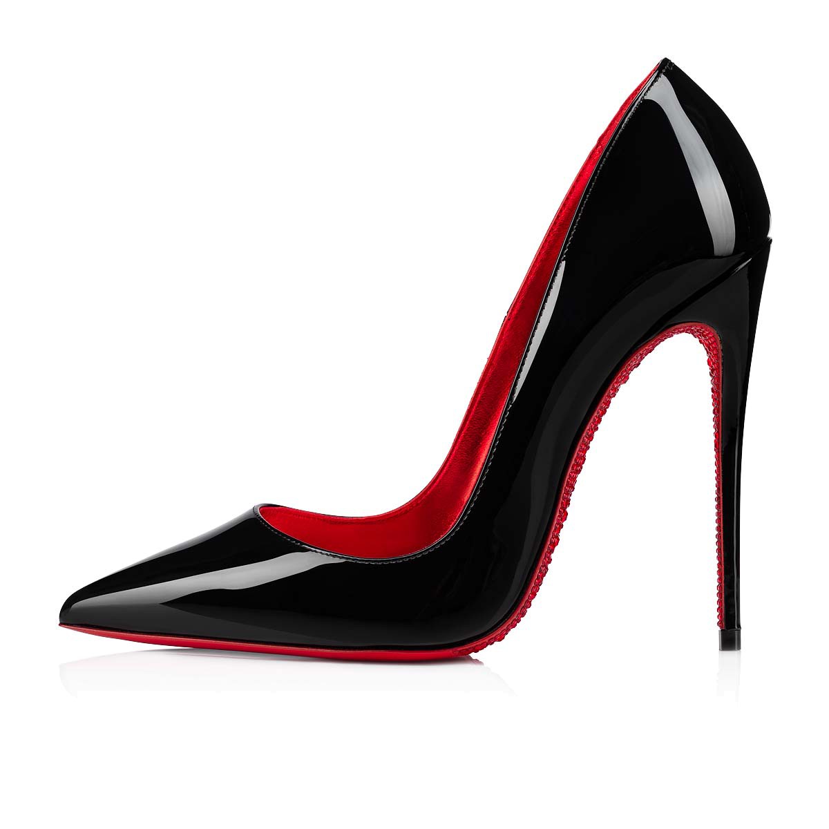 One of the most iconic mainstays of all Louboutin designs, the So Kate Suola is a reinterpretation of the classic So Kate pump with a towering 120 mm stiletto heel and low-cut vamp. This season’s offering comes in patent leather, complimented with intricate invisible stitching. The pièce de résistance comes in the form of the Maison’s signature red sole, reworked with hand-placed tonal strass details.
