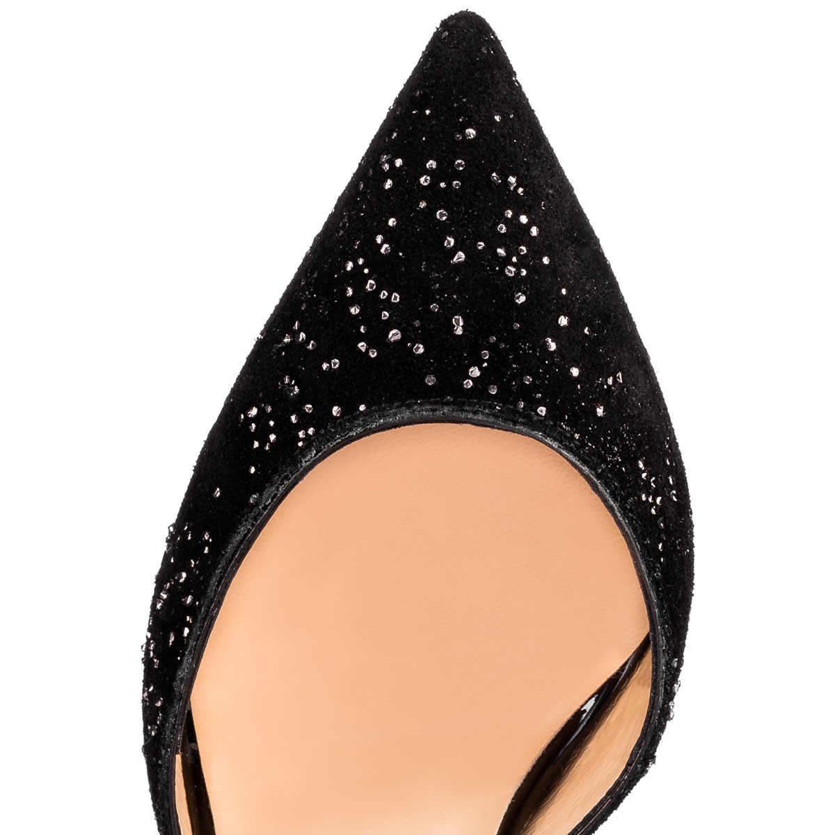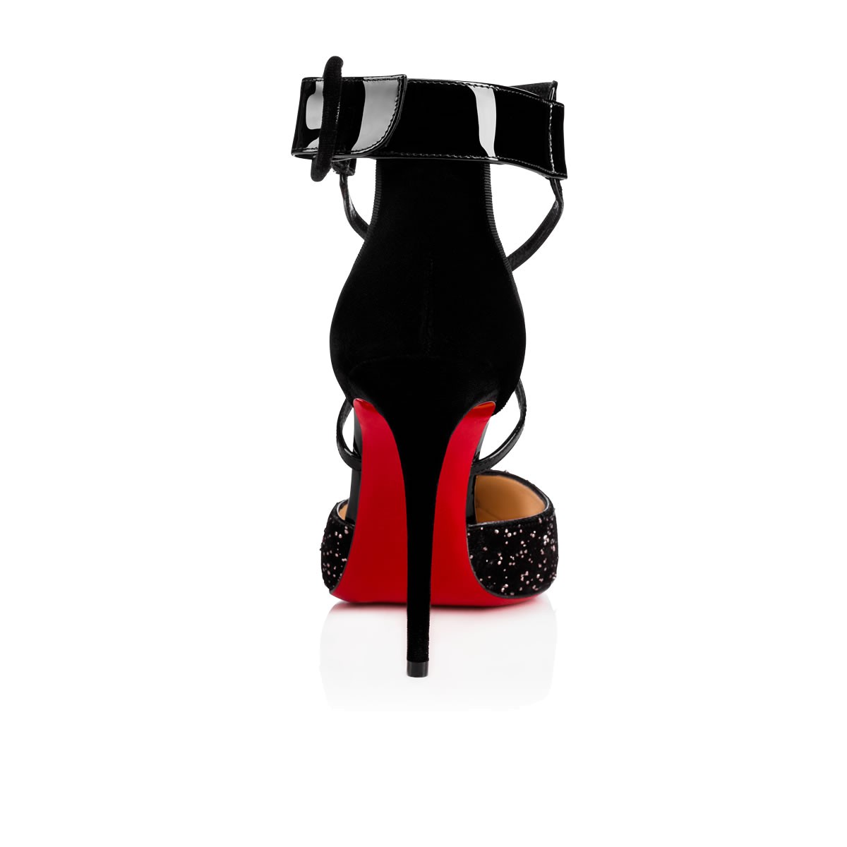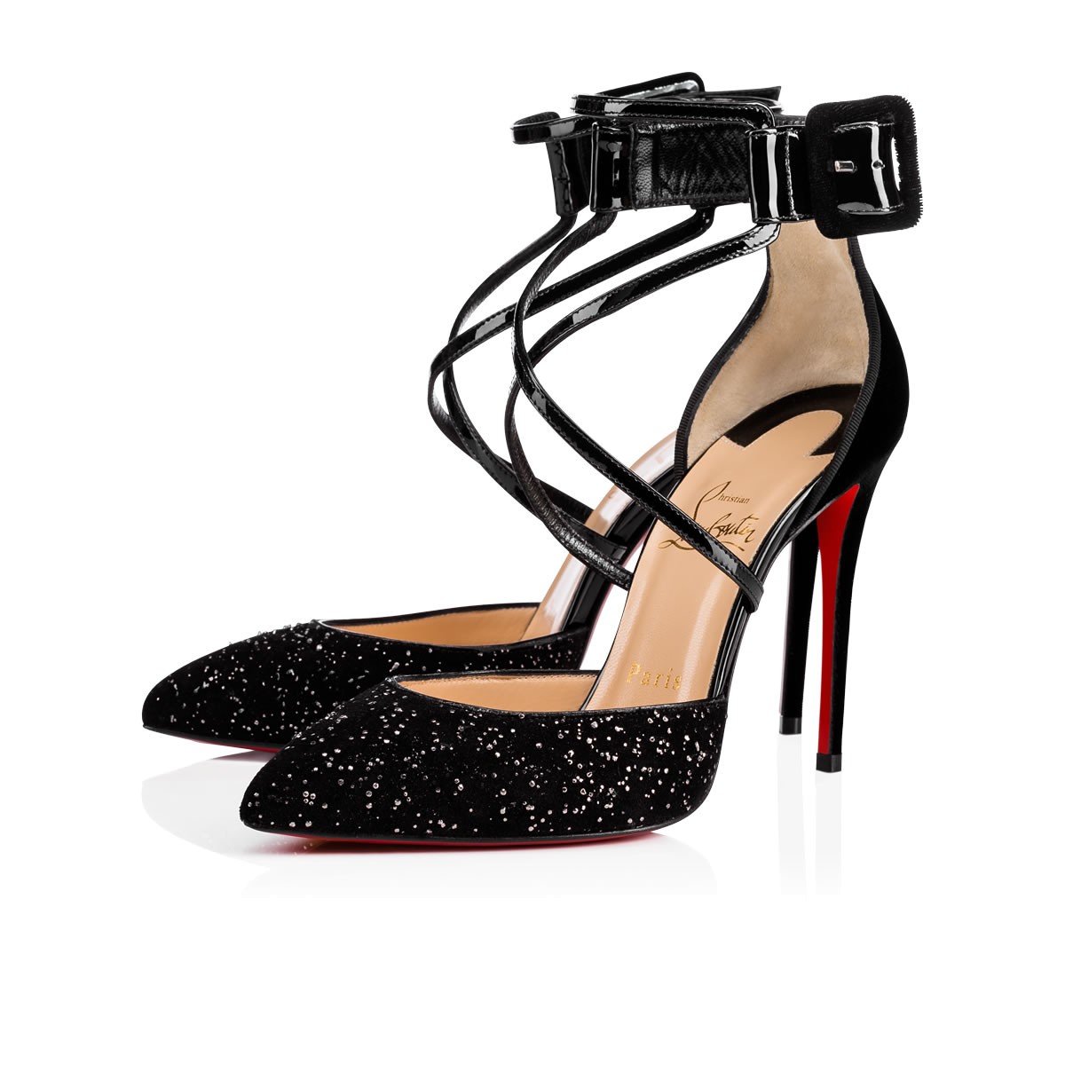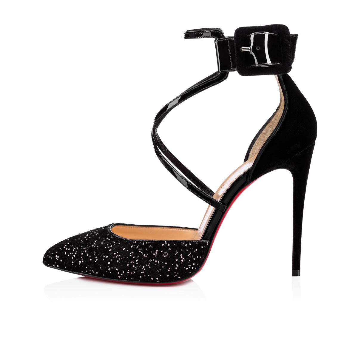 “Suzanna” pushes boundaries with her striking architecture. In silver brass-flecked meteor crosta leather, patent and velvet, she blends a d’Orsay last with a flattering cross-over ankle strap feature. Her chic cutaway heel and covered buckle put the finishing touch on this singular 100mm pointed-toe style.