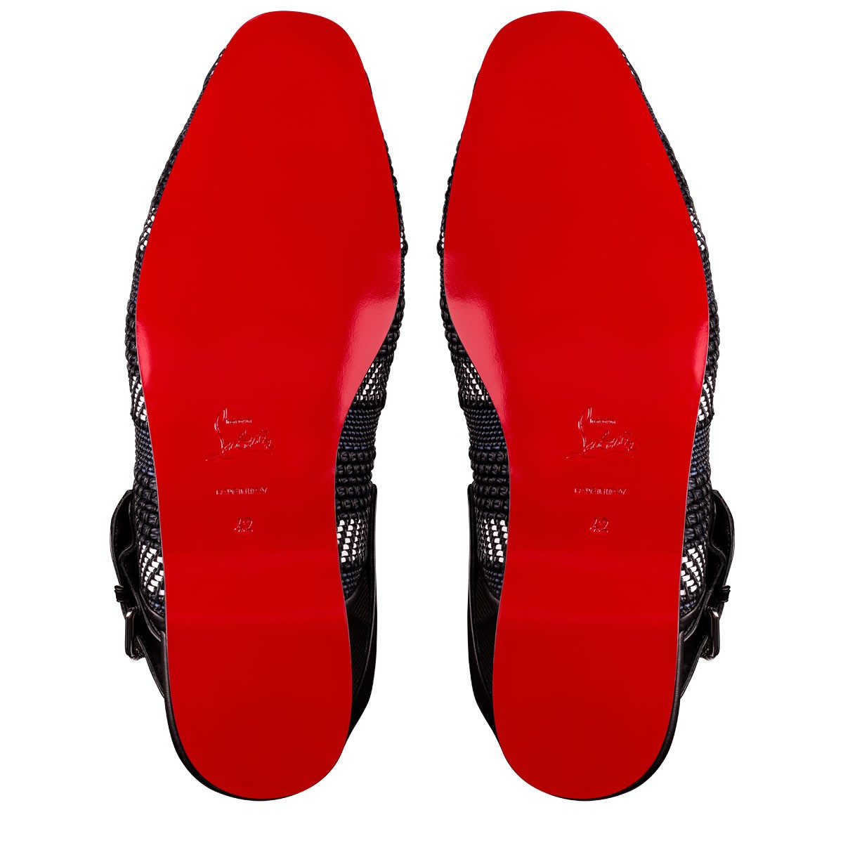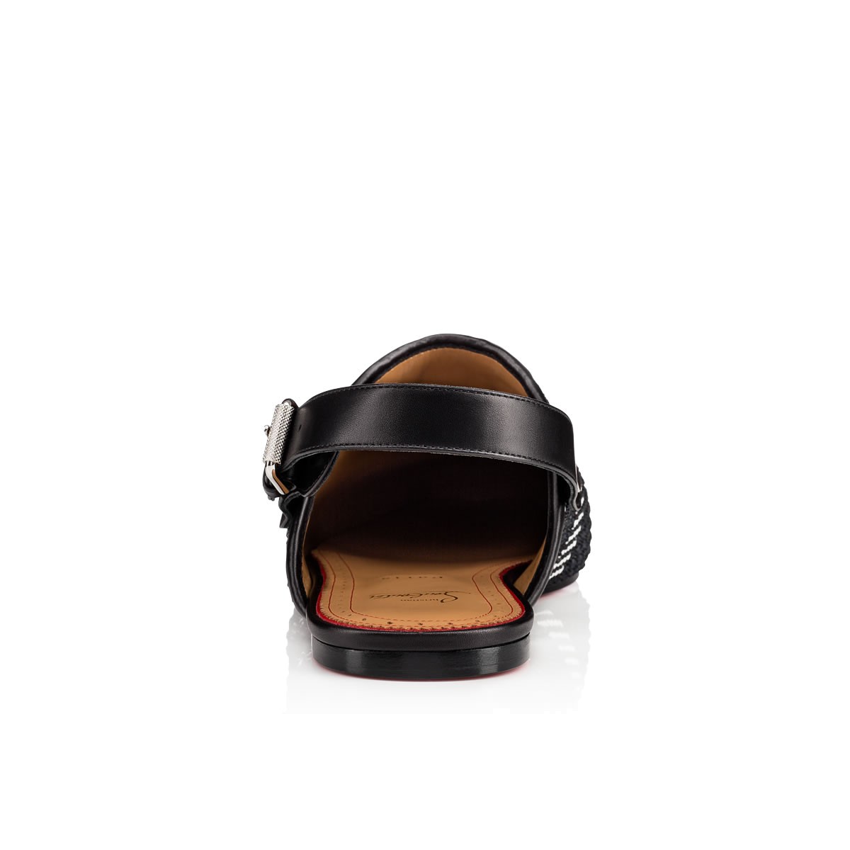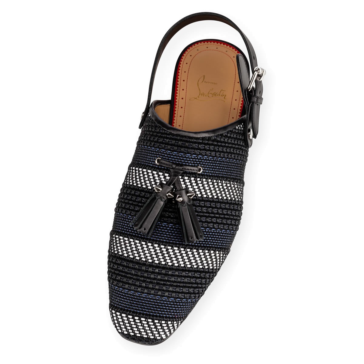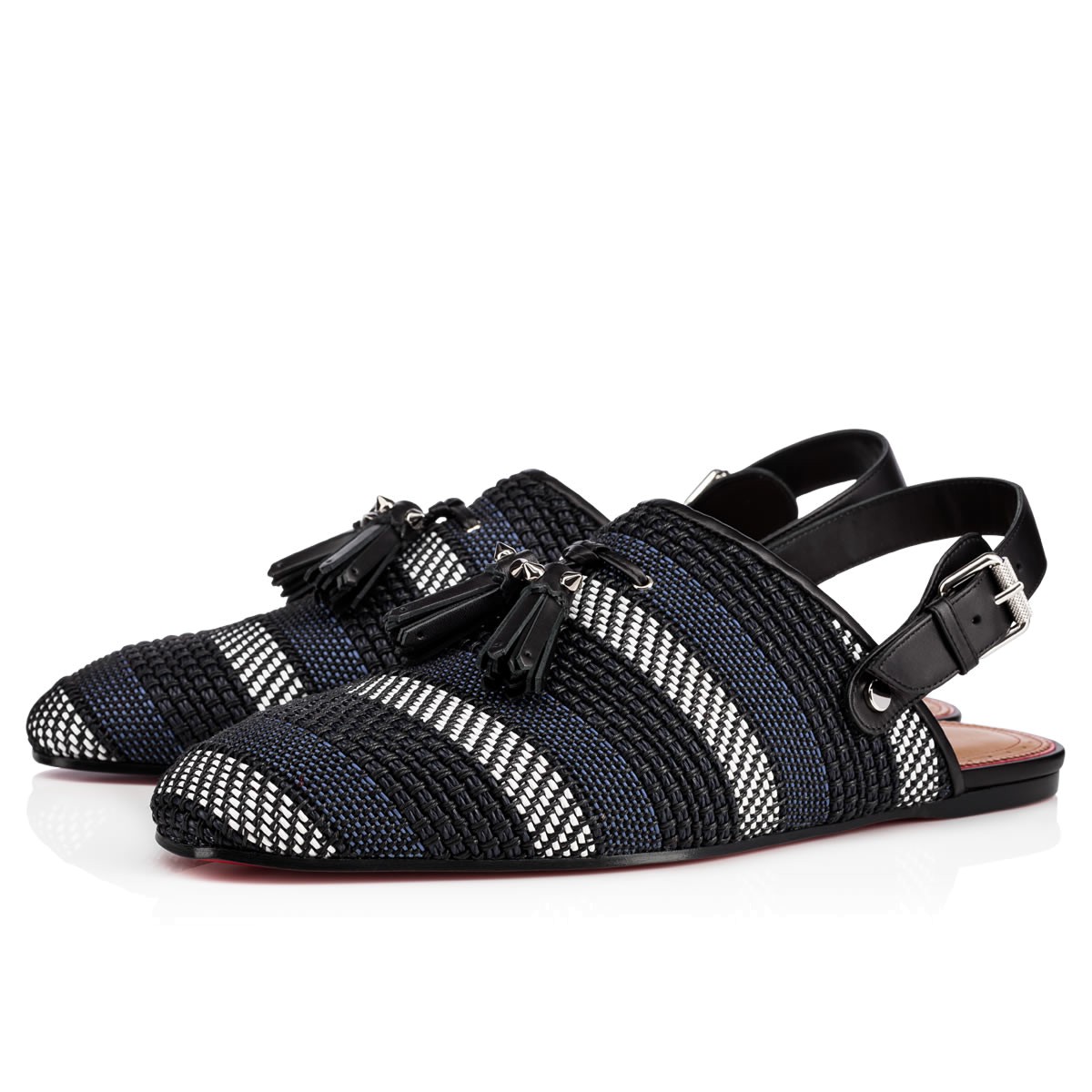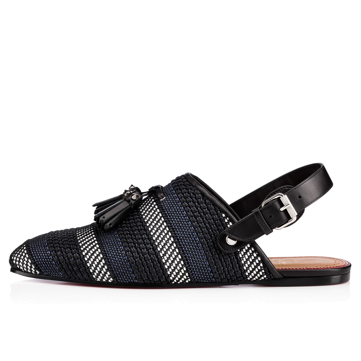 “Tarek Flat” is inspired by the traditional Moroccan slipper. In black and navy ‘tress bandita’ woven cotton, this luxurious laid-back style is finished with signature spiked tassels and a striated buckle strap at the heel.