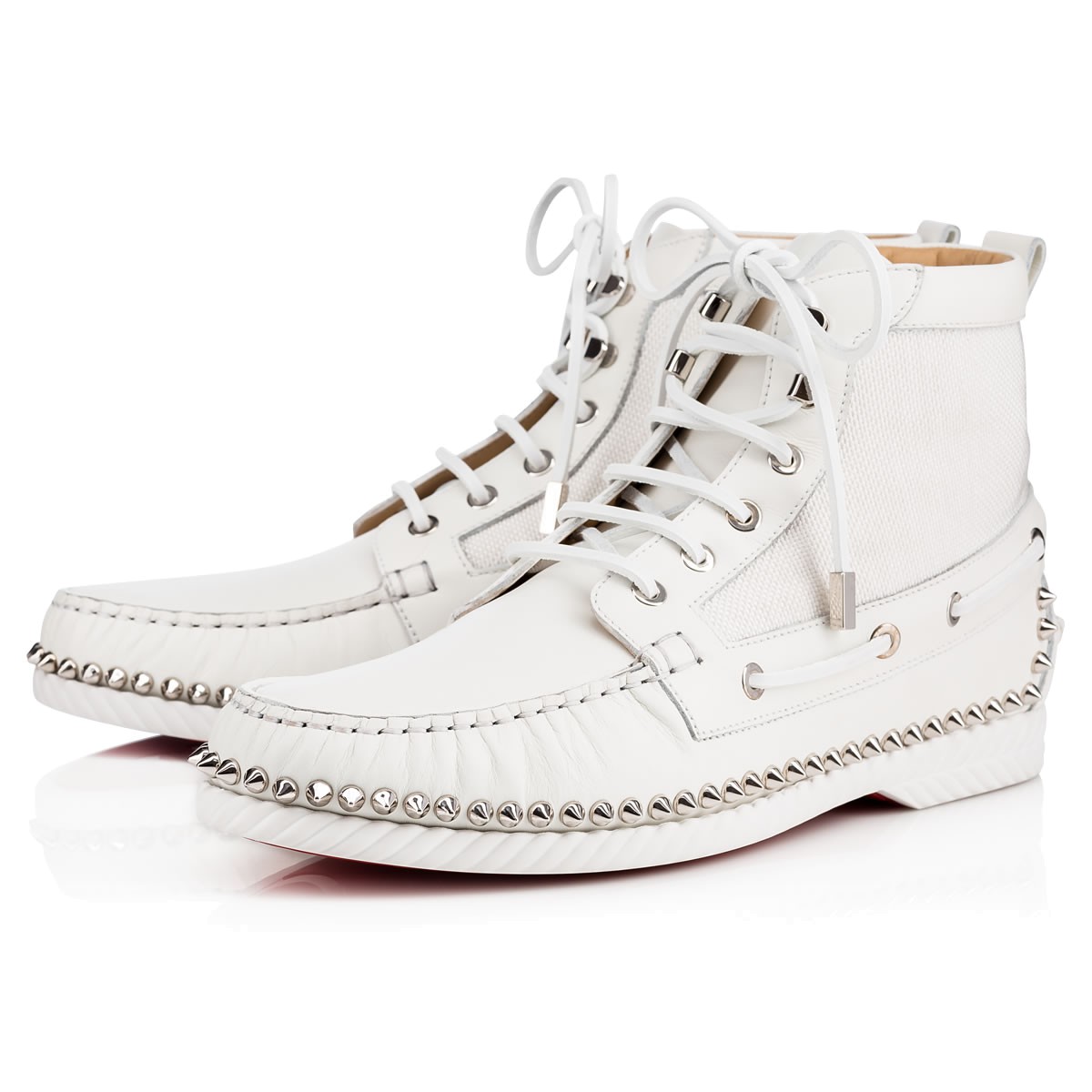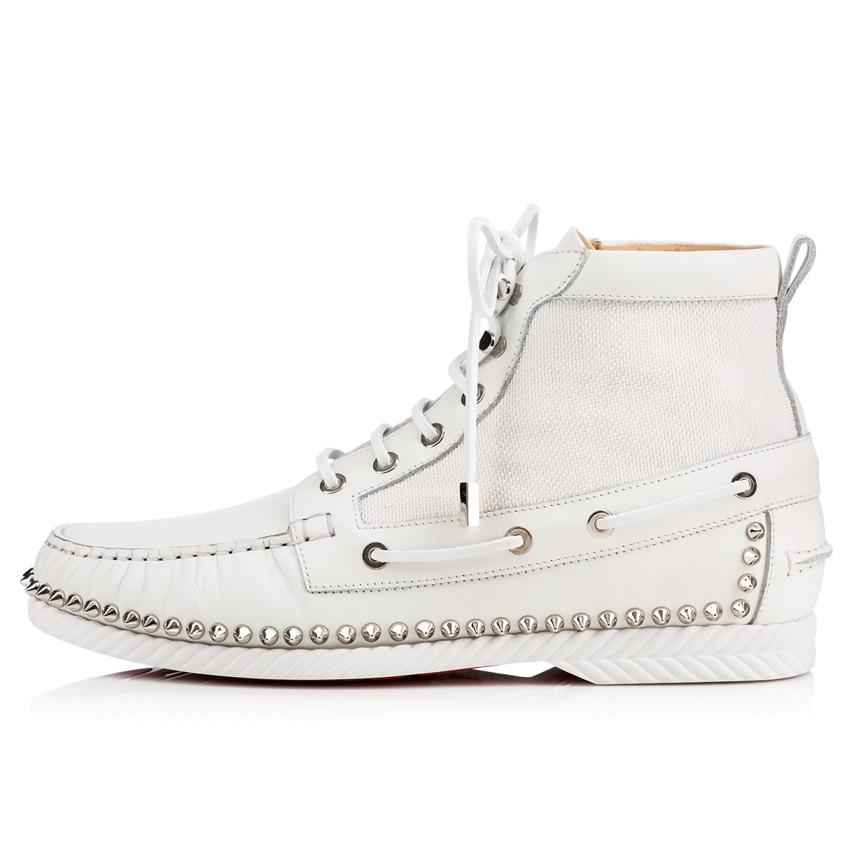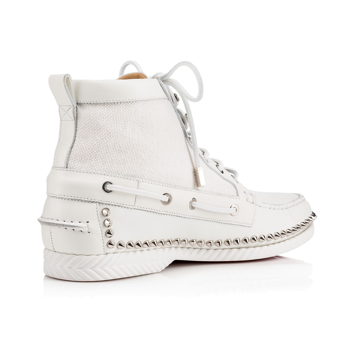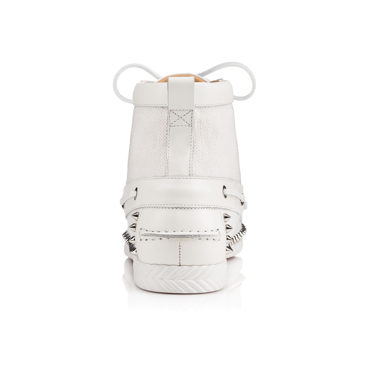 “Toronto Flat” combines a desert boot and a boat shoe into one irresistible Fall/Winter look. In a mix of ’tisse serre’ woven cotton and latte leather with signature spikes, this laid-back lace up is a sharp alternative to a sneaker.