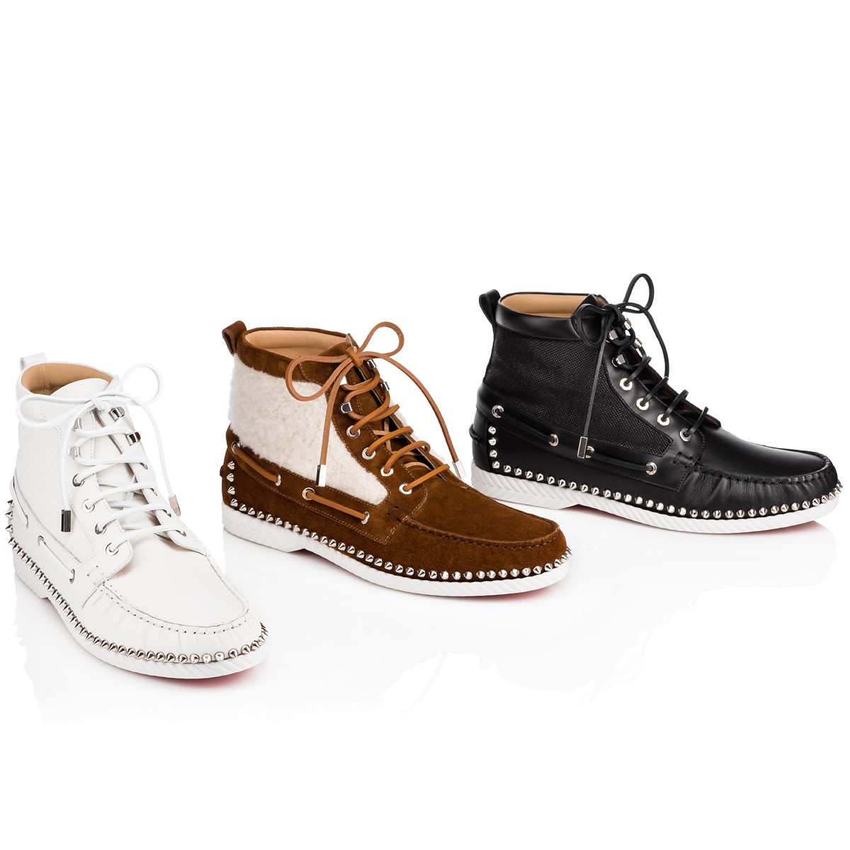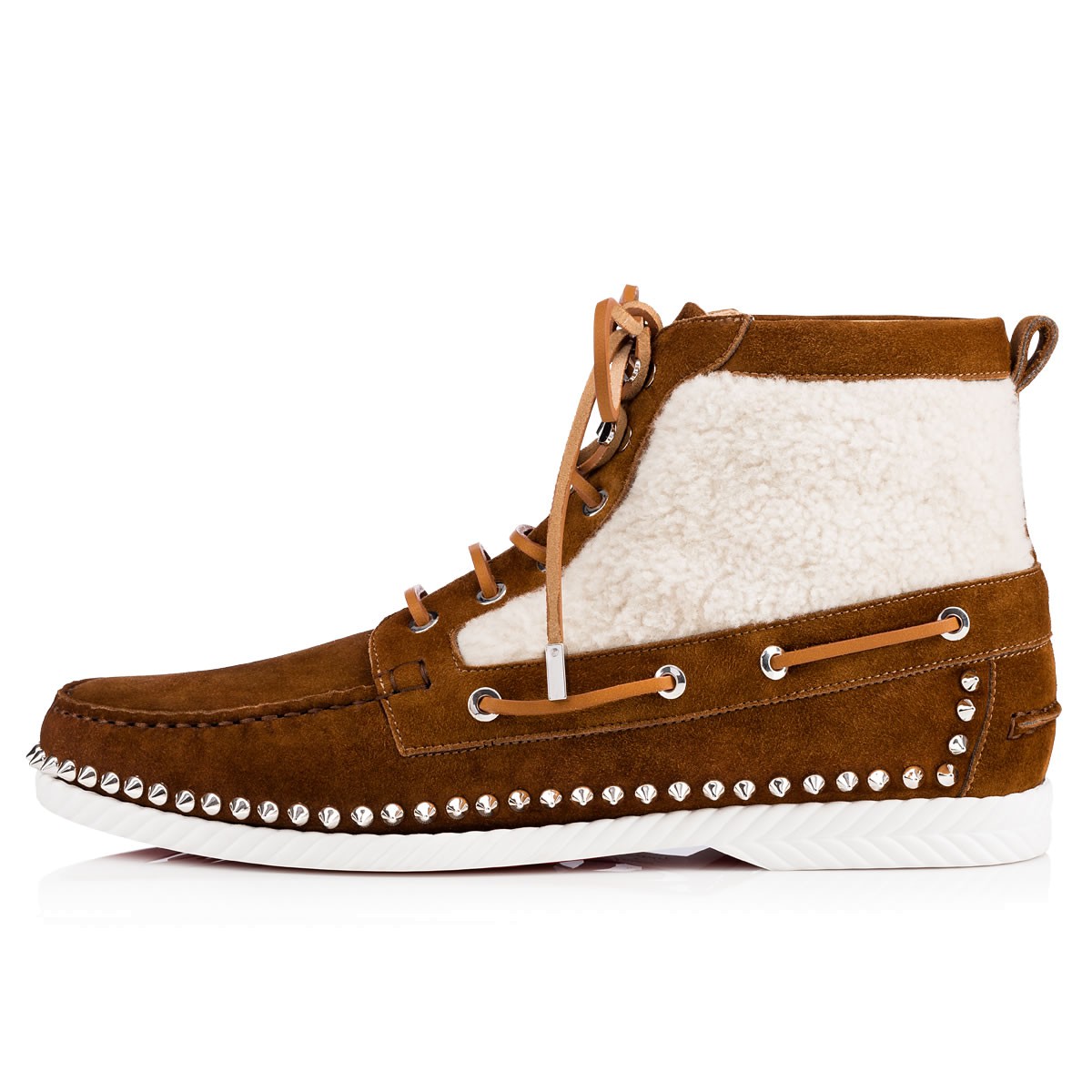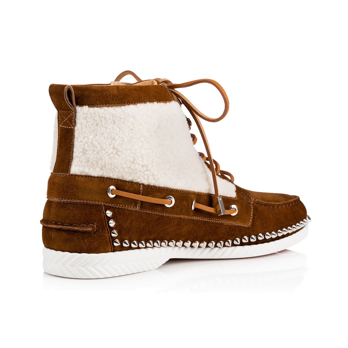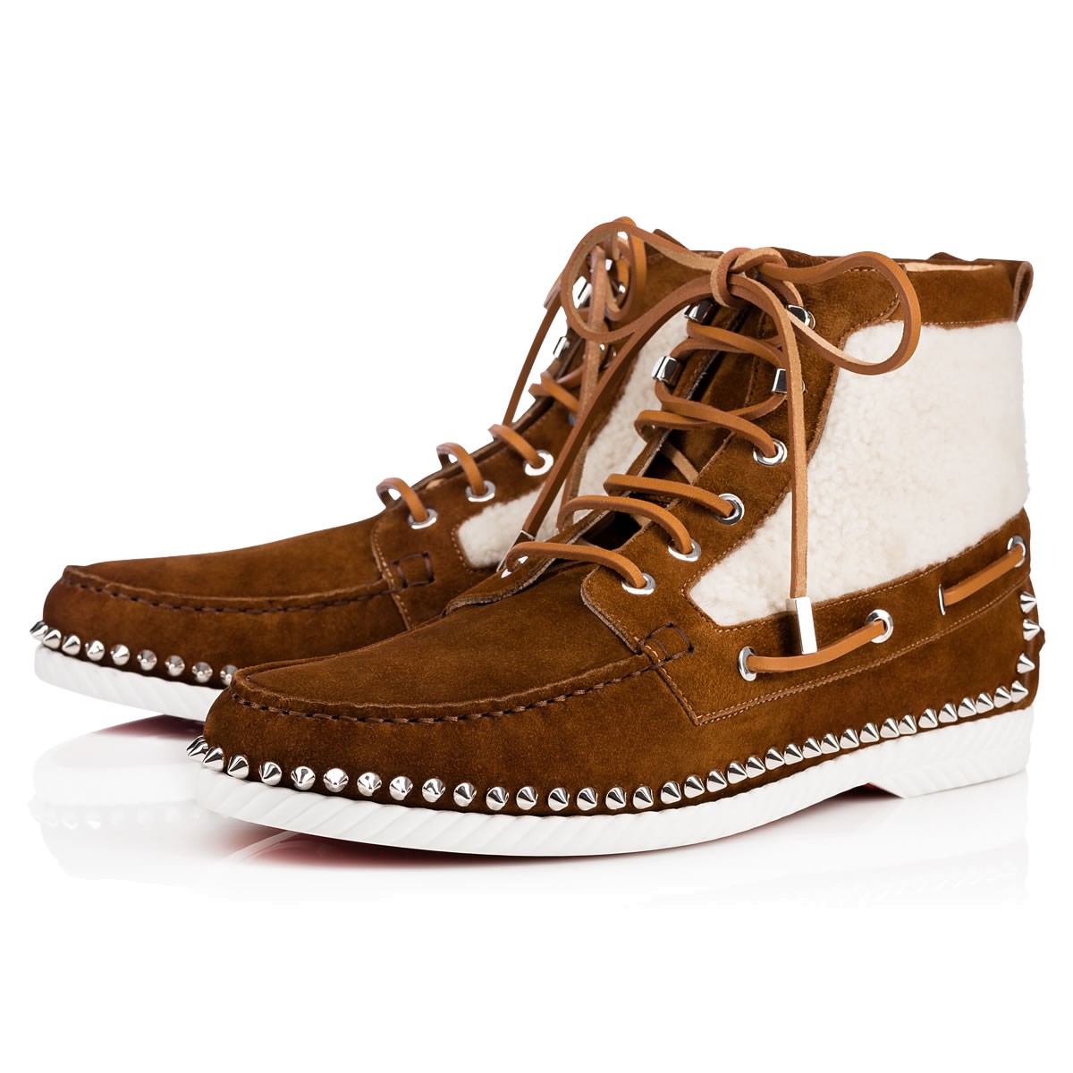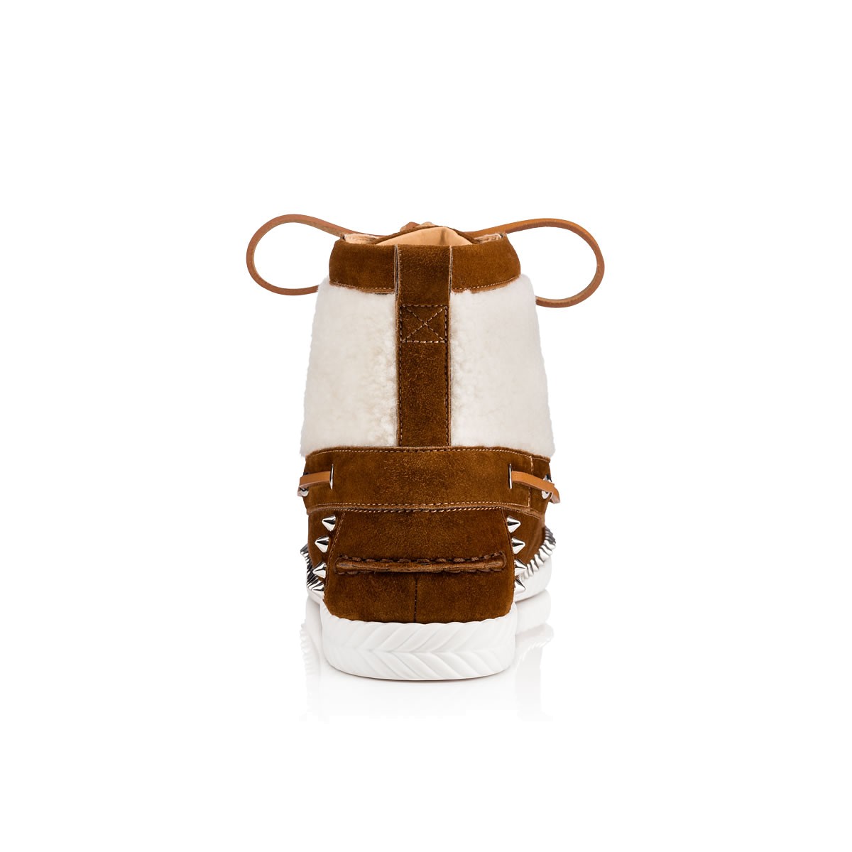 “Toronto Flat” combines a desert boot and a boat shoe into one irresistible Fall/Winter look. In a wintry mix of sheep shearling and nounours suede with signature spikes, this laid-back lace up is a sharp alternative to a sneaker.