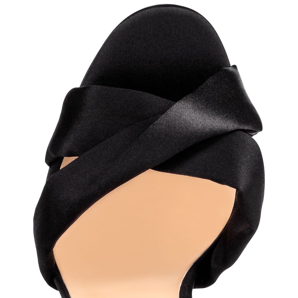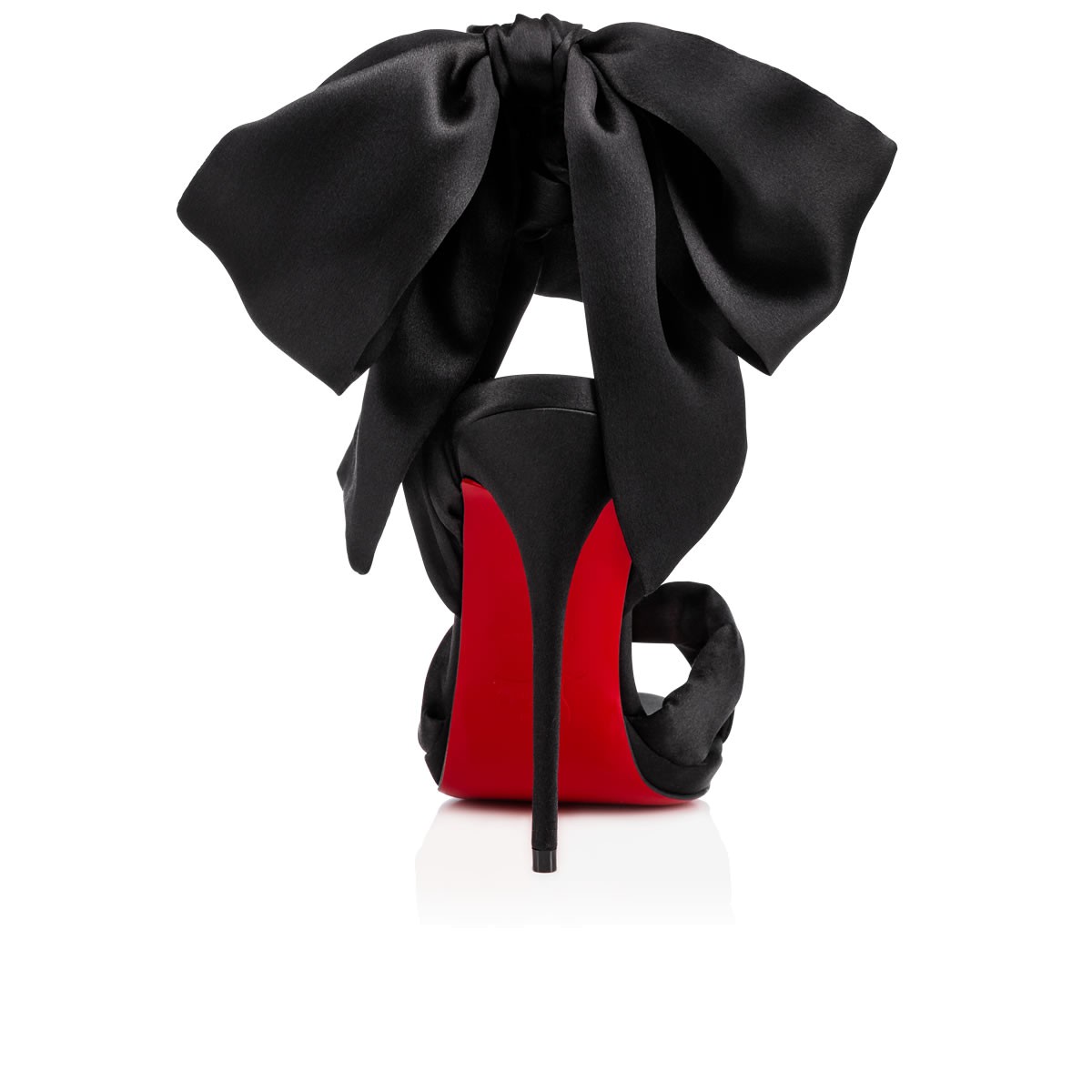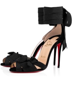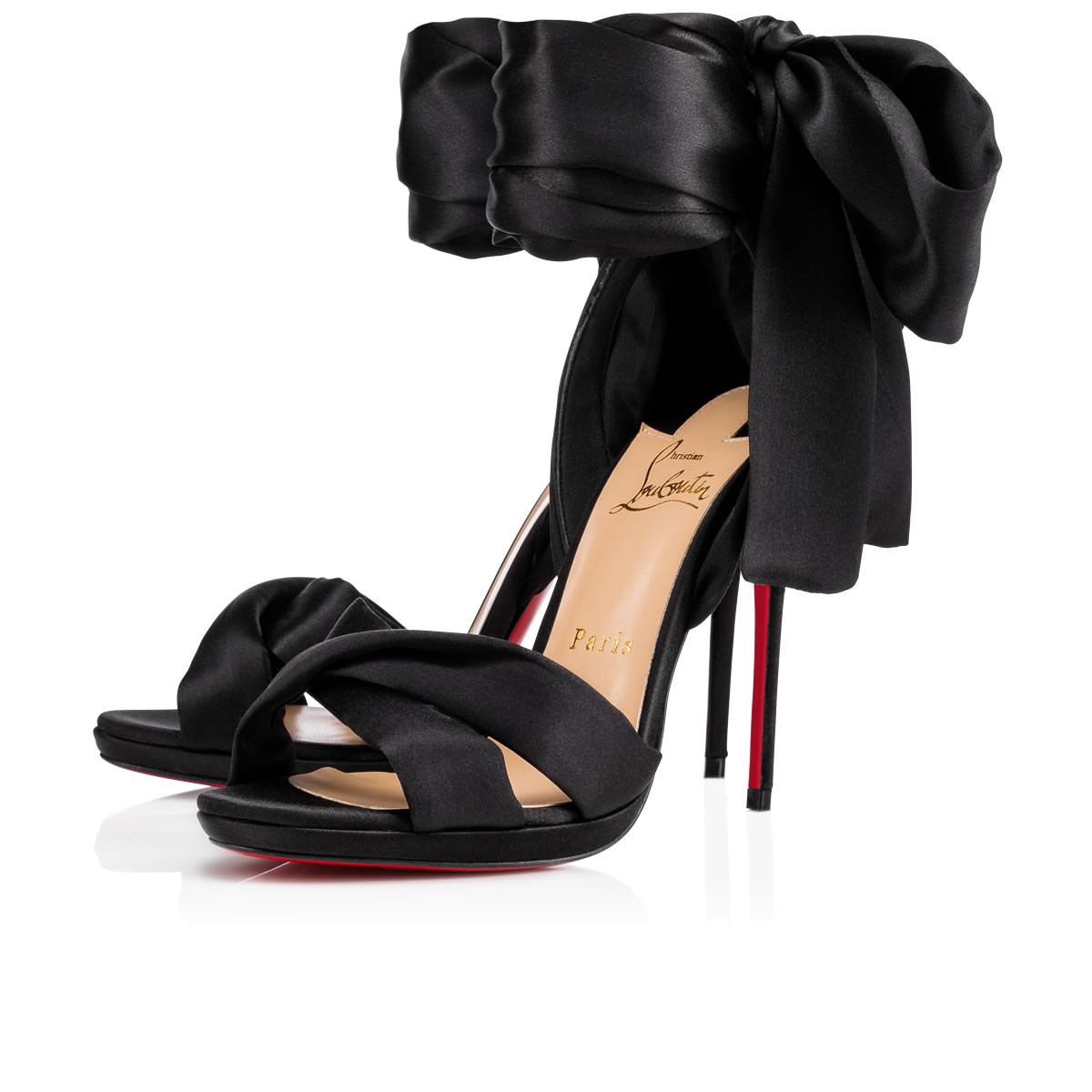 “Tres Frais” takes a fresh approach to feminine glamor. Inspired by Christian’s visit to a famous scarf maker in Venice, it features a crepe satin sash that wraps around the leg and ties abundantly behind the ankle. In all black, this 120mm sandal is an evening classic.