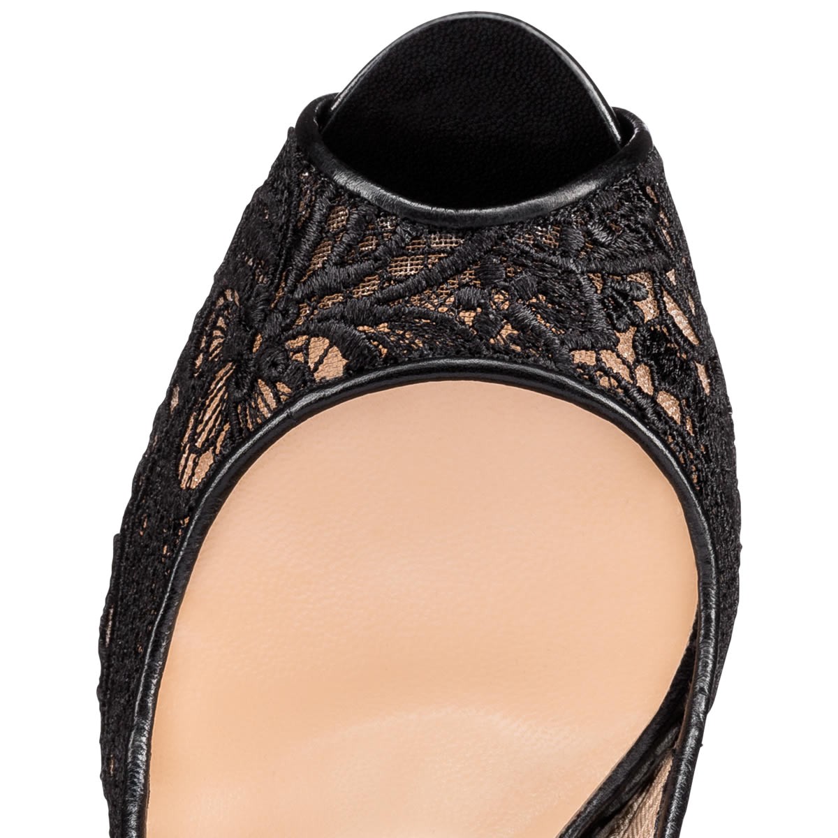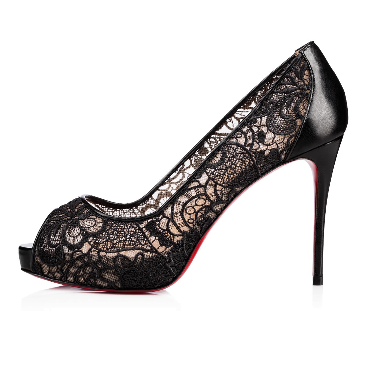In this season’s black floral print wax guipure lace, “Very Lace” epitomizes luxury. Finished with a 100mm leather spike heel, this platform peep toe pump perfects your daytime or evening glamor look.