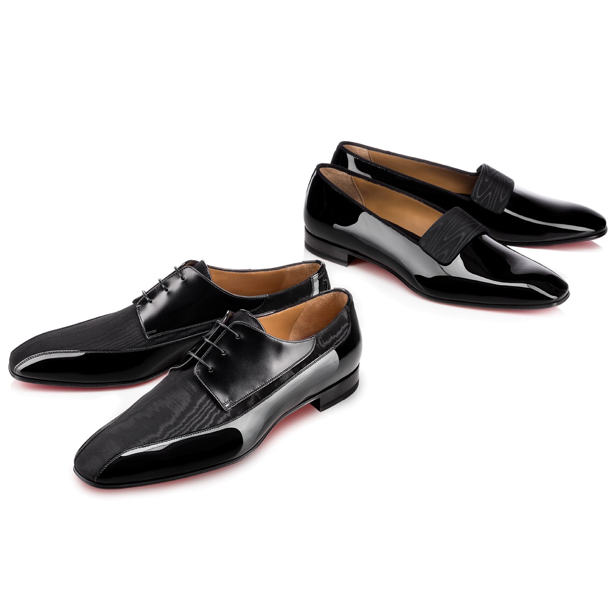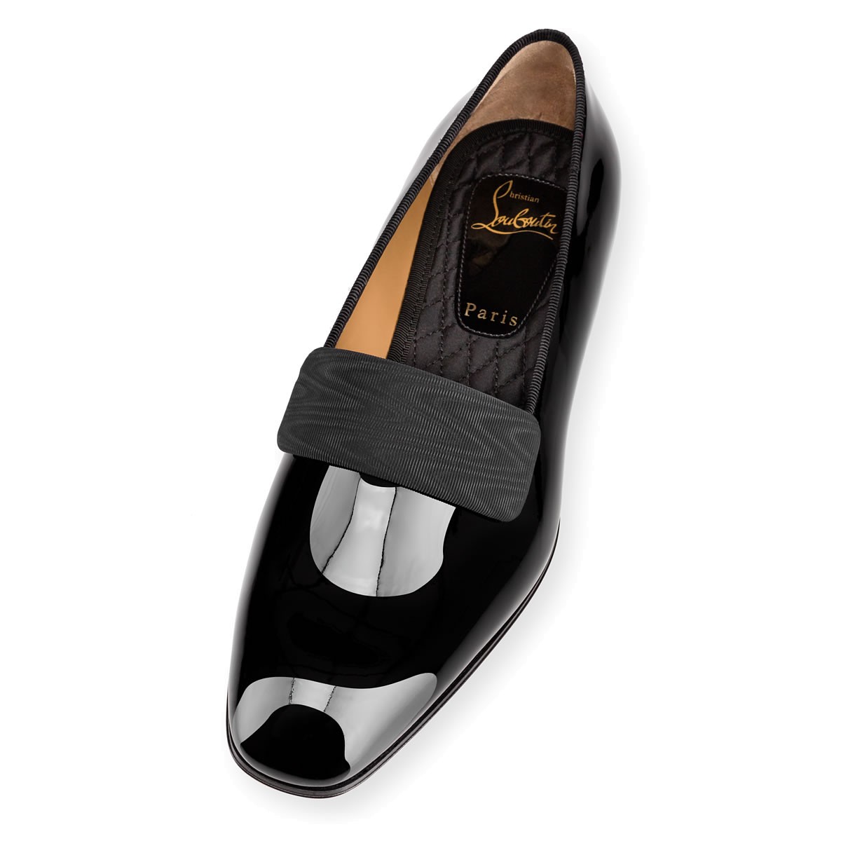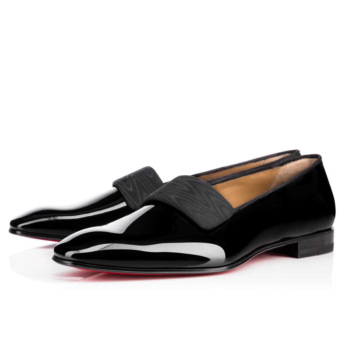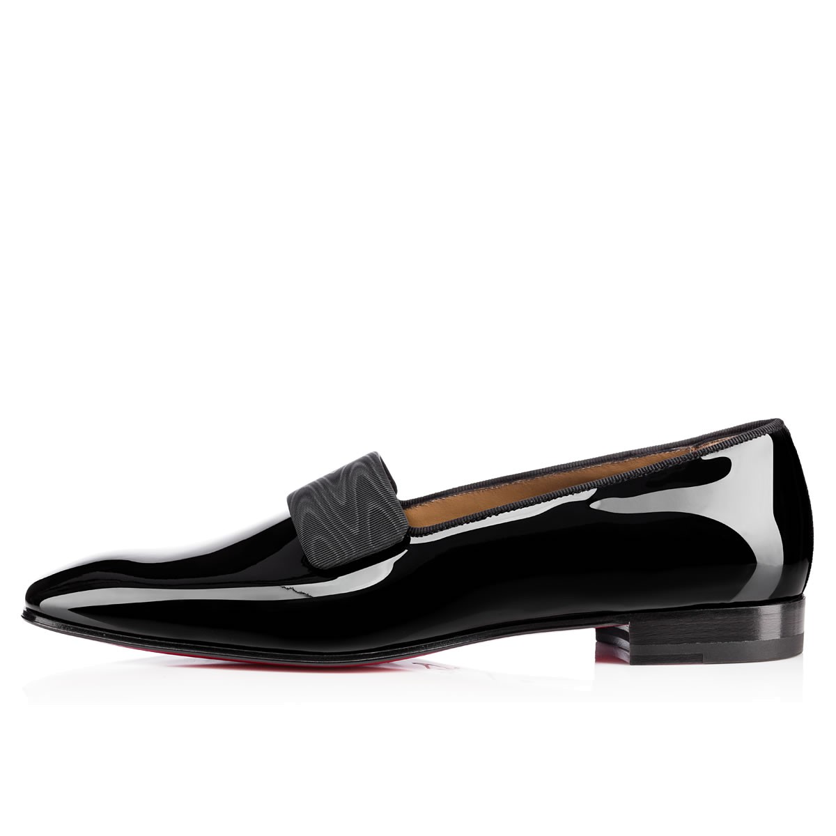 Rejuvenate your black tie looks with “Vittorio Flat”. This handsome smoking slipper in sleek black patent leather is finished with a refined moiré silk band detail that adds a sophisticated touch to this classic style.