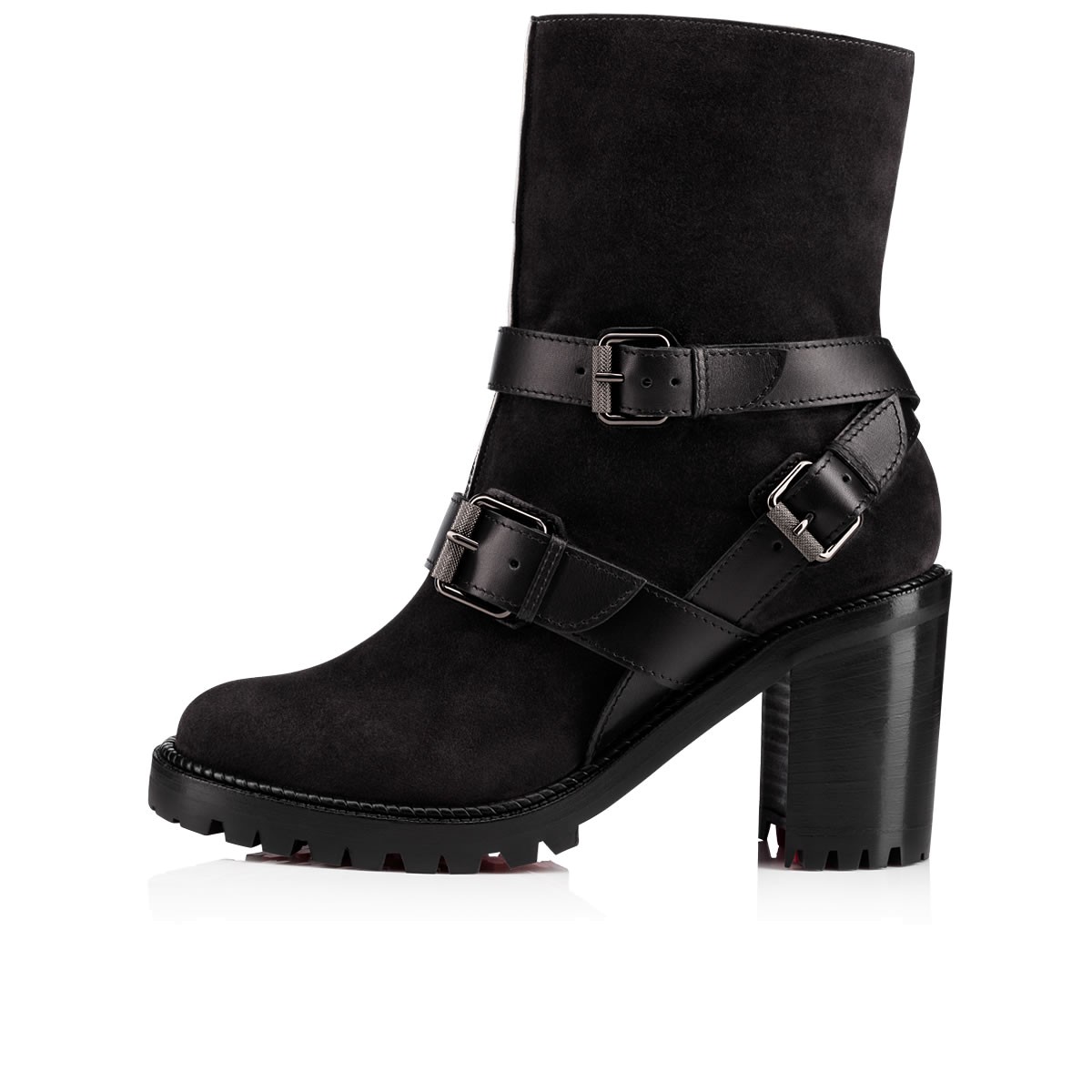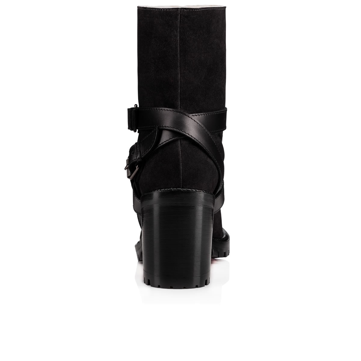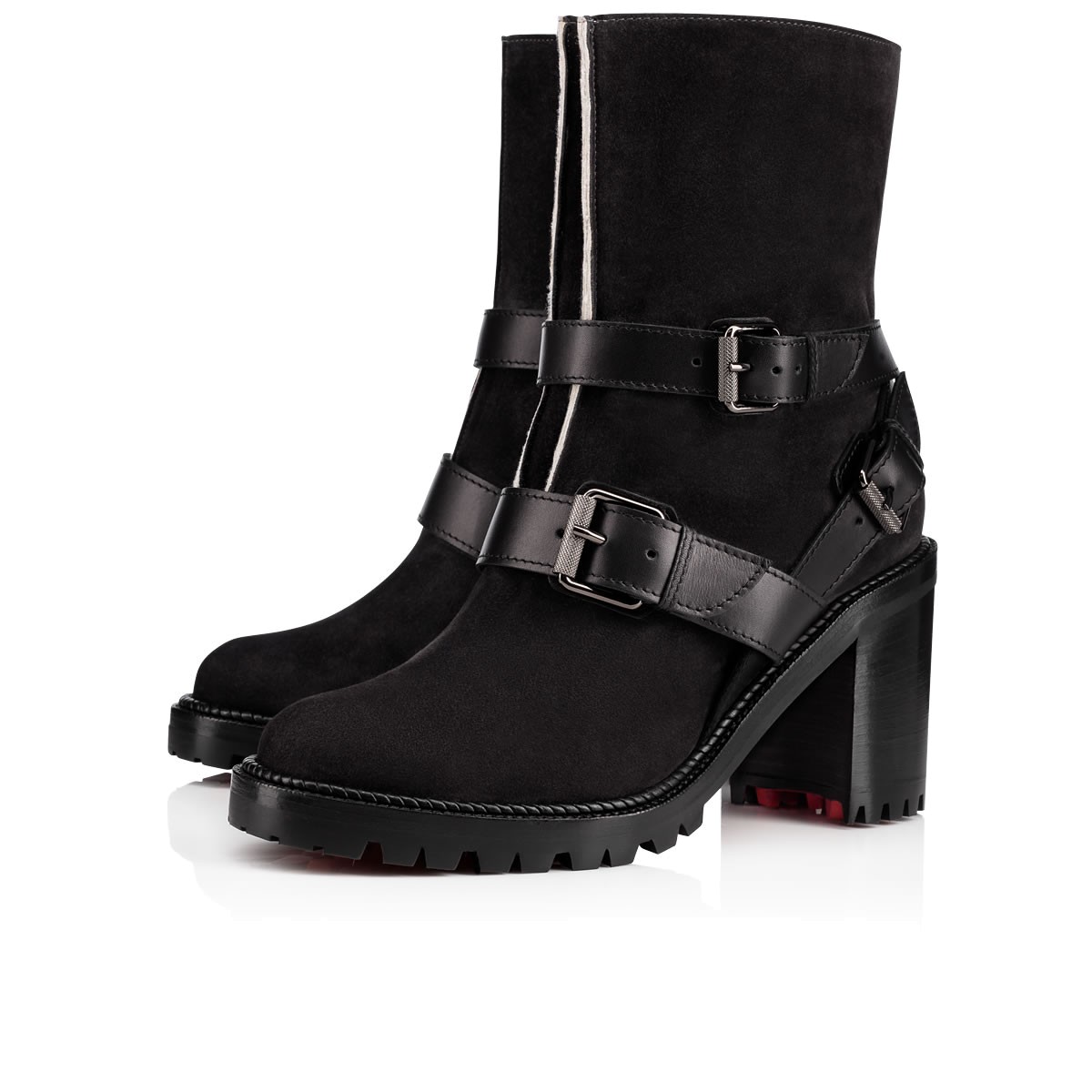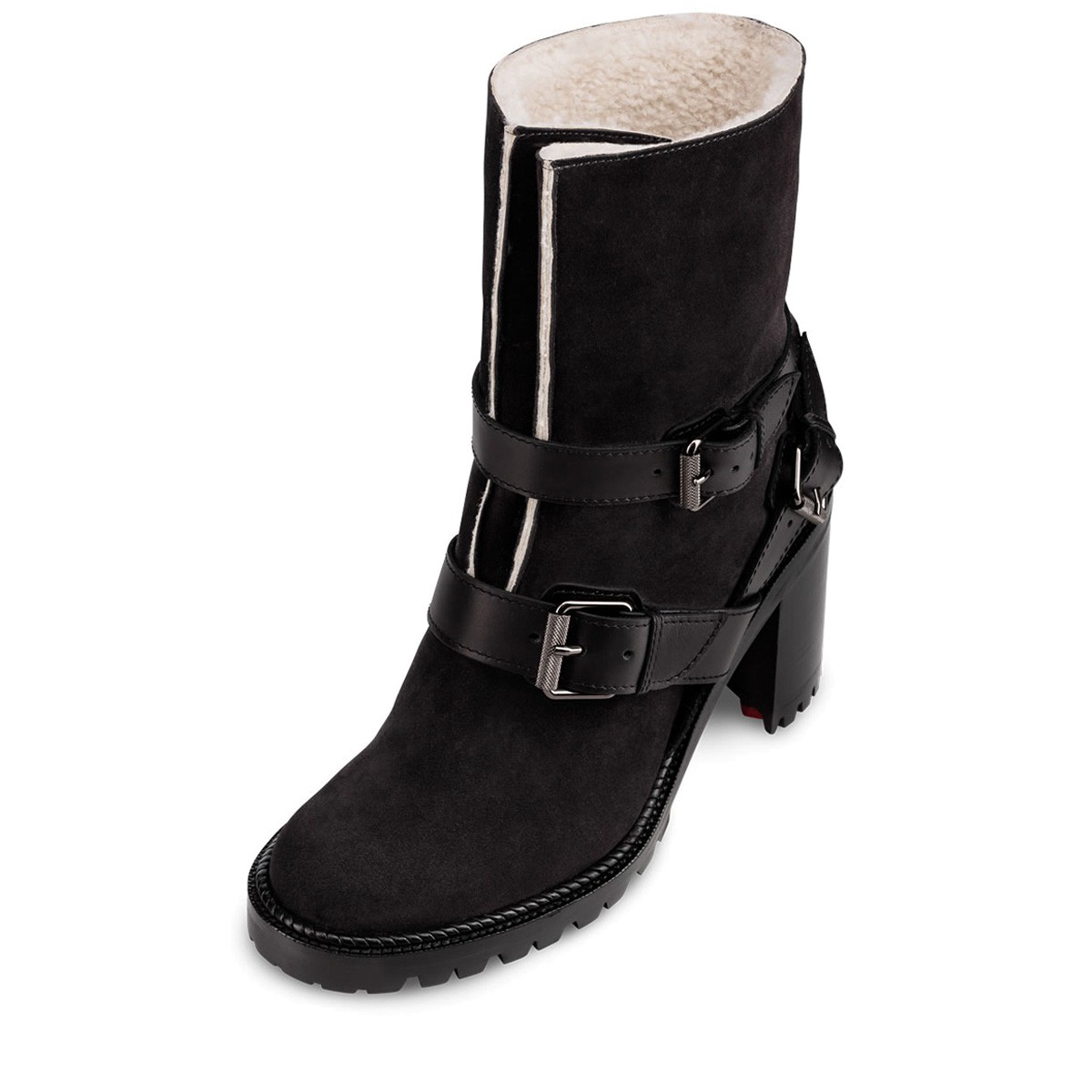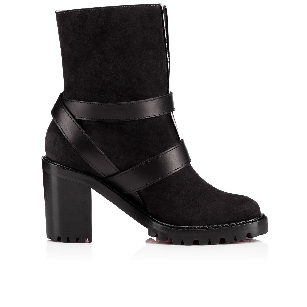 Run your world in “Viyonce”. This casual city boot in charbon suede and black leather features three converging striated buckle straps anchoring the V-front folds. Standing on a rubber lug sole base with a 70mm stacked heel, she is fully lined in cozy lambs wool.