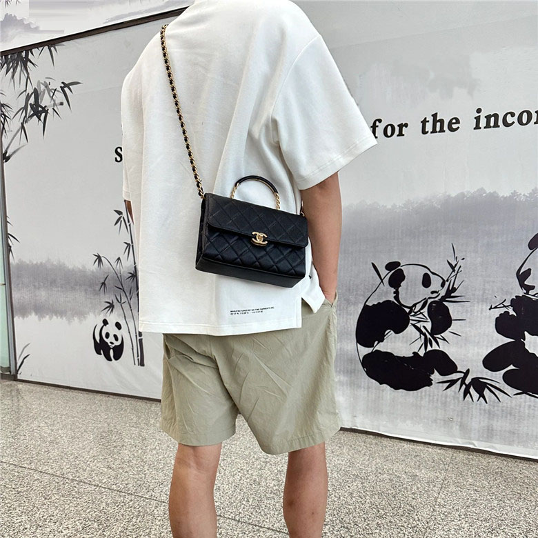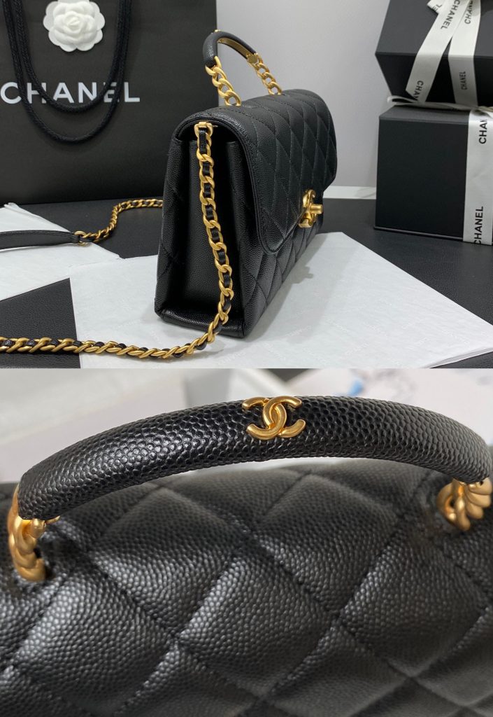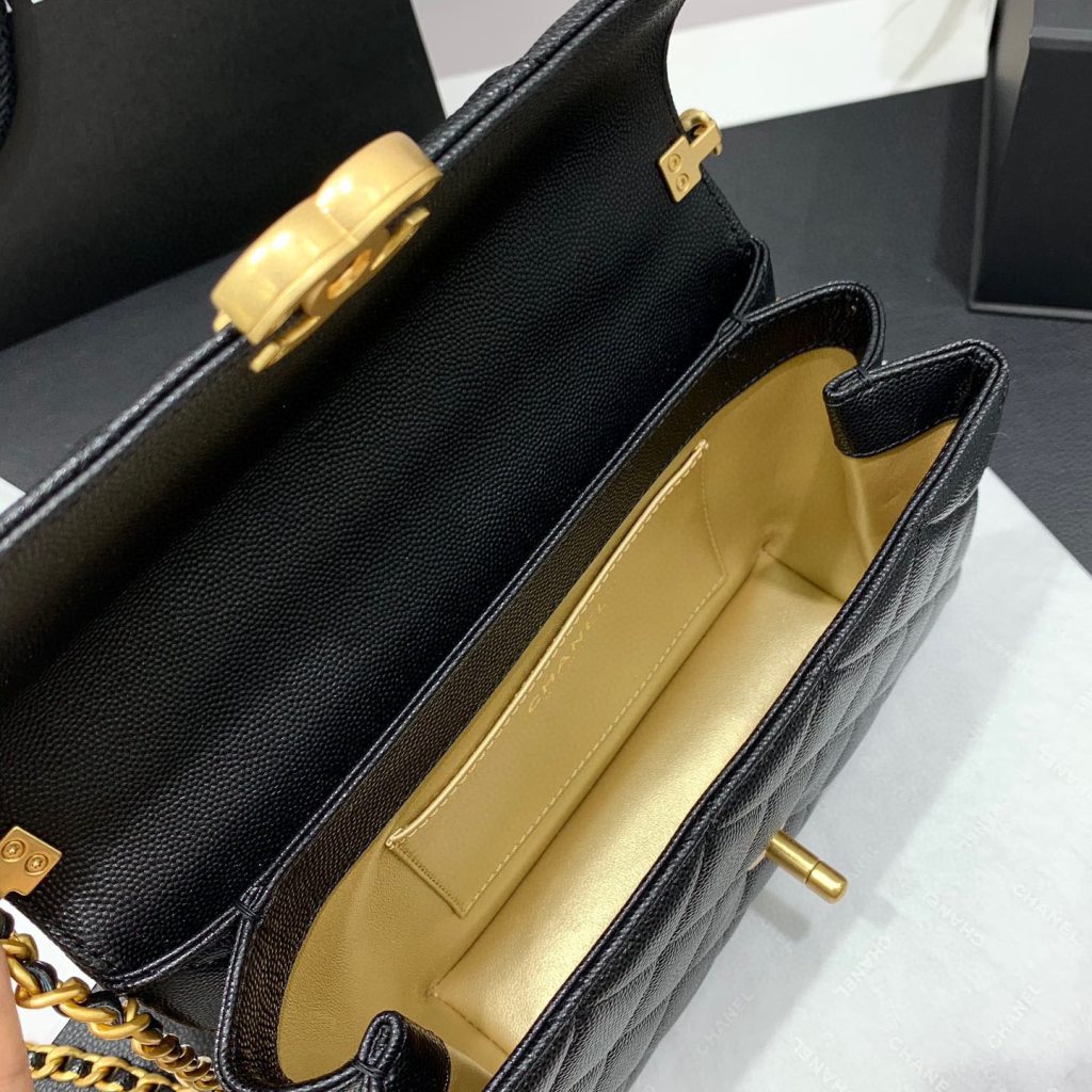 Its hardware is made of old hardware, I took some details of the hardware, you can have a look. It was perfect! The hardware is relatively heavy and has a sense of proportion, not the kind of plastic like fluttering feeling, its color is very positive, not the kind of bright color that looks very superficial gold, nor the kind of very dull and dumb color. The color is just right, especially when paired with the black lychee skin, which is very understated luxury. Its handle is a metal splice leather design with a small Chanel Logo on the very top of the handle. This logo is very small, but the workmanship is also very exquisite. When I received this bag, all its hardware was wrapped in film, and SA packed it very carefully.