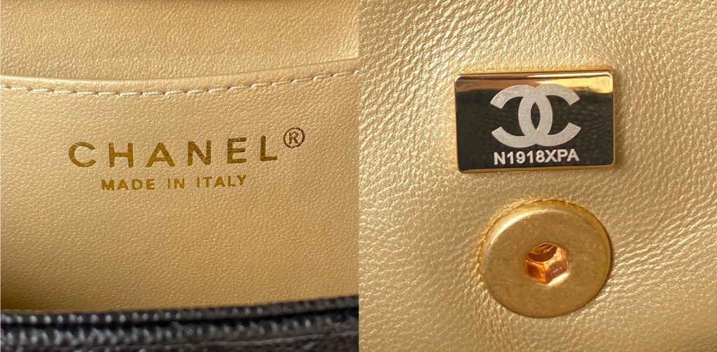 The Interior of my Replica Chanel Carry me (color Black with Gold hardware) is light gold leather, it is very resistant to dirt and wear. All the stitching positions are very smooth. There is an open pocket on the inside of the bag to put some cards. There are two Logos inside the bag. One is A hot printed Logo on the outside of the open pocket, the font of this logo is very square and clear. I tried to use my hand to scape, very firm, general use is not easy to fade or wear; The other logo is opposite the ironing Logo, that is, above the bag suction button, is a hardware Logo, there is a Chanel + Series No, both are very clear.